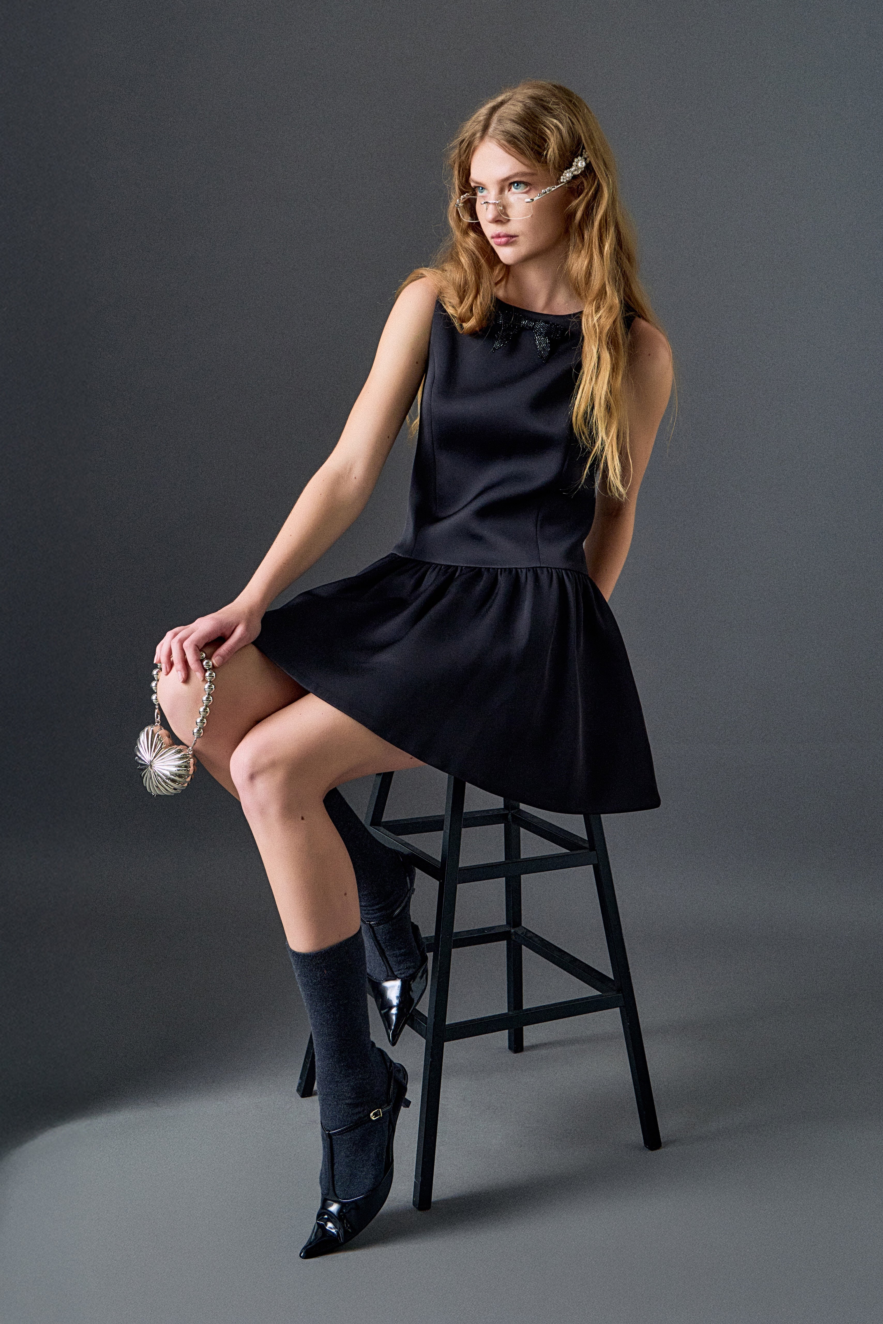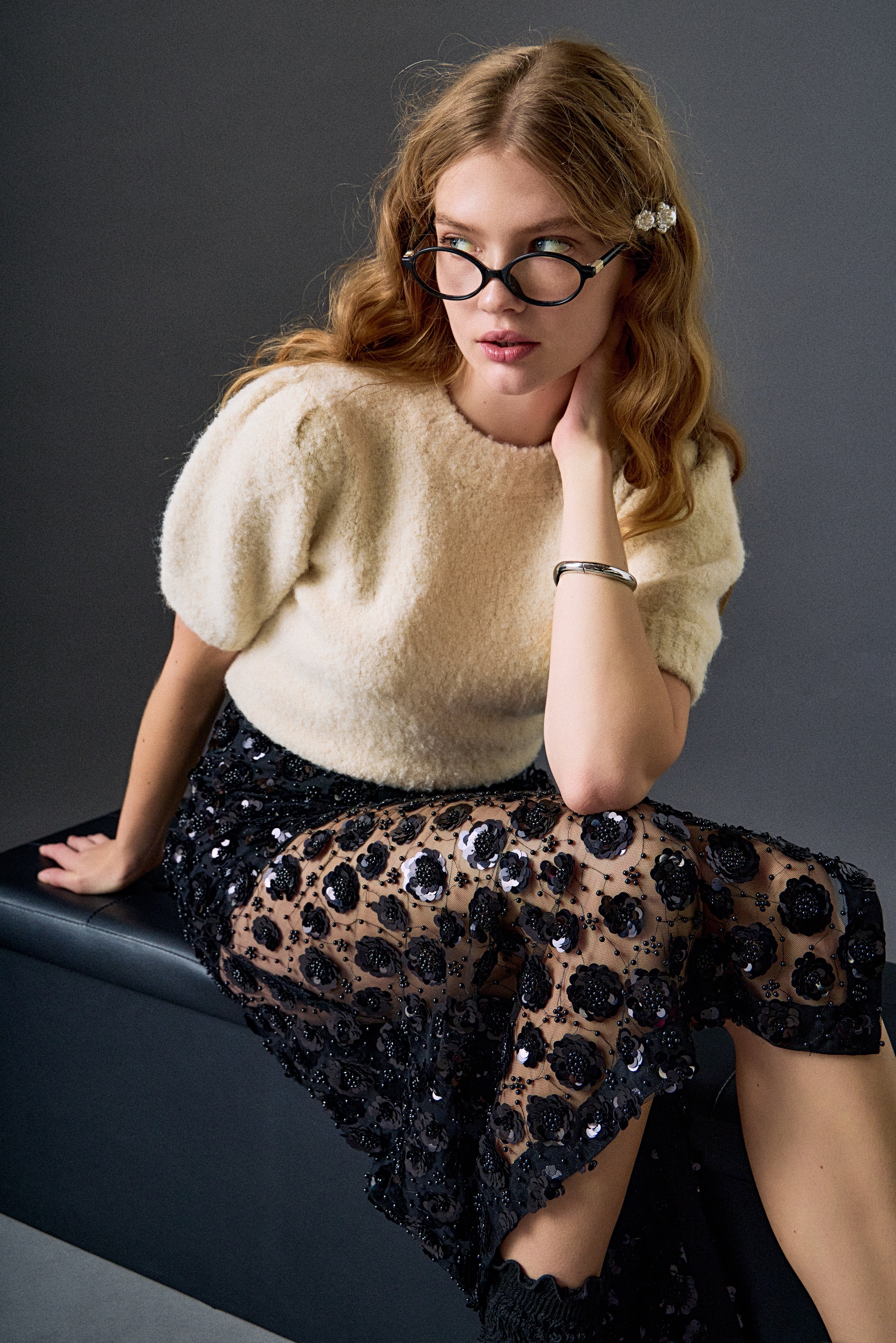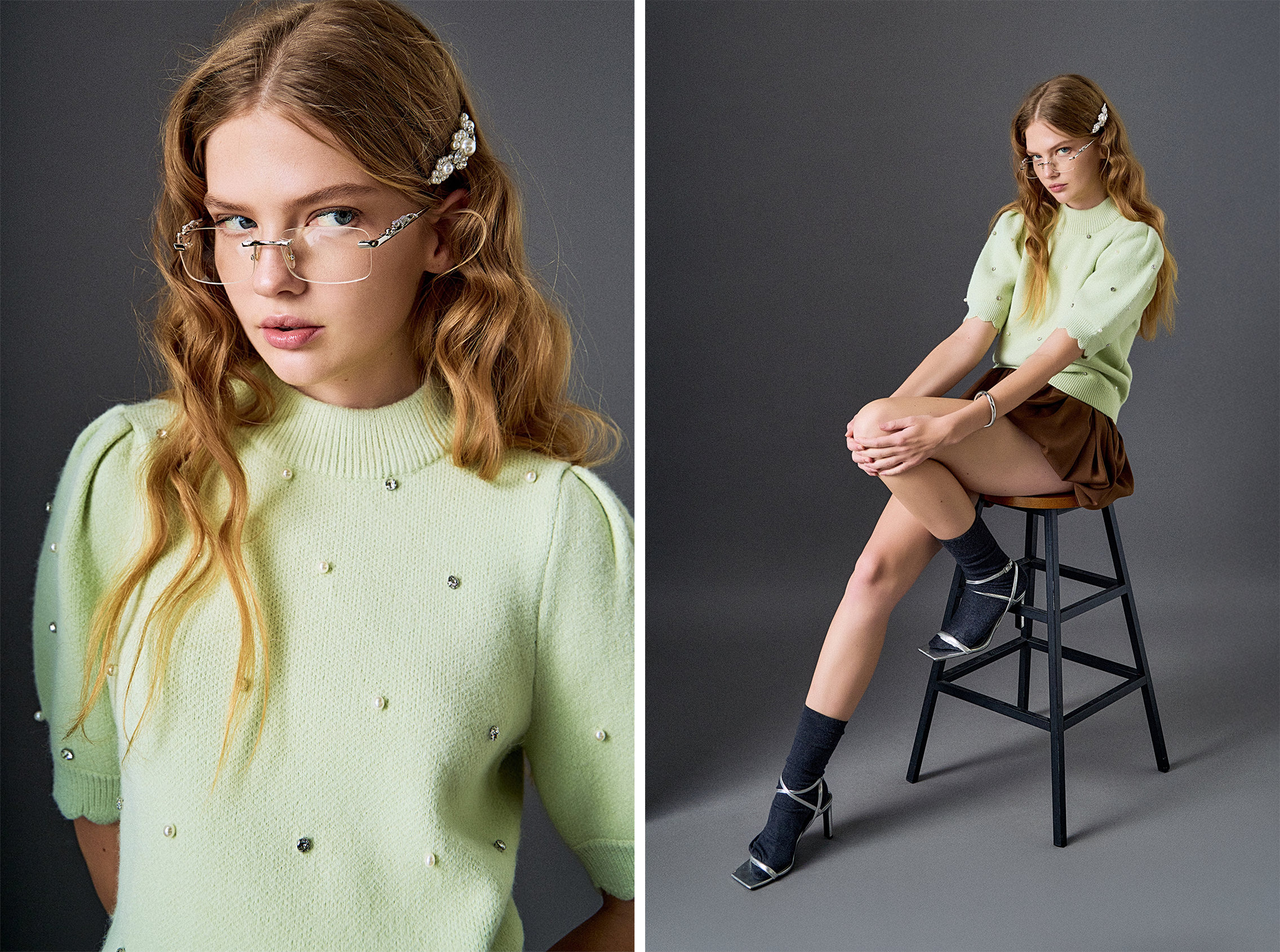 A statement sweater adorned with pearl and rhinestone details, finished with short scalloped sleeves for a feminine touch. Designed to catch the light, it brings effortless sparkle and elevated texture to any look.