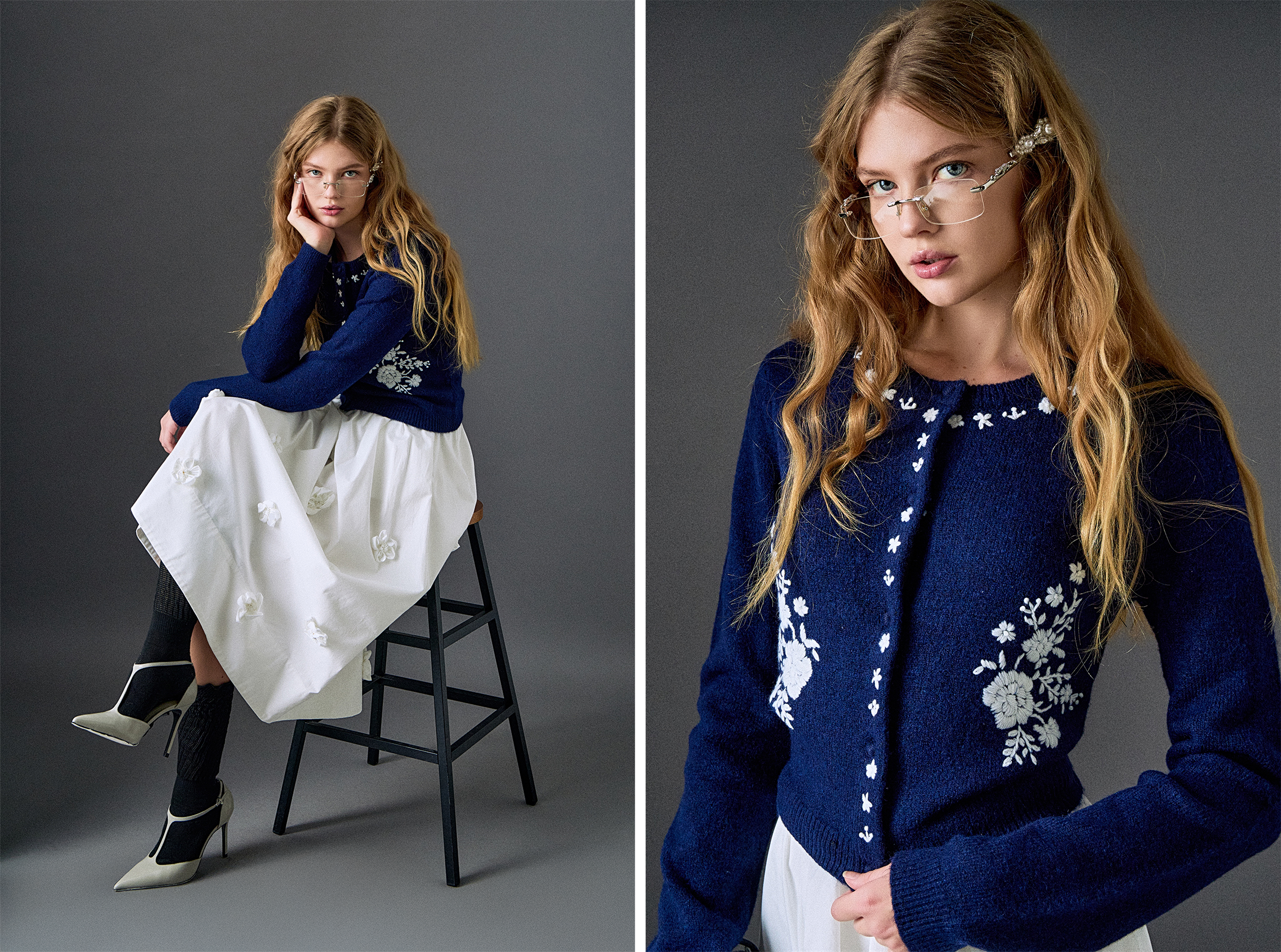 Soft florals come together effortlessly. An embroidered cardigan layered over a 3D floral midi skirt. Different textures, one cohesive look, designed to feel feminine, elevated, and easy to style for any occasion.