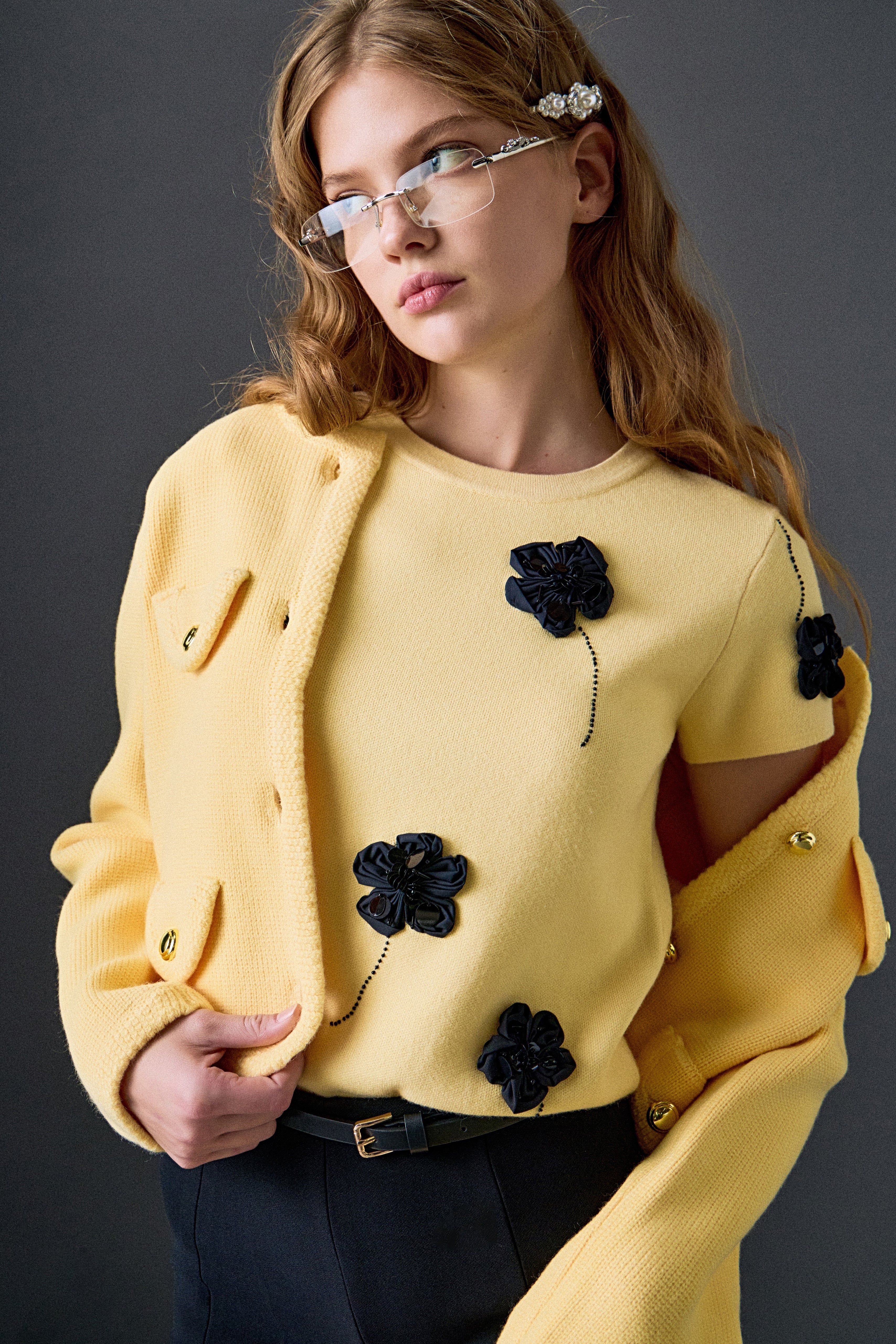 A classic cardigan elevated with delicate pearl and rhinestone details along the neckline. Soft, feminine, and effortlessly polished, it’s the kind of piece that adds a refined touch to everyday looks or dresses up with ease.