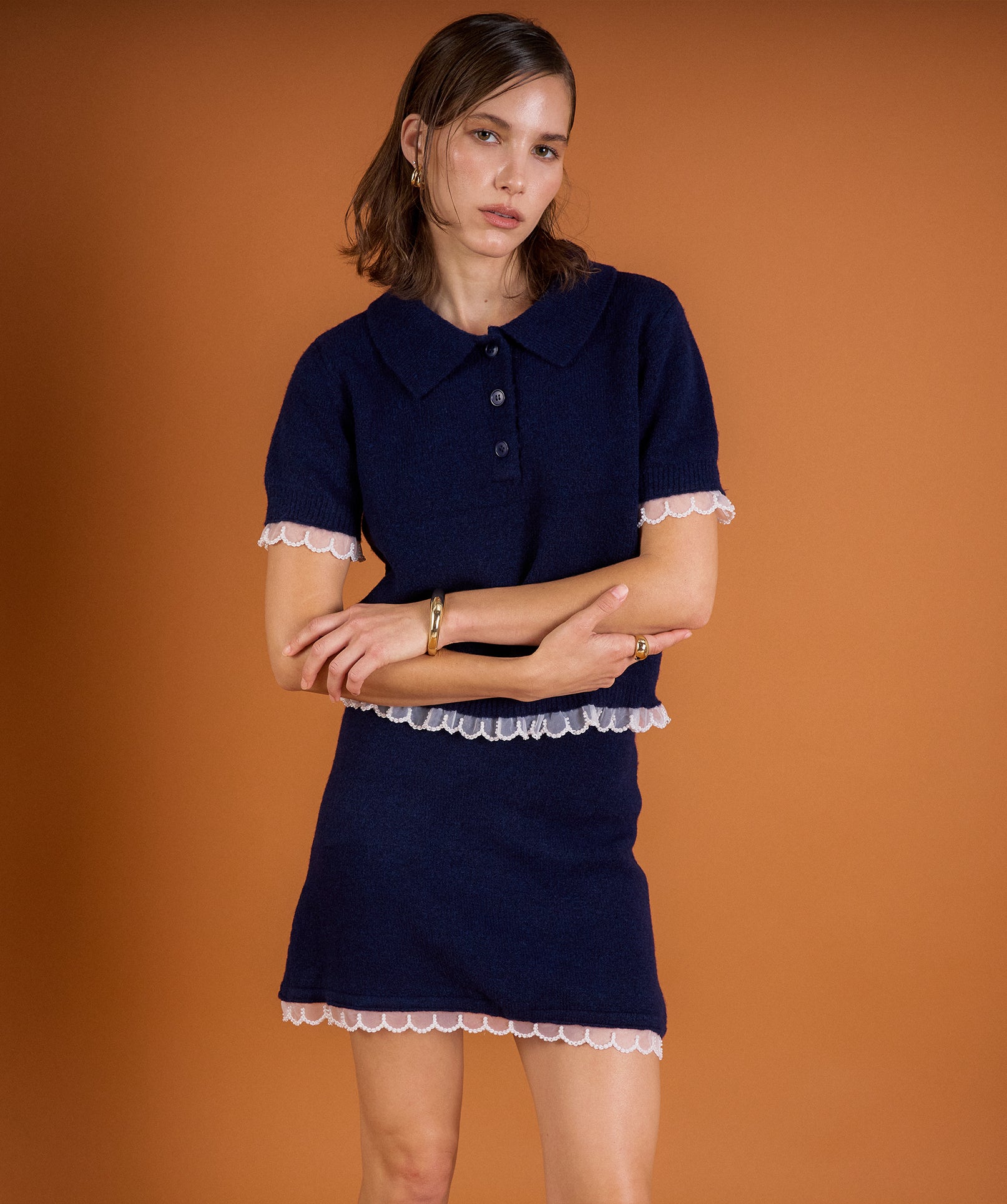 Soft, feminine, and effortlessly chic, this scallop-detailed knit set brings a touch of charm to everyday outfits. The knit top, with its classic collar, short sleeves, and delicate scalloped trim, pairs perfectly with the matching mini skirt, where scallop detailing along the hem adds subtle, playful elegance. Worn together for a coordinated look or mixed with other pieces, this set makes everyday dressing feel thoughtfully styled and effortlessly polished.