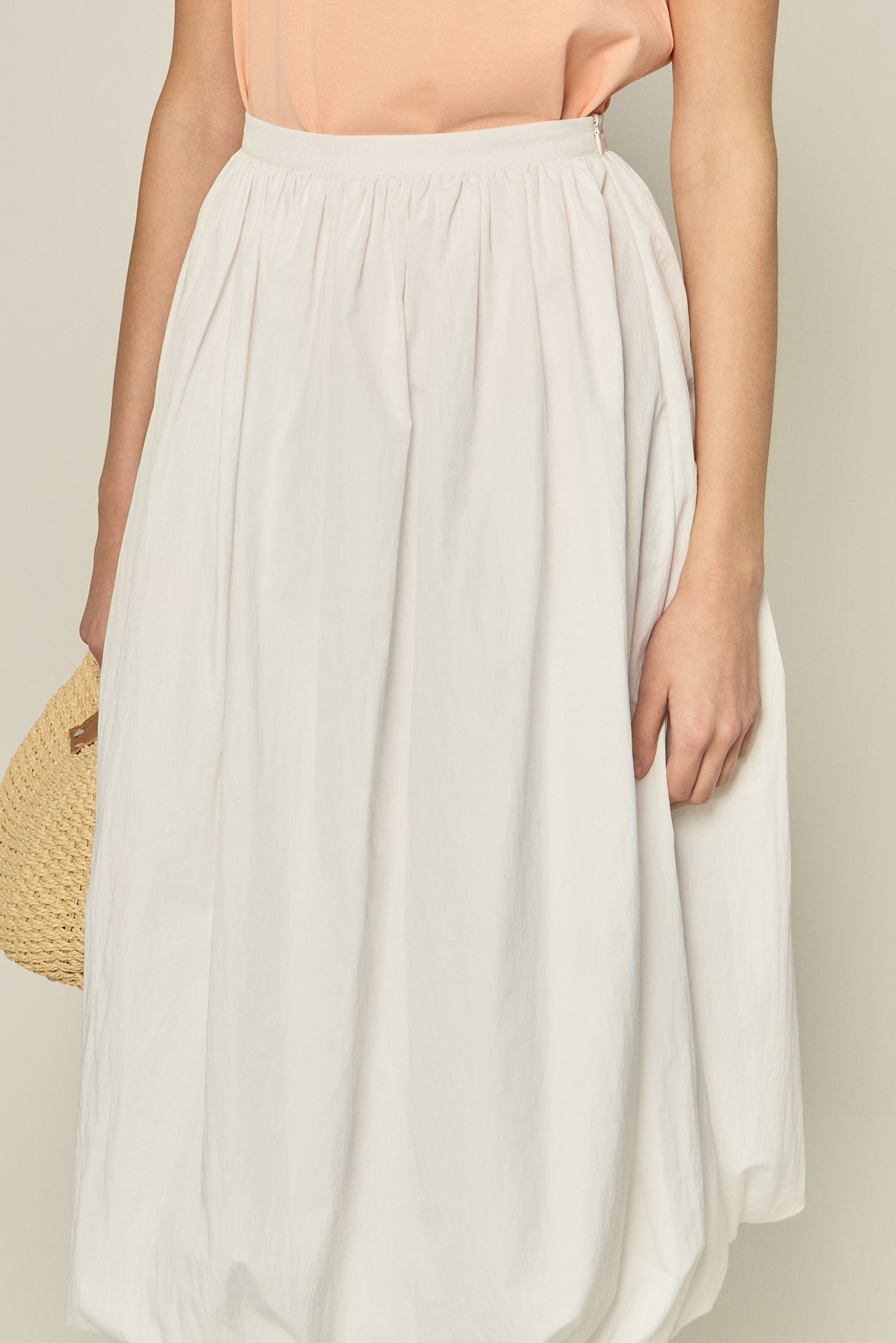 Add volume to your look with our Balloon Midi Skirt. This airy, elegant skirt features soft shirring and a voluminous balloon hem that creates a sculptural yet lightweight silhouette. The elastic waistband offers a comfy, pull-on fit, while elastic at the hem helps maintain that signature rounded shape. From casual days to elevated evenings, this piece is effortlessly versatile and undeniably chic.