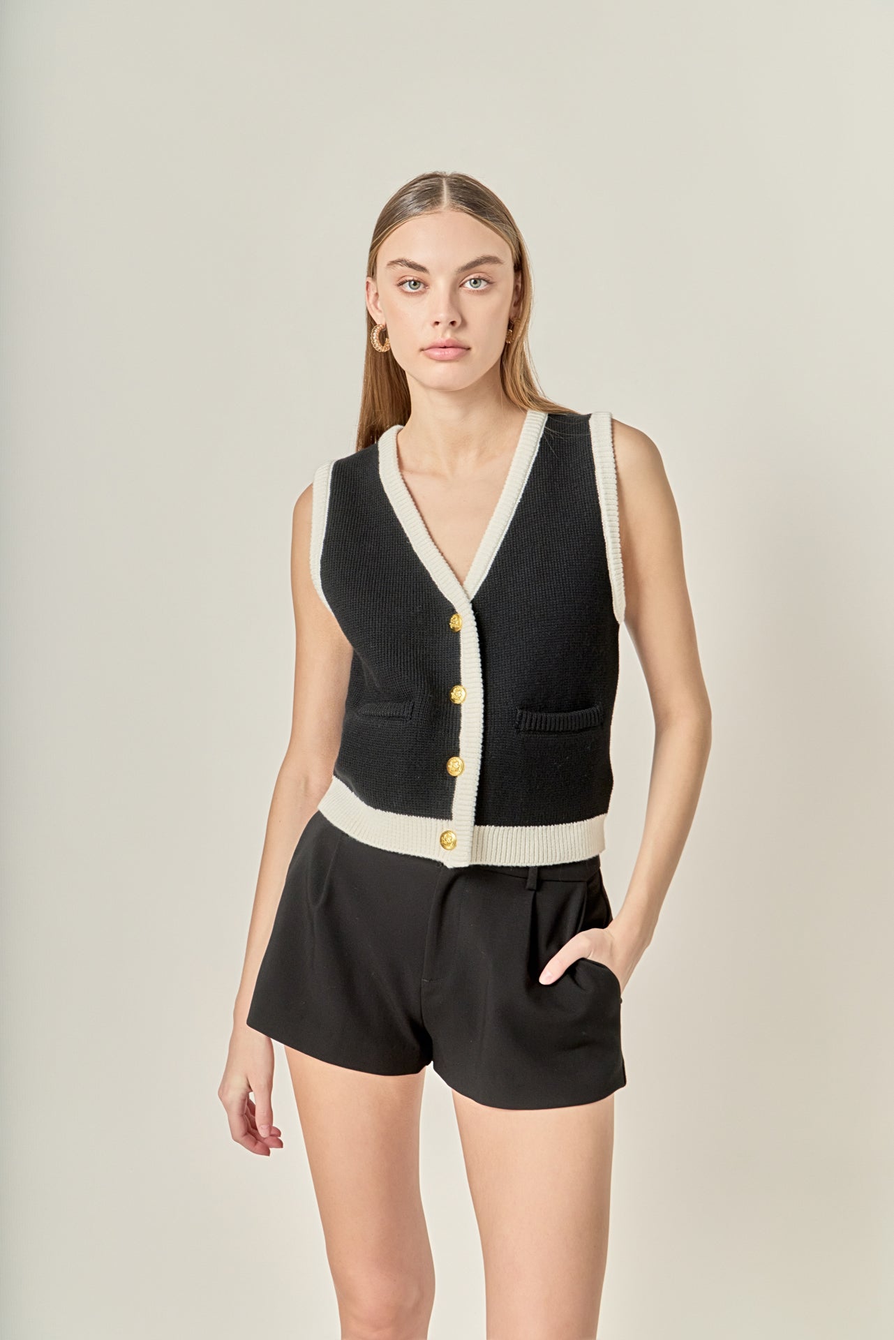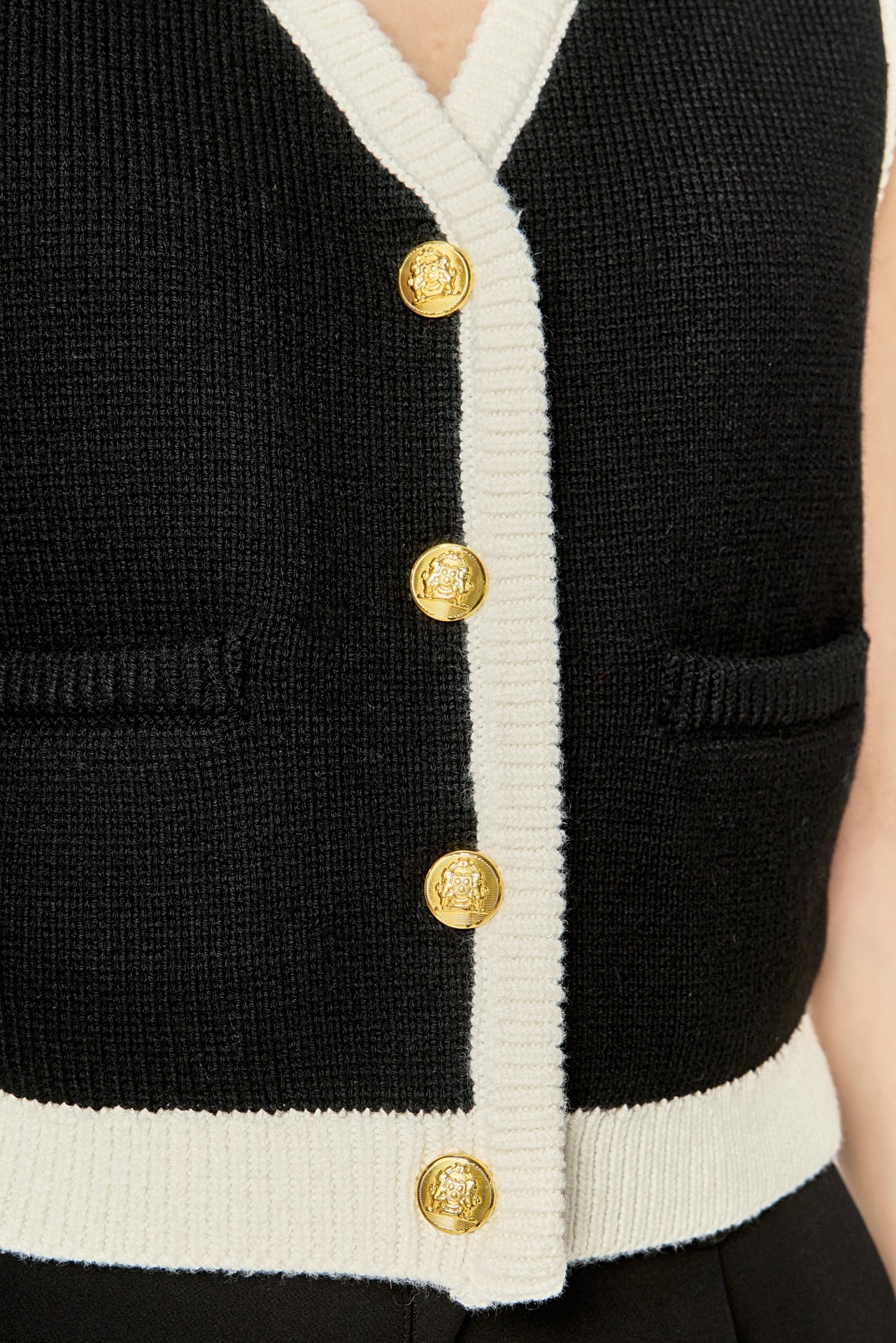 Effortlessly chic, the Linda Black and White Knit Vest is a versatile staple for your wardrobe. Featuring a flattering V-neckline and gold button closure, this sleeveless design is perfect for layering over your favorite blouses or wearing on its own for a polished, minimalist look. Crafted from comfortable knit fabric, the contrasting black and white details add a timeless, sophisticated touch. Ideal for business-casual settings, lunch dates, or everyday wear, this vest seamlessly transitions from work to weekend. Elevate your style with the Linda Knit Vest.