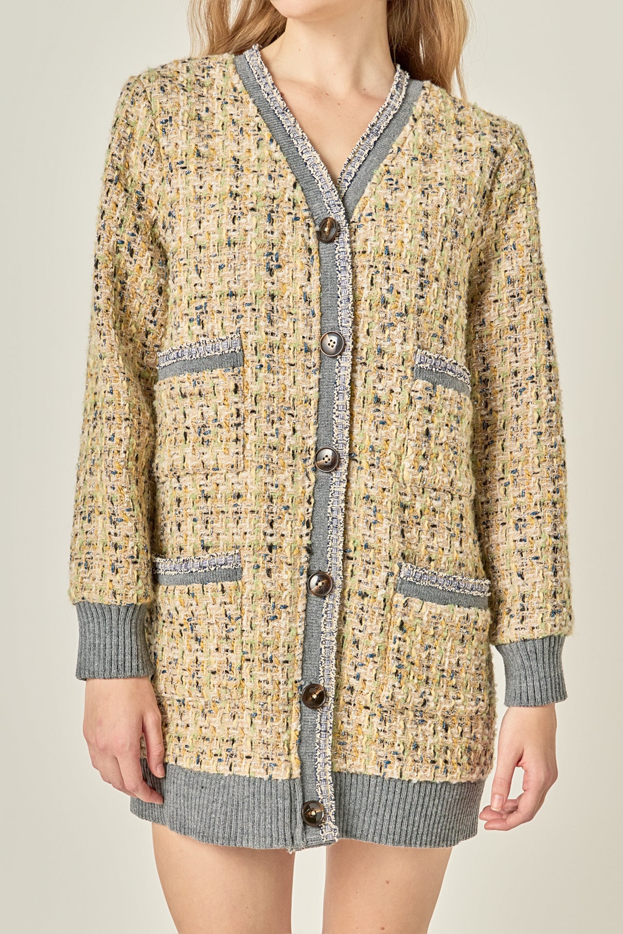 Check out our Boucle Coat With Trim to add a touch of edge and style to your wardrobe! Featuring a boxy fit V-neck bold trim and dropped shoulder design this coat is a must-have for any fashion-forward individual. Our unique patter and materials make this piece an absolute showstopper. Get yours today and stay ahead of the fashion game!