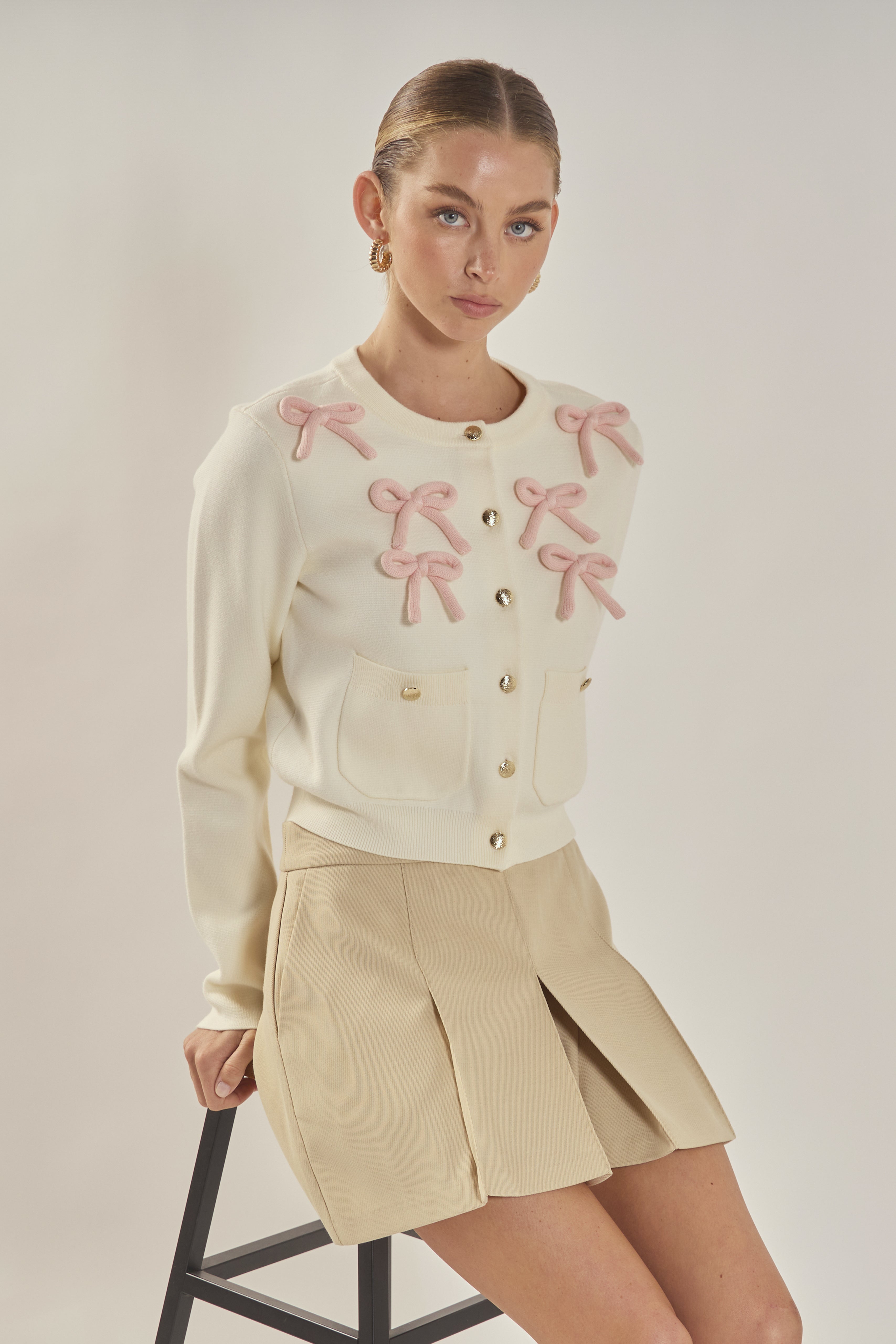 Elevate your wardrobe with our chic Bow Cardigan. This versatile piece features a classic round neckline and long sleeves, perfect for transitioning from day to night. The charming bow detail adds a touch of femininity, while the functional welt pockets provide both style and practicality. It's the statement piece your wardrobe needs!