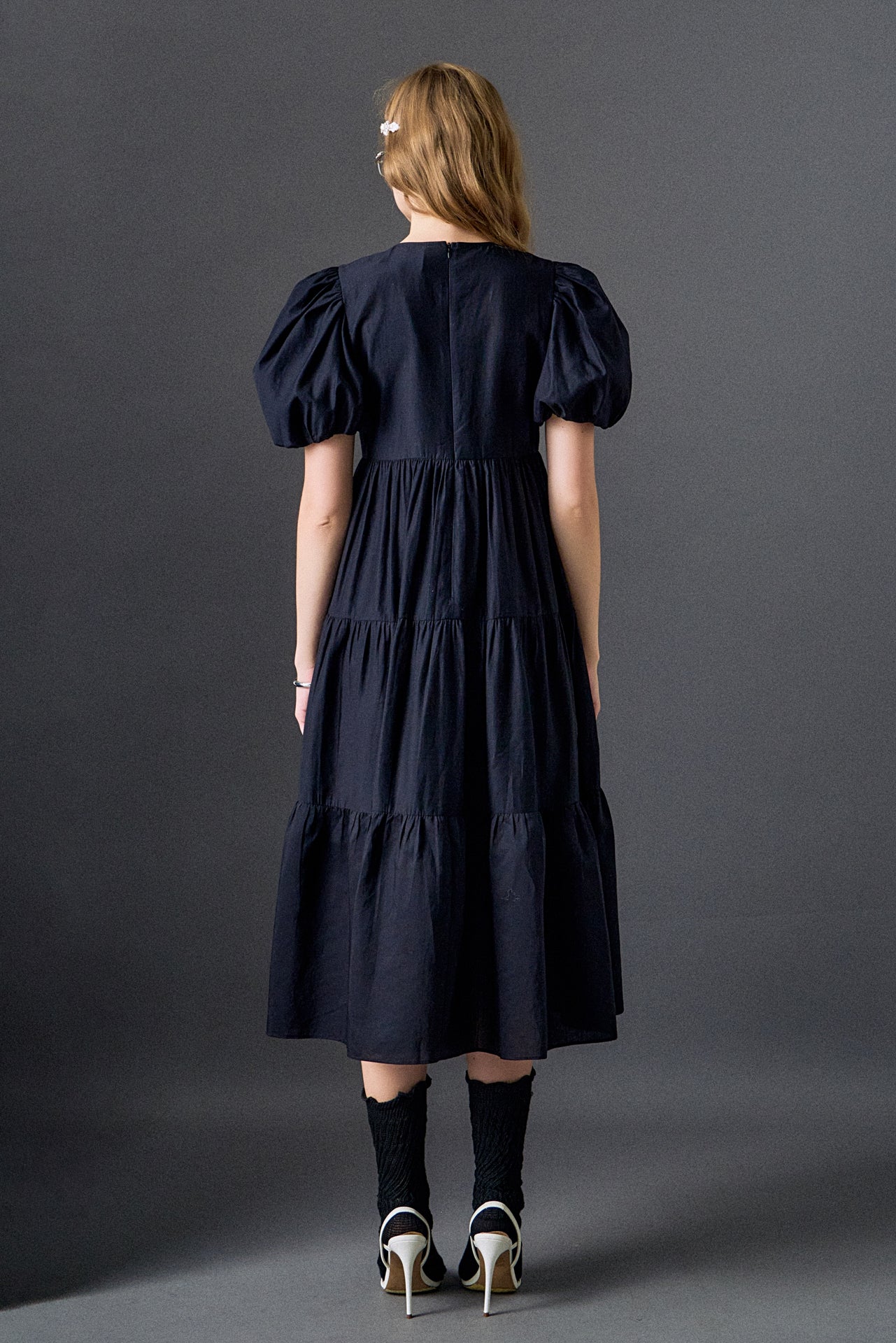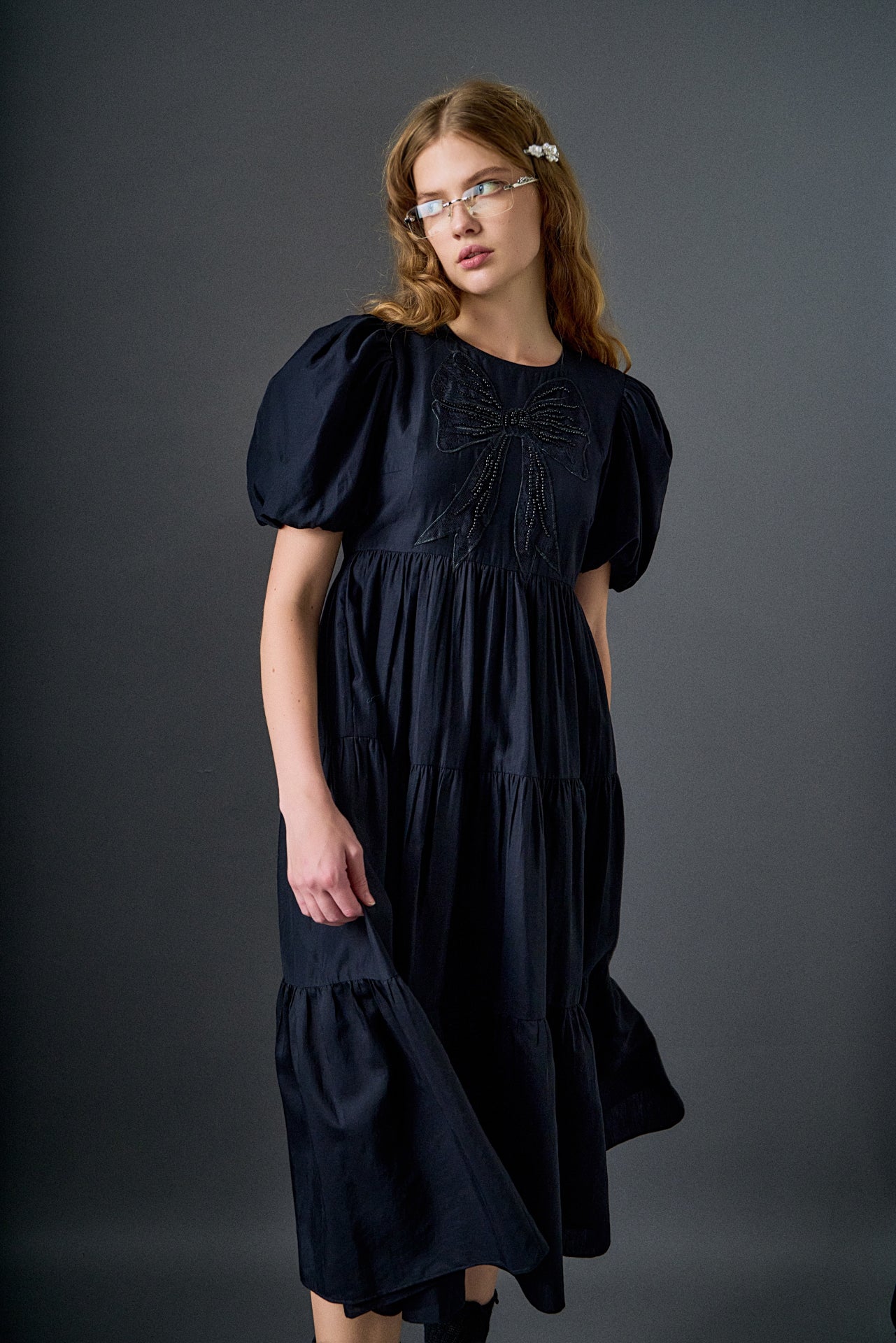 Add a touch of charm to your wardrobe with our Bow Puff Sleeve Midi Dress, featuring a beautifully detailed beaded bow at the chest that instantly draws the eye. The soft, voluminous puff sleeves and relaxed tiered silhouette create a romantic, vintage-inspired feel, while the lightweight woven fabric offers effortless movement and comfort. Feminine, elevated, and full of personality, this dress is the perfect statement piece for any occasion—bringing the bow trend to life in the most sophisticated way.