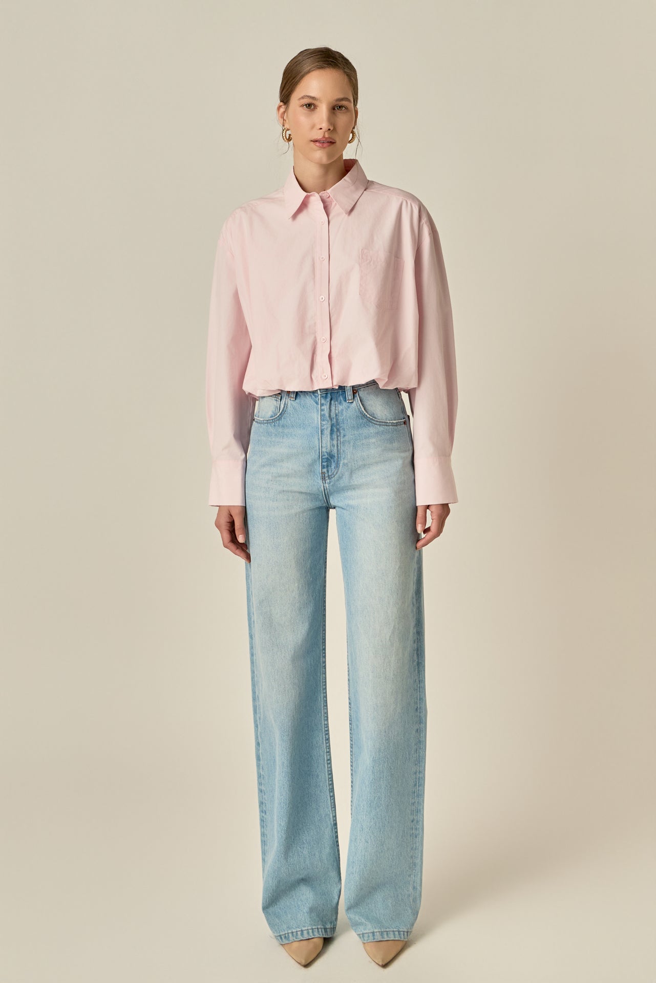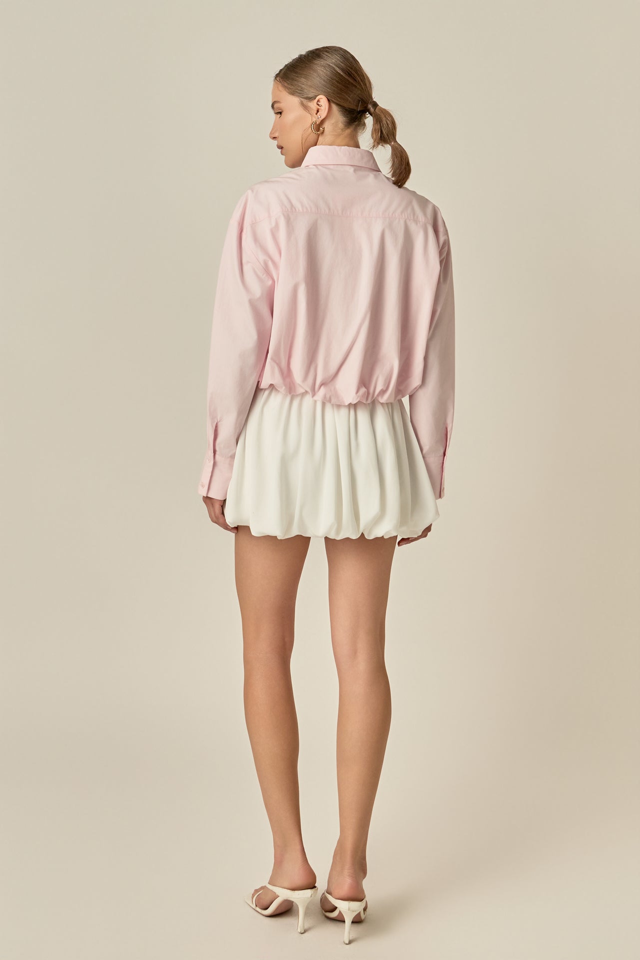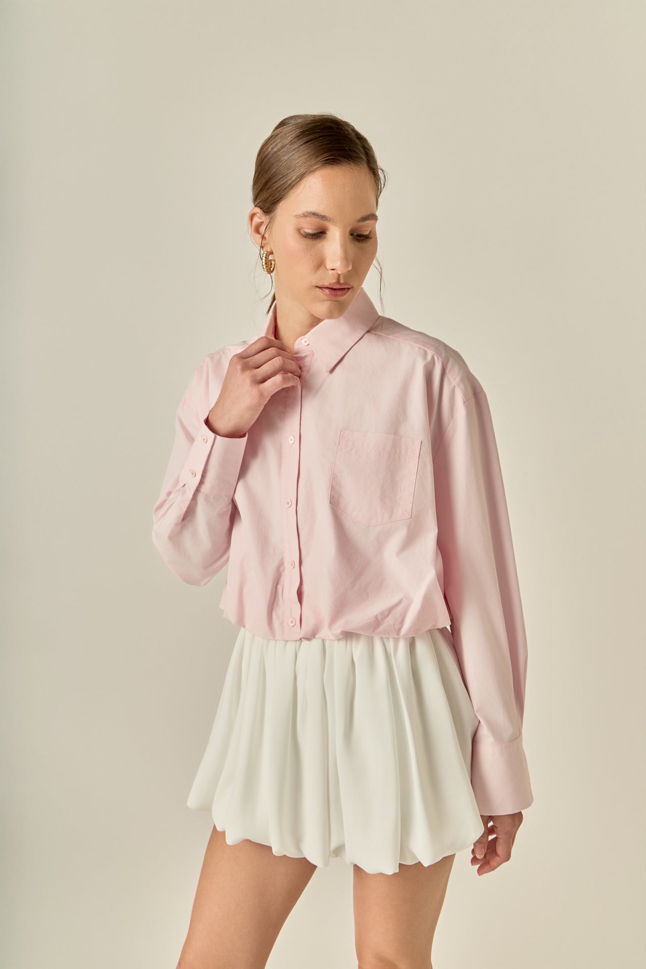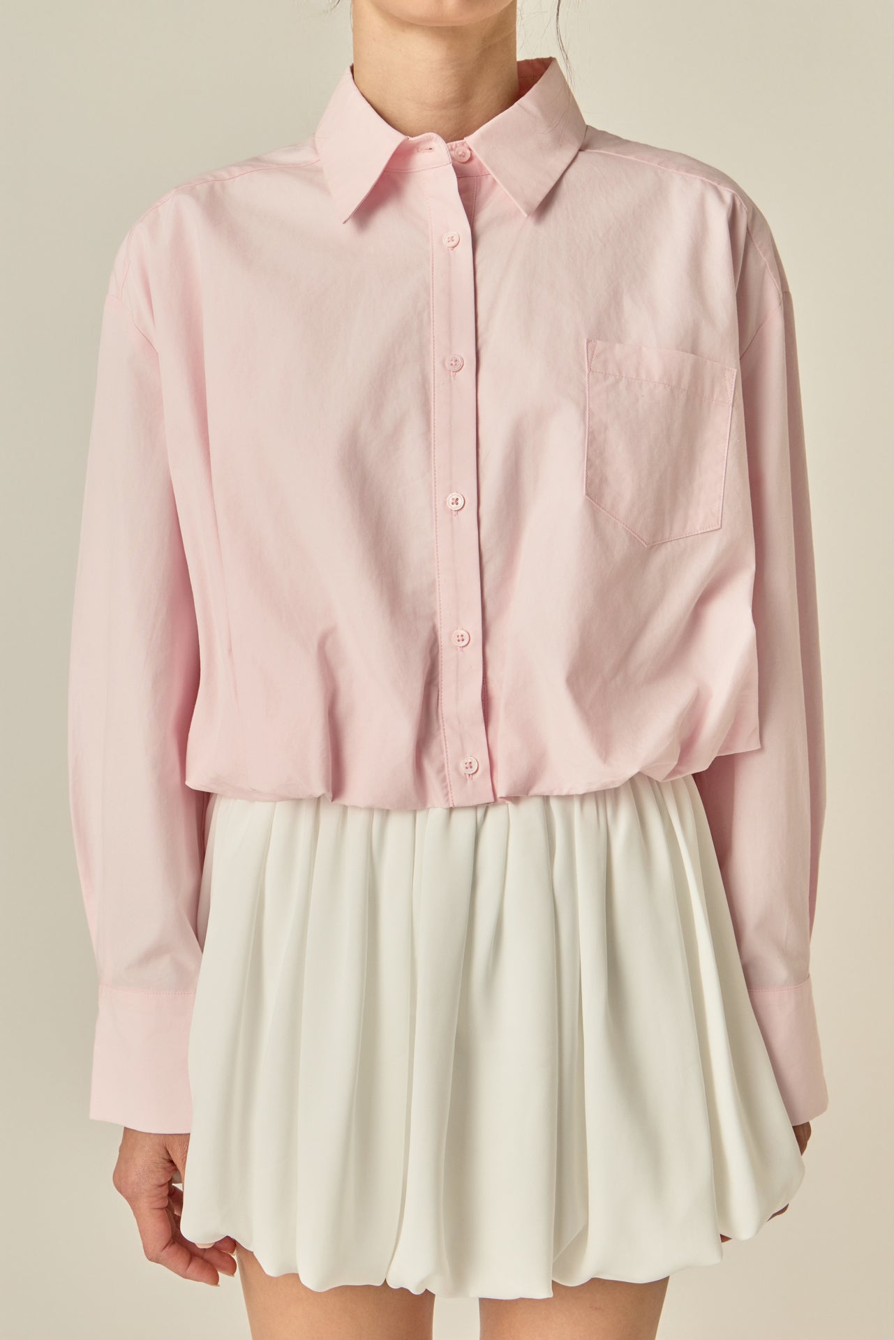 Refined with a modern twist, this long sleeve shirt features a softly structured bubble hem that adds subtle volume and shape. Designed with a classic collar and button front, it balances tailored elements with a relaxed, slightly oversized fit. The lightweight fabric offers all-day comfort, while the elasticized hem enhances the signature bubble silhouette. Polished yet easy to wear, it transitions effortlessly from everyday styling to more elevated looks.