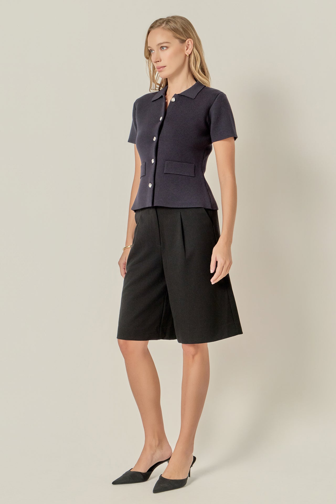 Stay chic and polished with our Gem Button Knit Top. Crafted from soft, textured knit fabric, this short-sleeve style features a collared neckline and statement crystal-style buttons down the front. The tailored fit and subtle pocket detailing give it a timeless, sophisticated look that can be dressed up or down. Lightweight yet structured, it’s the perfect piece to elevate your everyday wardrobe.