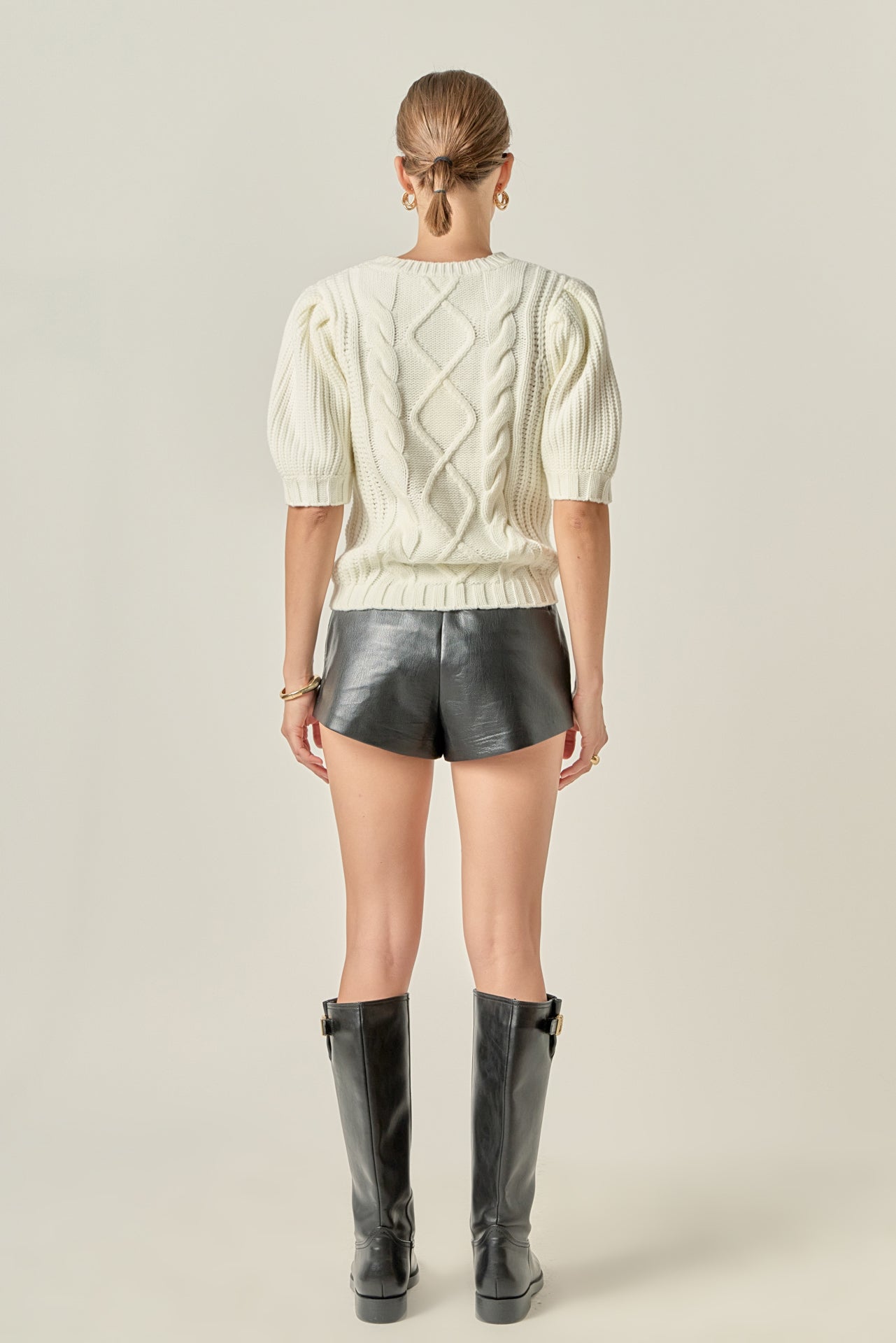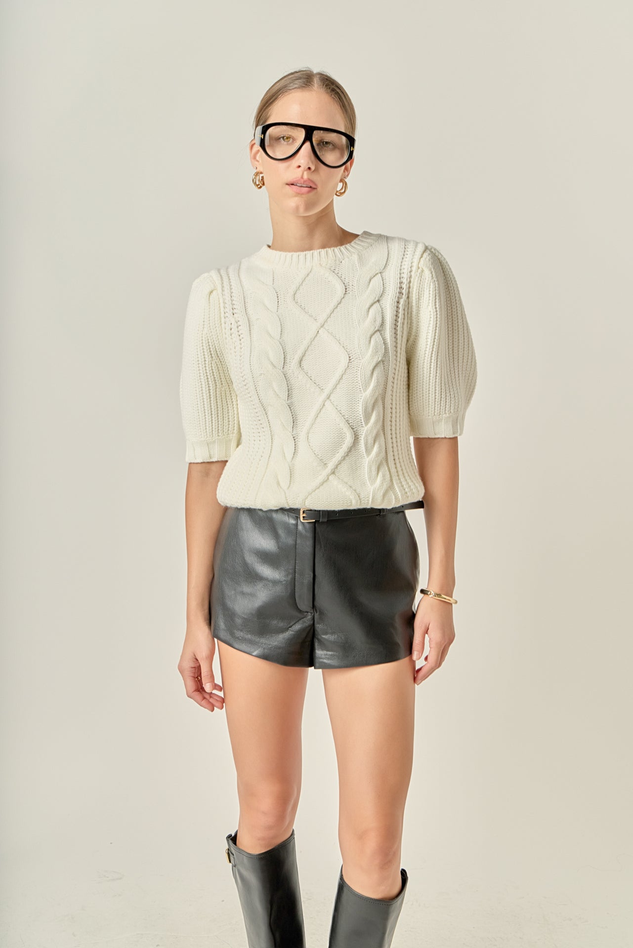 This Puff Sleeve Cable Knit Sweater is perfect for your winter wardrobe. Featuring a classic cable knit short puffy sleeves mock neck and ribbed hems this one-of-a-kind sweater adds a unique touch to any winter look. Our sweater is made from quality materials and designed with your comfort in mind. It's the perfect combination of fashion and function that will keep you cozy and stylish all winter long. Get your Cable Knit Puff Sleeve Sweater today and stay warm in style.