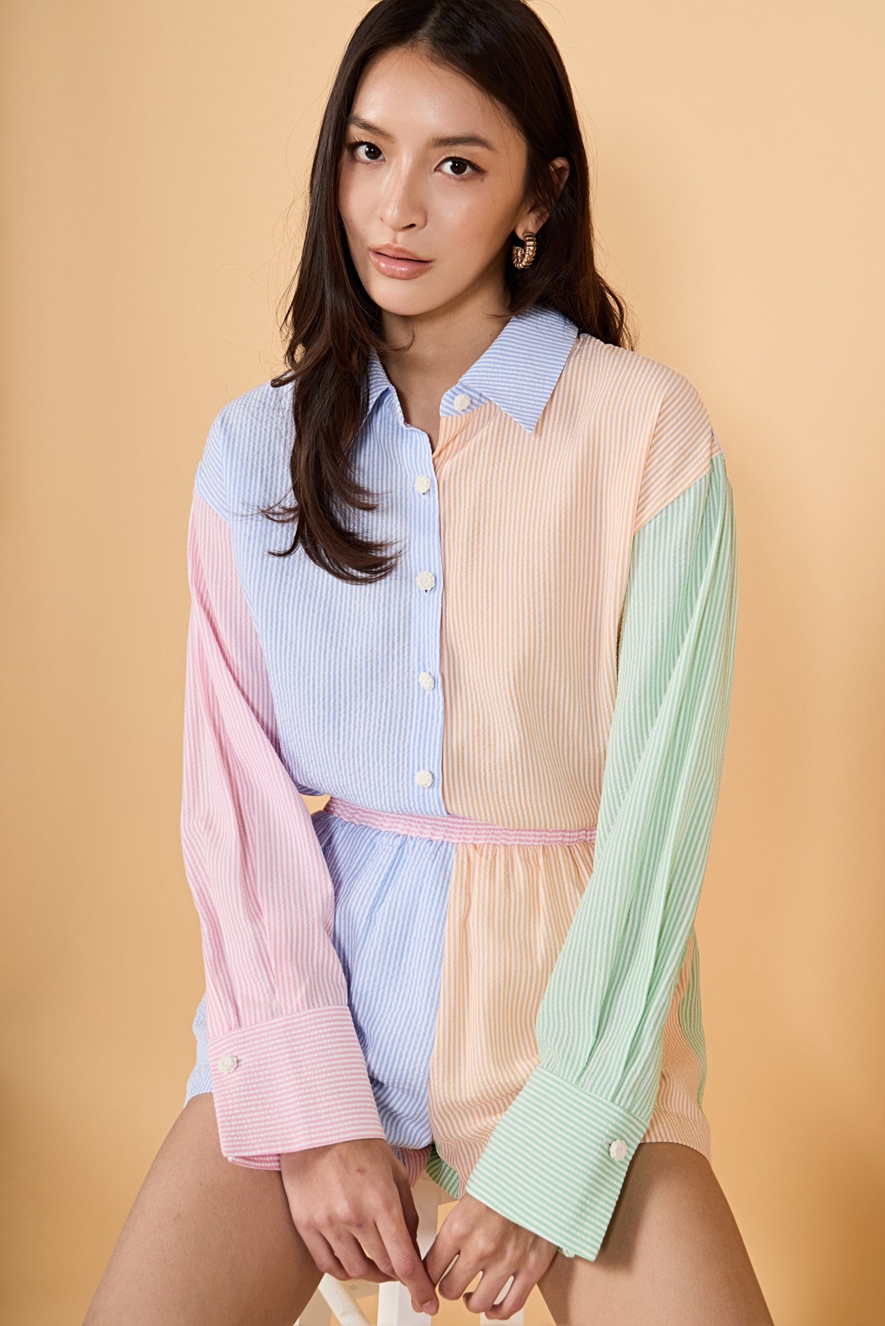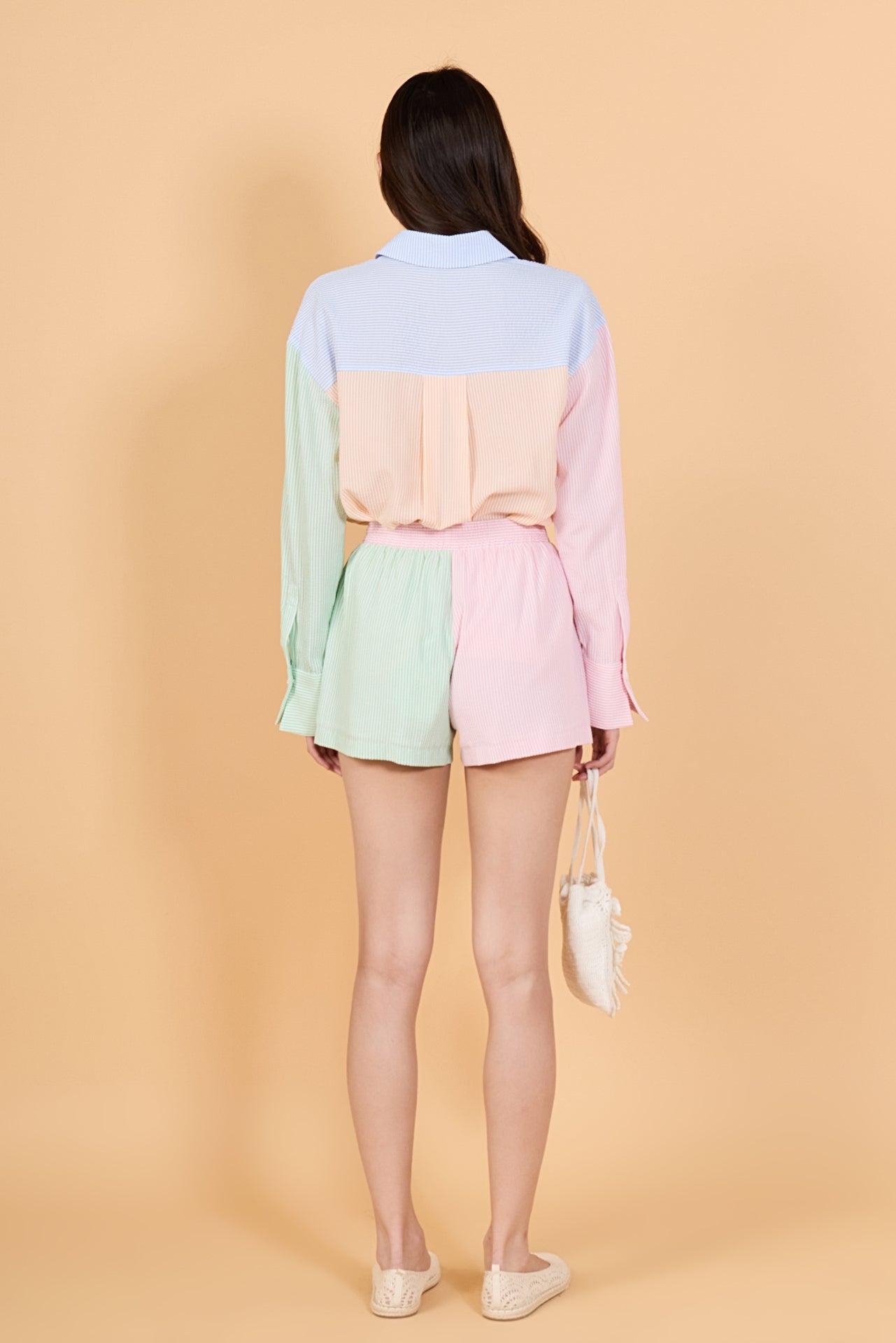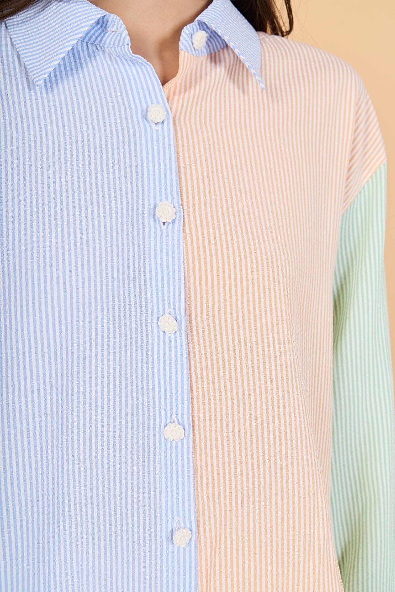 Playful yet polished, the Colorblock Seersucker Button-Down Shirt brings a fresh take to a classic silhouette. Designed with a relaxed, oversized fit, this shirt features mixed stripe panels for a bold colorblock effect that feels effortless and modern. Crafted from lightweight seersucker, it offers breathable comfort while maintaining structure. Finished with a crisp collar and button-front closure, this piece works just as well worn loose, half-tucked, or styled as a matching set.