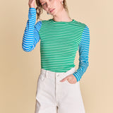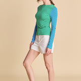Turn heads in our Bold Stripe Colorblock Tee- a playful take on the everyday essential. Designed with contrasting vibrant stripes, this long-sleeve top brings instant personality to your look. The fitted silhouette flatters your shape, while the classic crew neckline and stretch-knit fabric keep it effortlessly chic and comfortable. Whether paired with tailored shorts for daytime or layered under a blazer for a modern twist, this statement piece is made for the fashion-forward. Make your basics anything but basic- shop now and refresh your style with a bold pop of color.