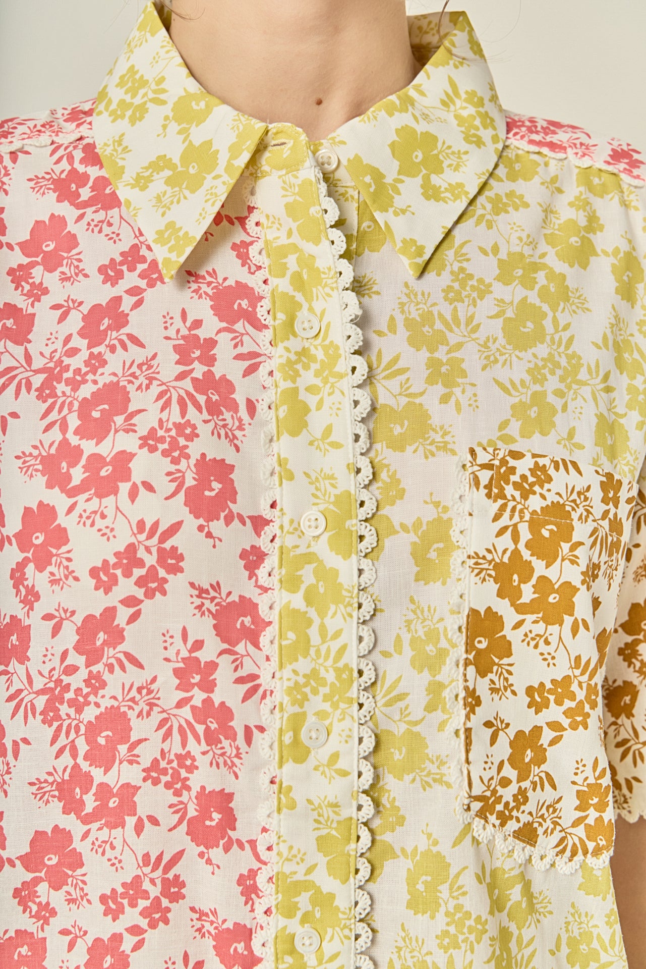 Complete the set with the Maisie Colorblock Button-Up Shirt - your go-to for playful polish. Designed with a patchwork floral print in soft, sun-washed hues, this top brings the charm with every detail. It features a relaxed fit, front pocket, and delicate crochet lace trim that adds a sweet, vintage-inspired touch. Whether you wear it as a matching set or style it solo, Maisie is made to brighten your day - effortlessly cute, endlessly wearable.