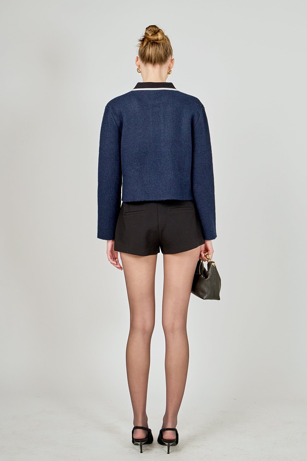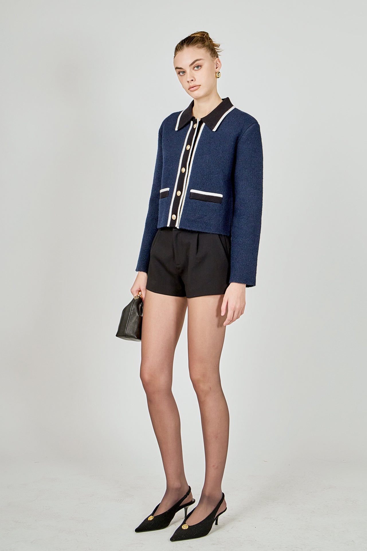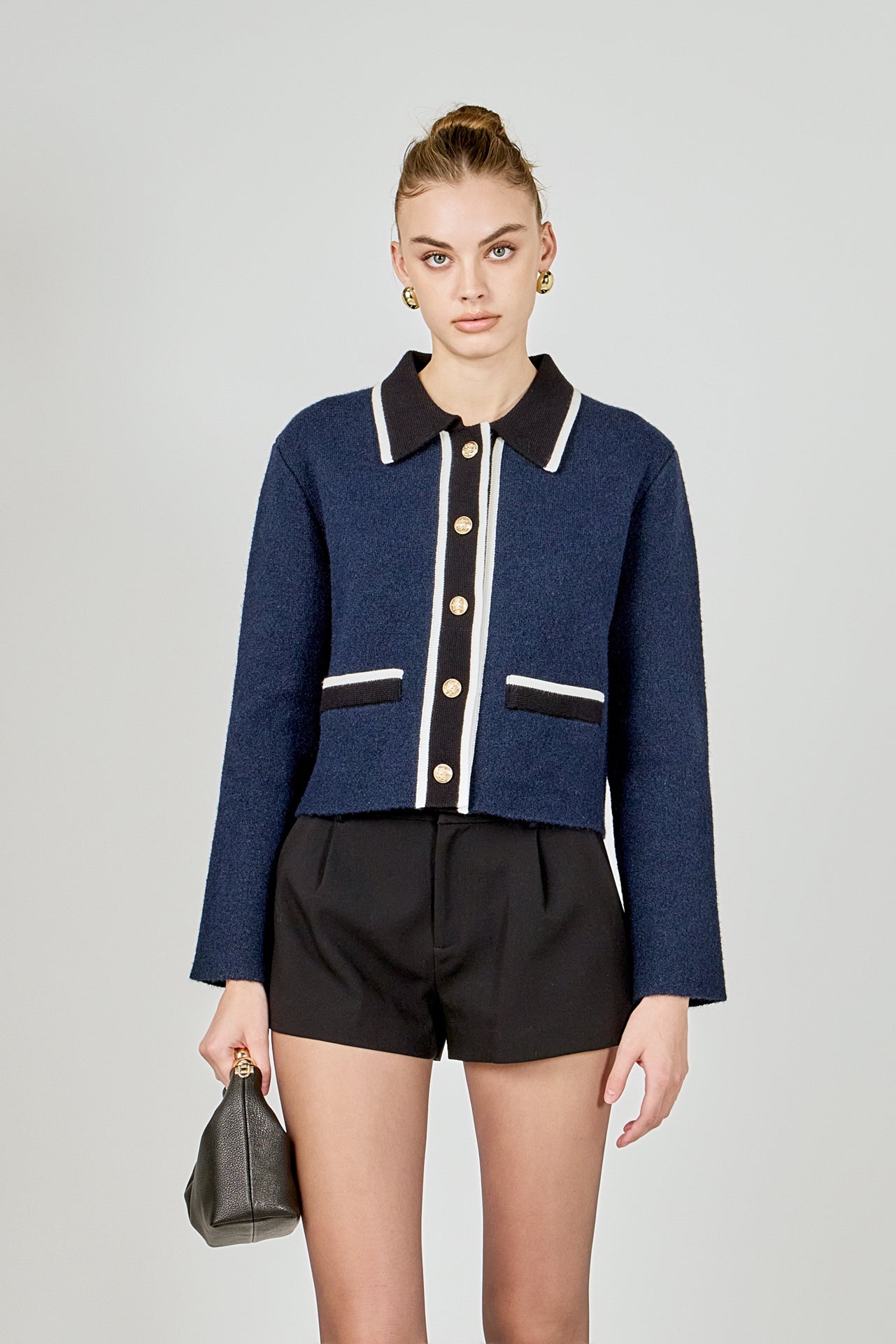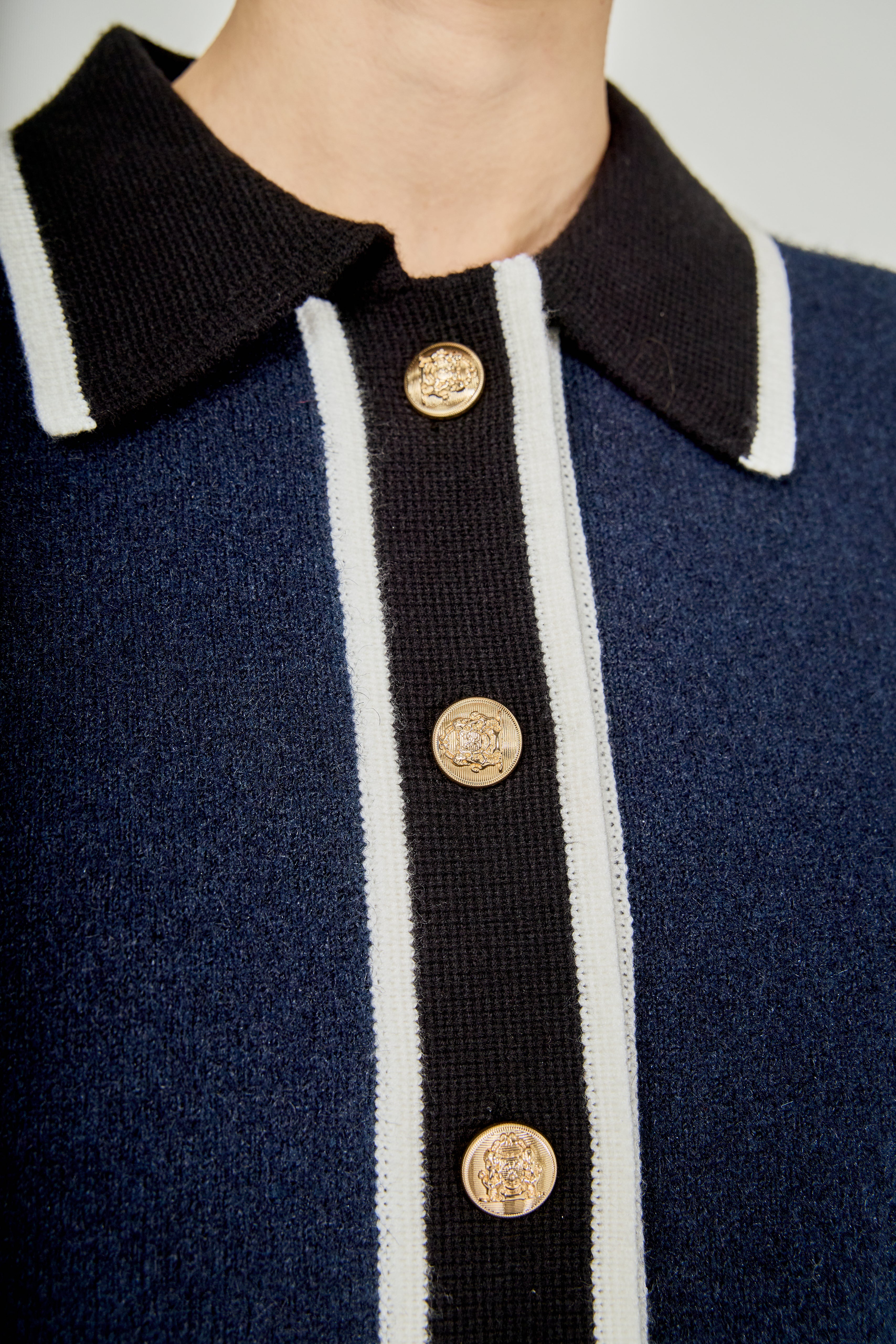 Crafted in a soft, textured knit, this cardigan features a sharp contrast placket and polished gold buttons that lift the overall look. The relaxed shape and full-length sleeves offer comfort without sacrificing style, making it an ideal layering piece for cooler days. Pair it with skirts, denim, or trousers for a clean, timeless outfit.
