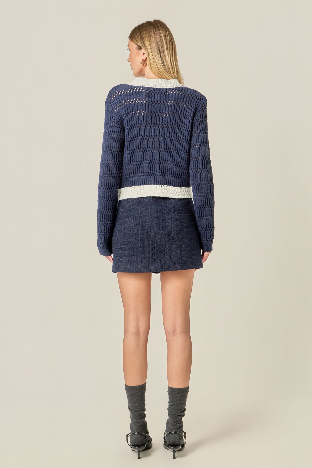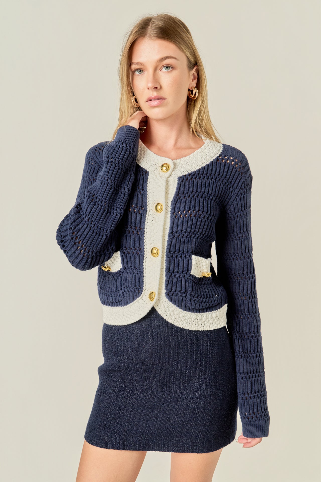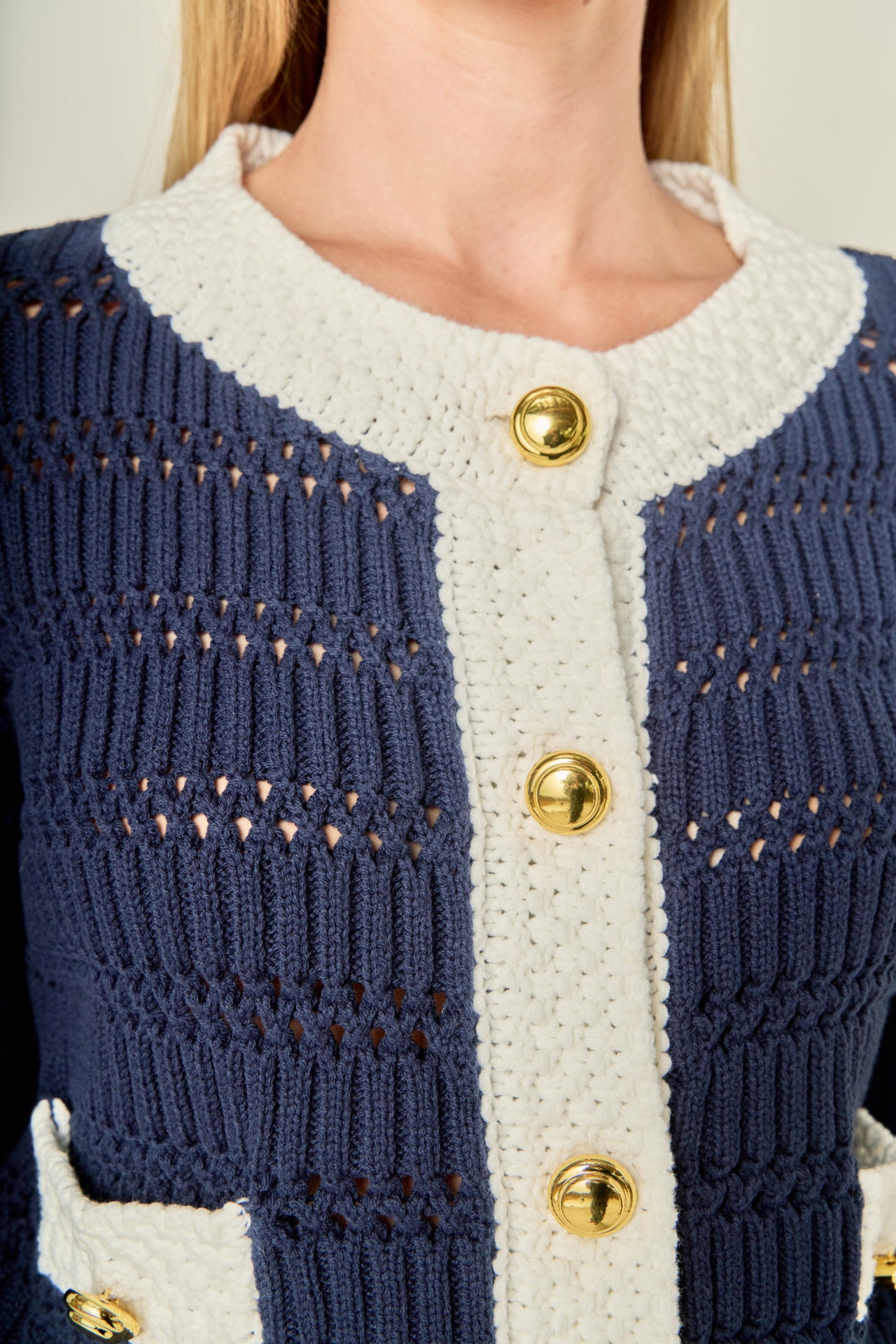 Classic meets contemporary in our Contrast Round Hem Cardigan. This standout knit features a timeless round neckline, long sleeves, and a flattering cropped silhouette. Designed with textured stitching and bold contrast trim, it finished with luxe gold-tone buttons for a polished look. Whether layered over a sleek tank or styled solo, this cardigan brings instant sophistication with a modern twist to any outfit.