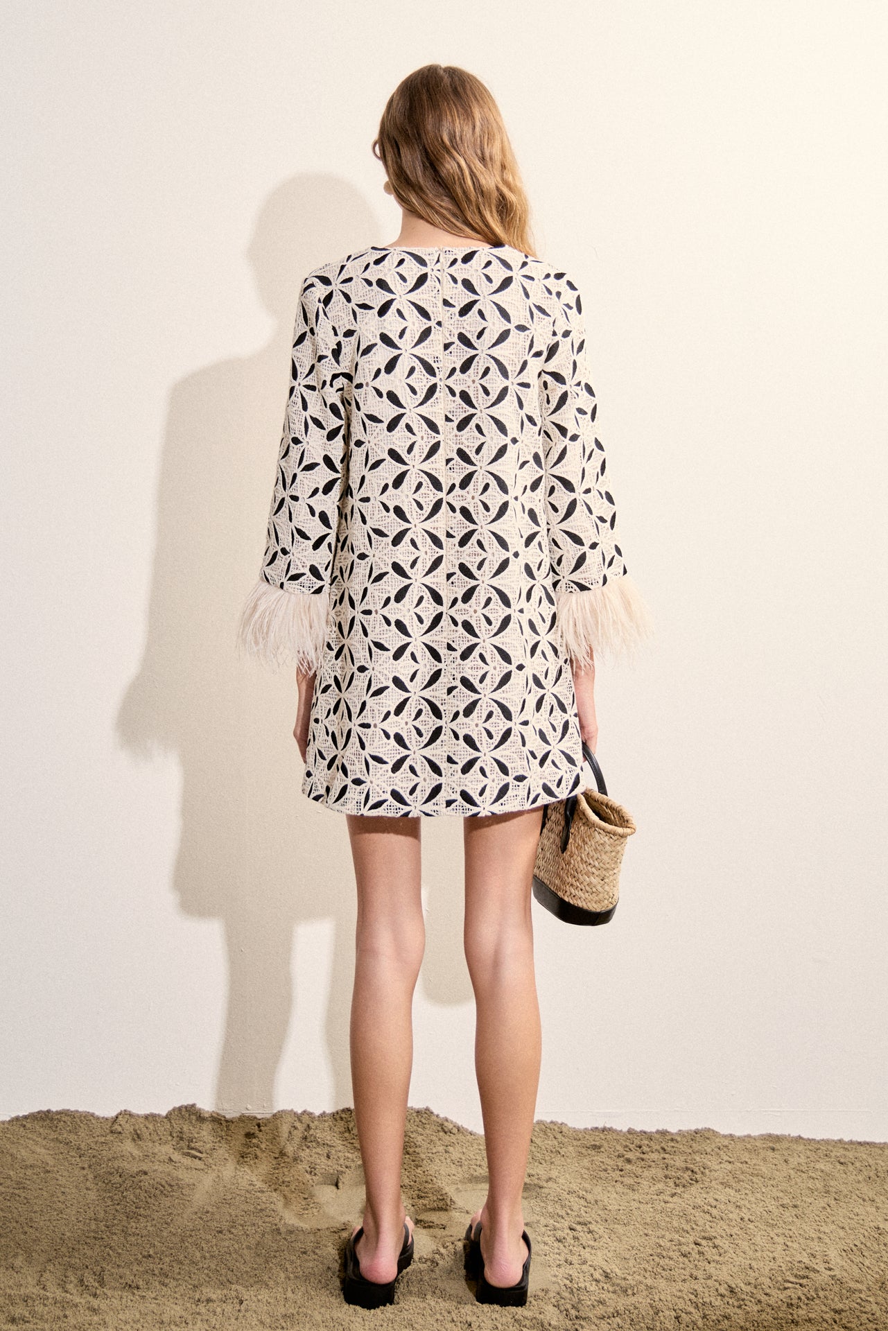 Introducing our Crochet Feather Trim Mini Dress, a statement piece designed with refined detail. Featuring an intricate crochet pattern, this dress offers texture and dimension while maintaining a clean silhouette. The relaxed shift shape is balanced by feather-trimmed cuffs, adding a subtle yet elevated finish. Designed with a split neckline for a modern touch, this piece transitions effortlessly from day to evening. A standout addition to your wardrobe with a polished, contemporary feel.