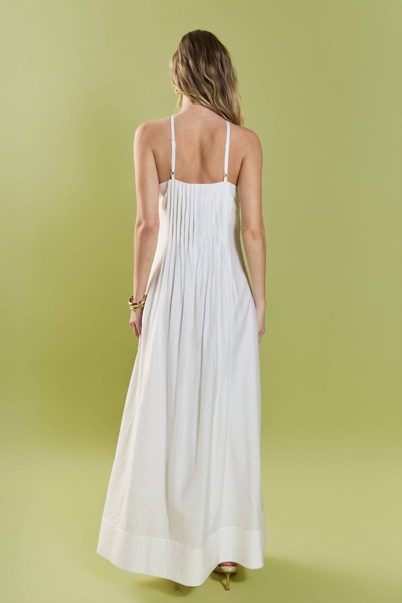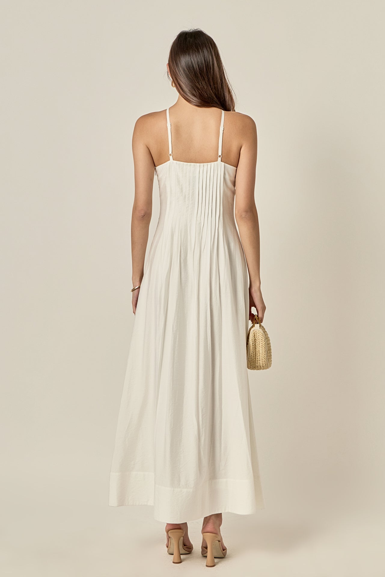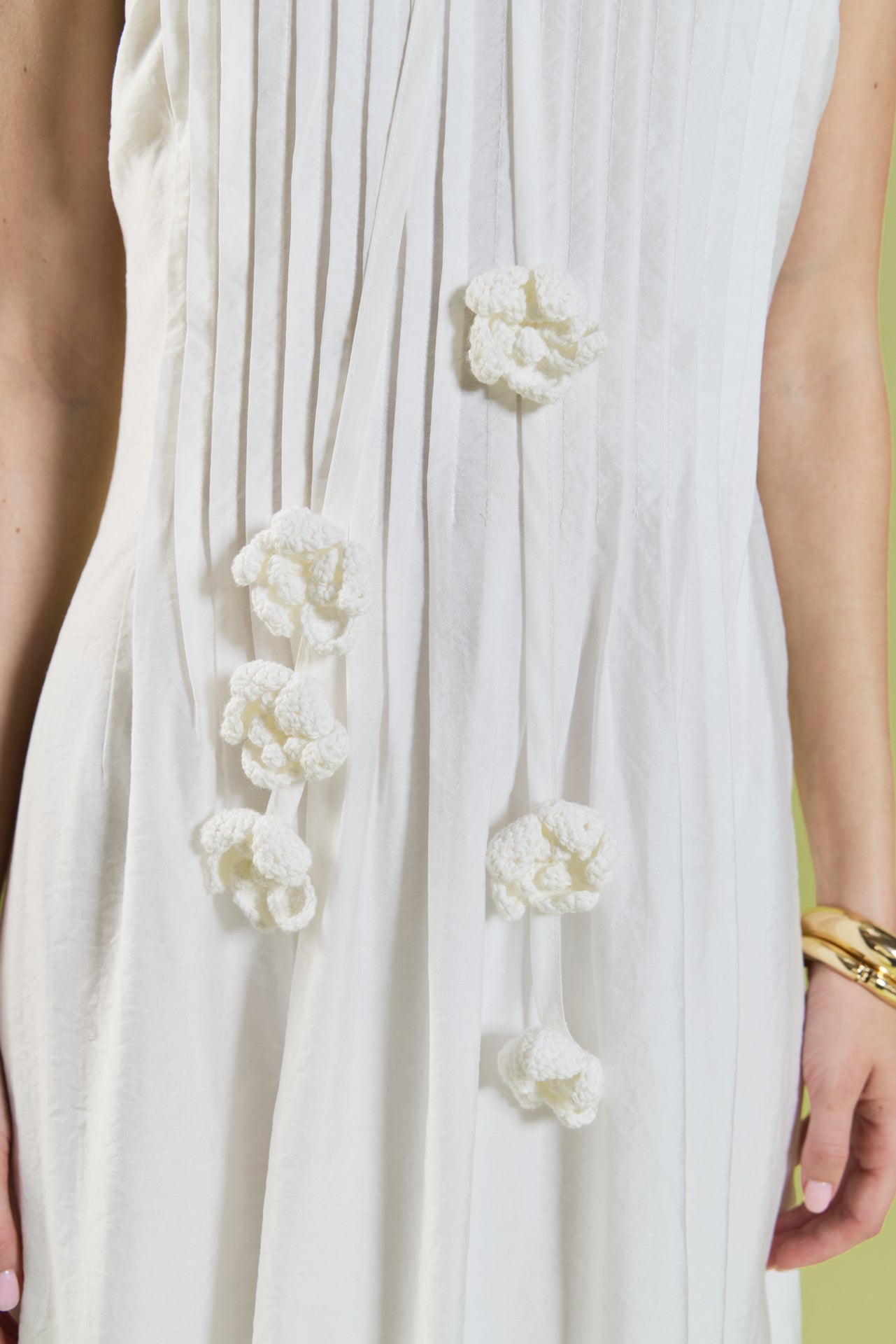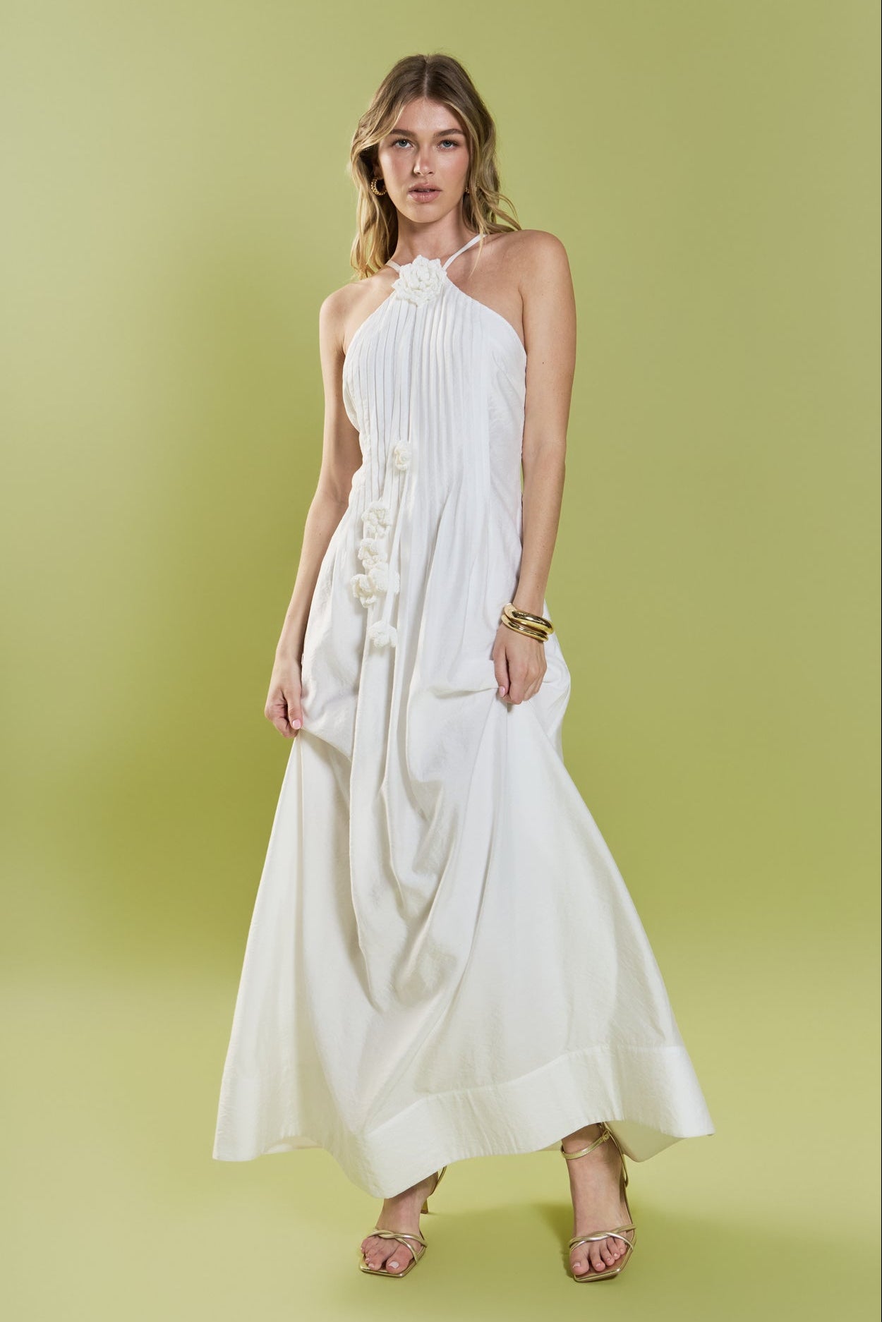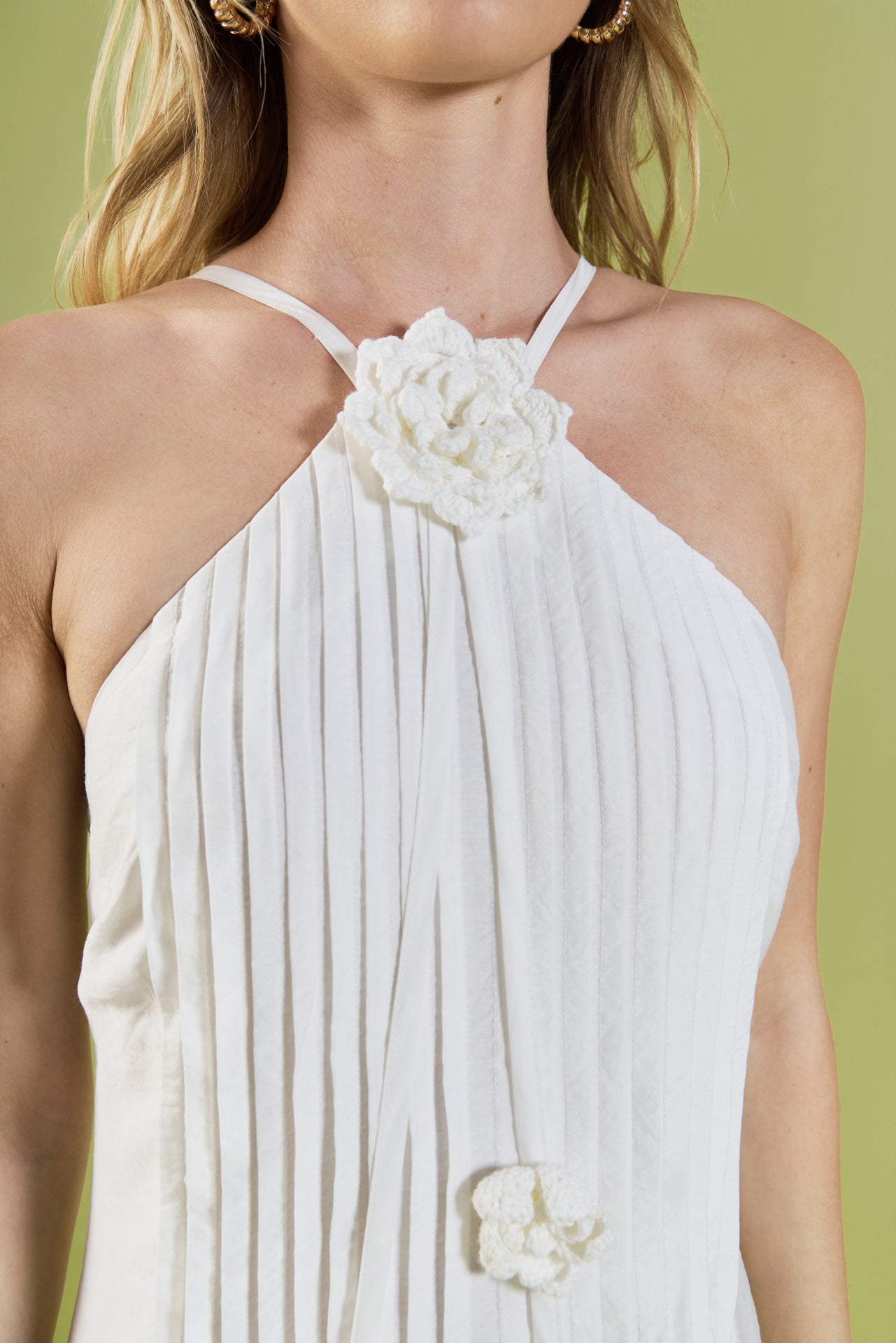 Romantic and effortlessly refined, the Crochet Flower Trim Halter Maxi Dress is designed to make a statement. Featuring a flattering halter neckline with delicate crochet flower appliqué at the center, this silhouette highlights the shoulders while maintaining an elegant feel. Soft front pintuck pleating adds texture and movement, flowing into a graceful maxi length. Perfect for summer occasions, bridal events, or sunset dinners, this dress blends feminine detail with timeless sophistication.