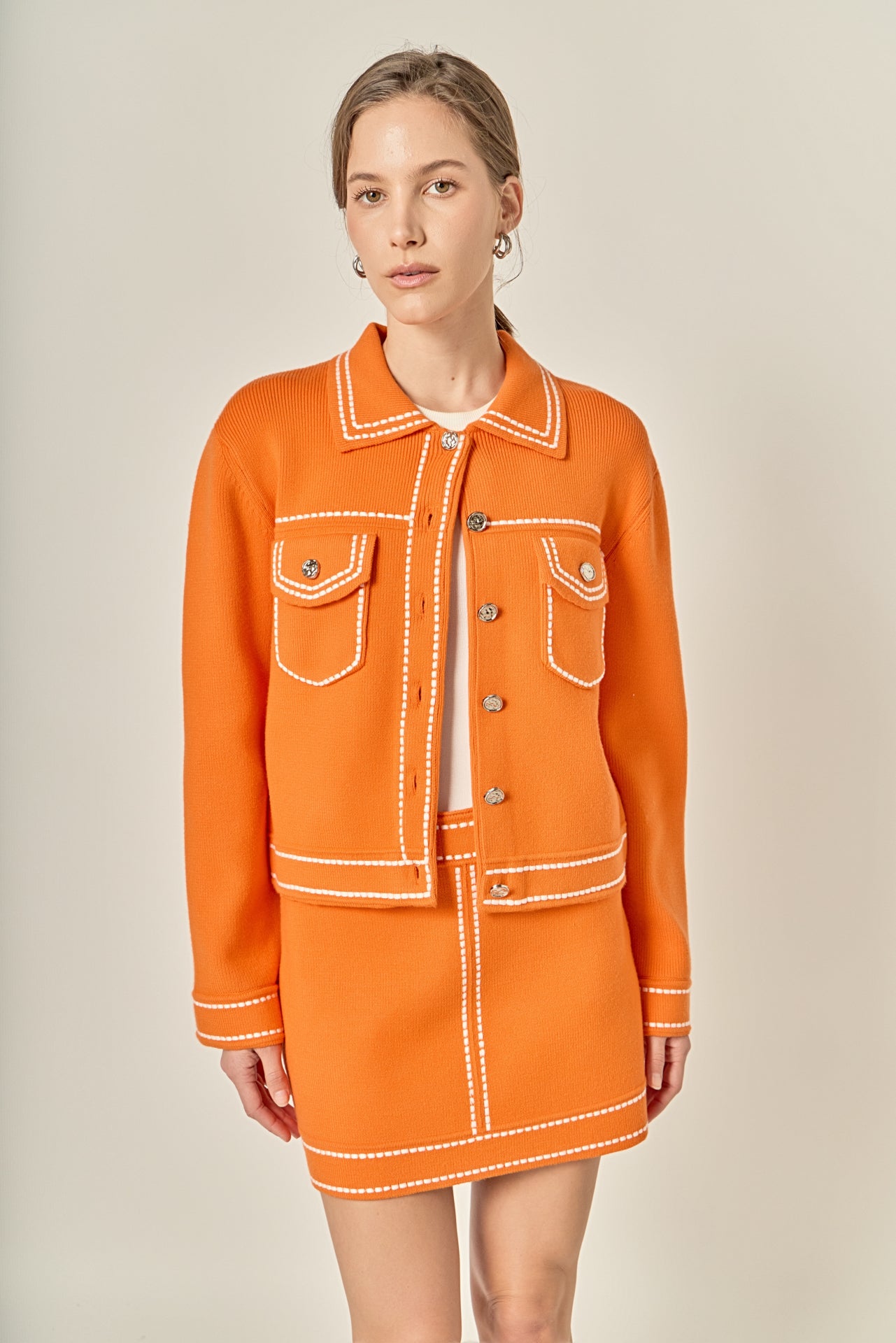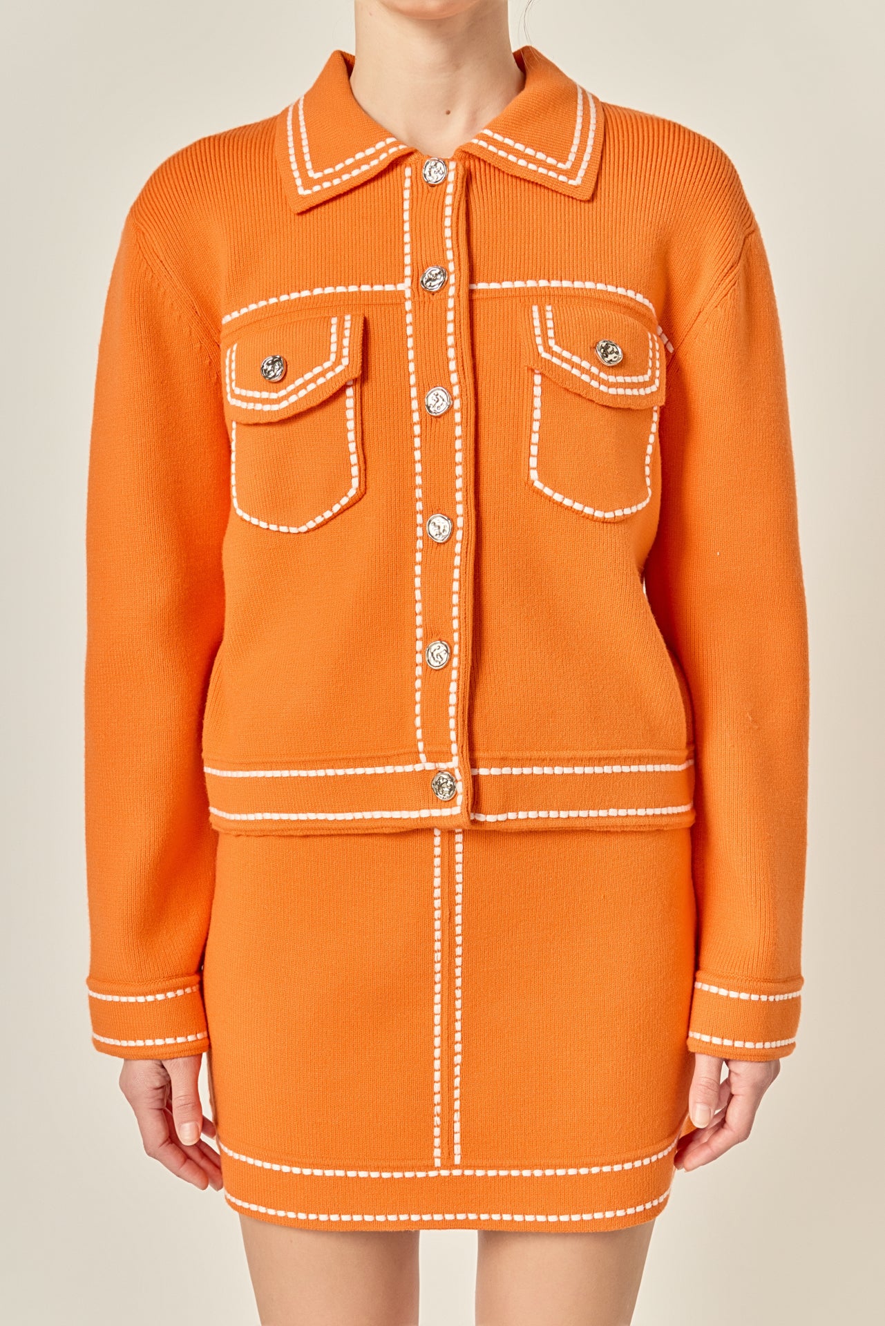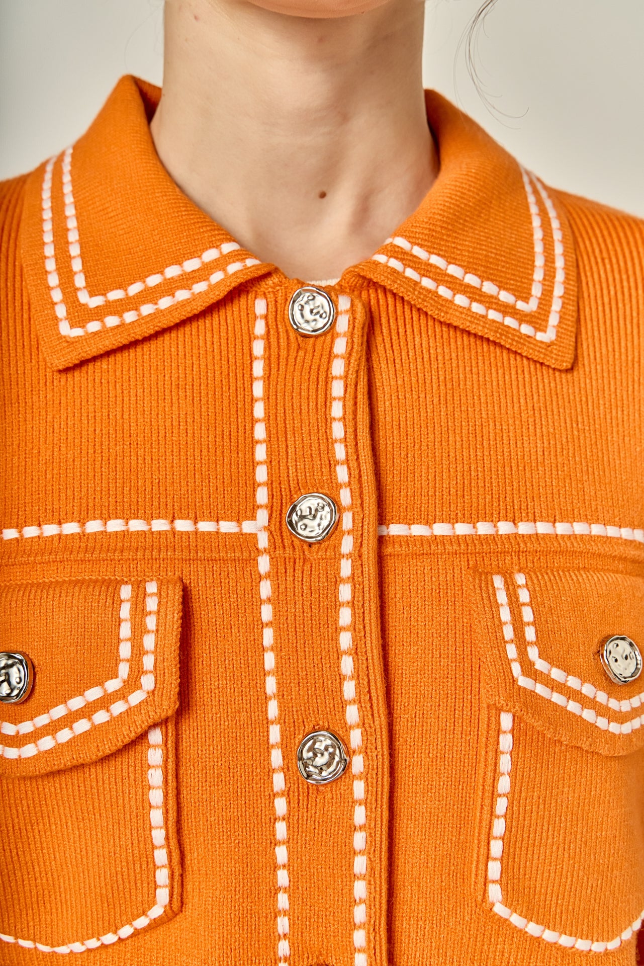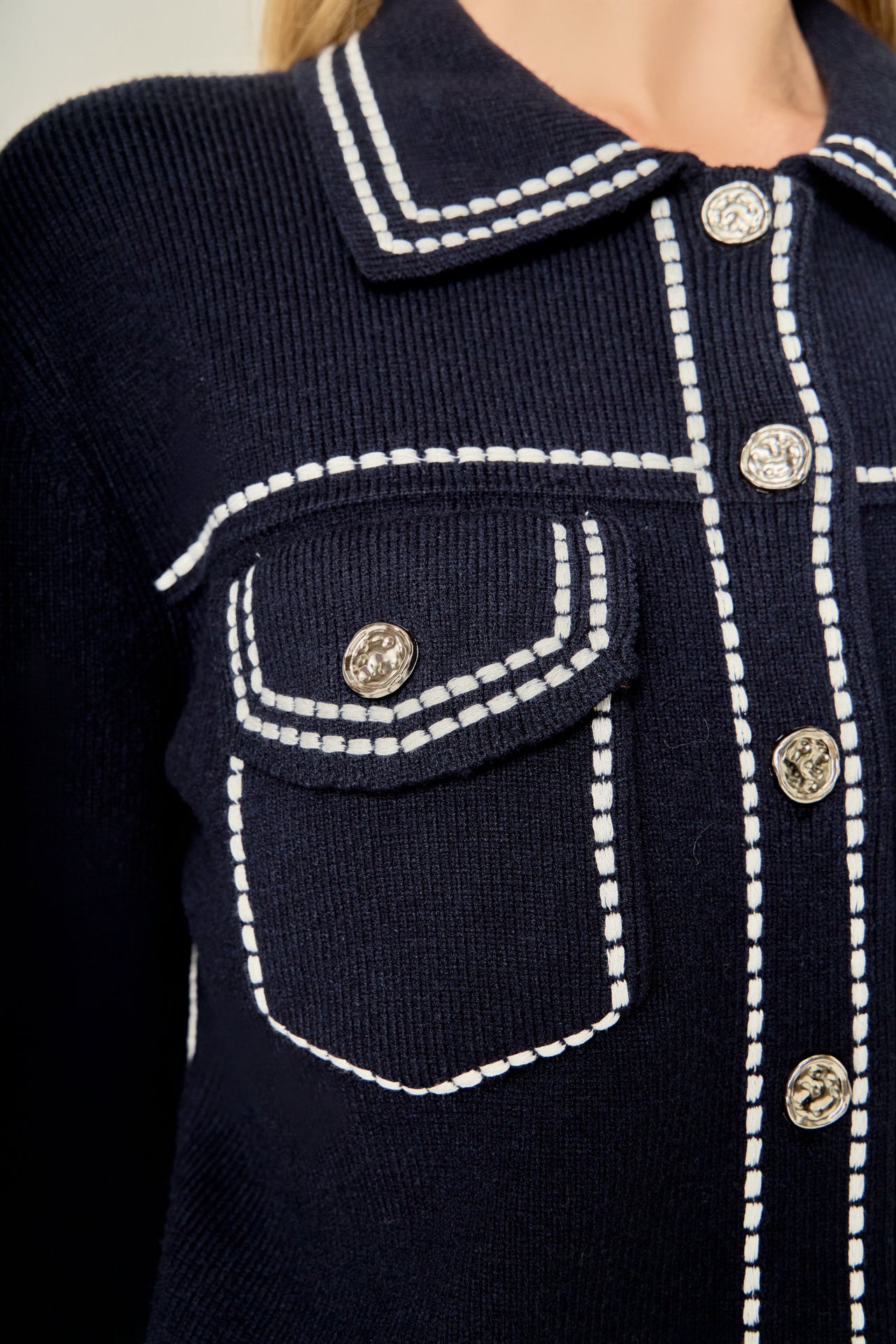 Elevate your style with our Denim-Look Knit Cardigan The perfect fusion of comfort and fashion, this jacket is crafted with a soft knit fabric that resembles denim. Featuring a stylish collar and long sleeves with cuffs and buttons, this cardigan adds a touch of sophistication to any outfit. The front out pocket adds both practicality and charm. Wear it on a casual day out or layer it over your office attire. Our denim-look cardigan is a must-have for a trendy wardrobe.