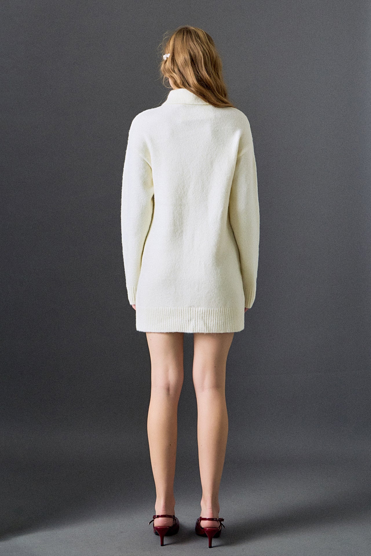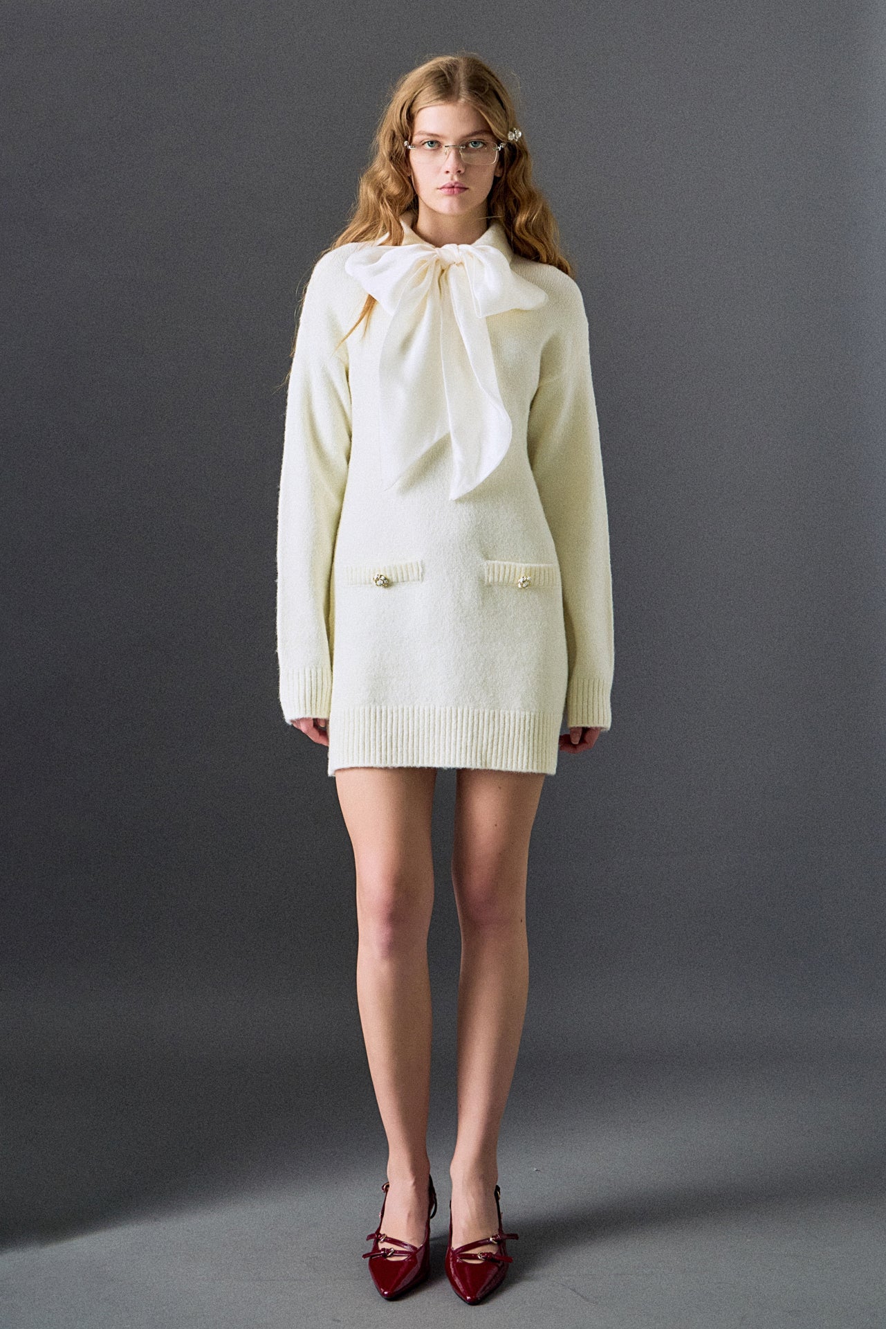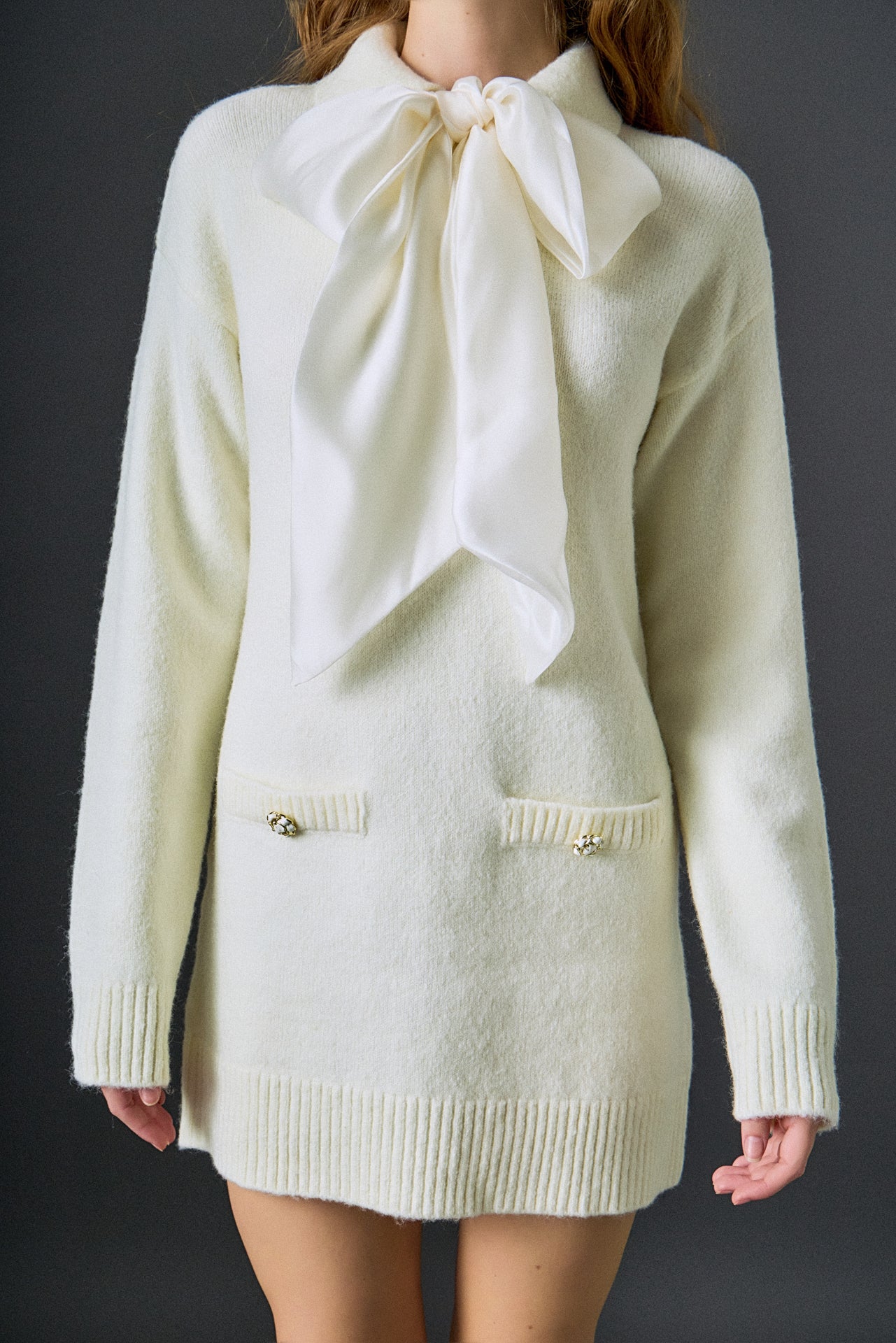 A cozy knit silhouette meets a statement satin bow in this detachable-bow dress, giving you two looks in one. The long sleeves and soft knit texture keep it comfortable, while the removable bow and collar let you switch between a bold, dressed-up feel and a clean, minimal look. Finished with subtle pocket details and ribbed trim, it’s an easy piece to style for everything from dinners to daytime outings.