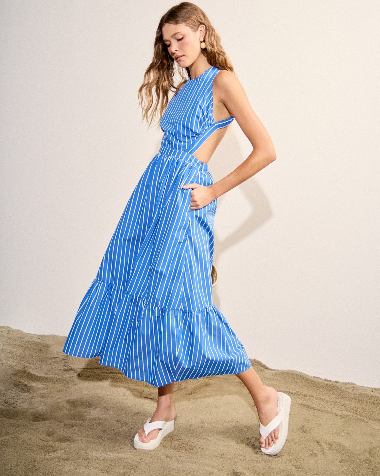 Introducing the Riviera Stripe Dress - where playful charm meets effortless elegance. Inspired by classic apron silhouettes, this sleeveless dress features a round neckline and a flattering open-back design with elasticized bands for a flexible, comfortable fit. Crafted from high-quality fabric in bold vertical stripes, it's a standout piece for sunny days, coastal getaways, or casual-chic events. Whether you're strolling seaside or styling for brunch, this dress offers a breezy statement with every step.