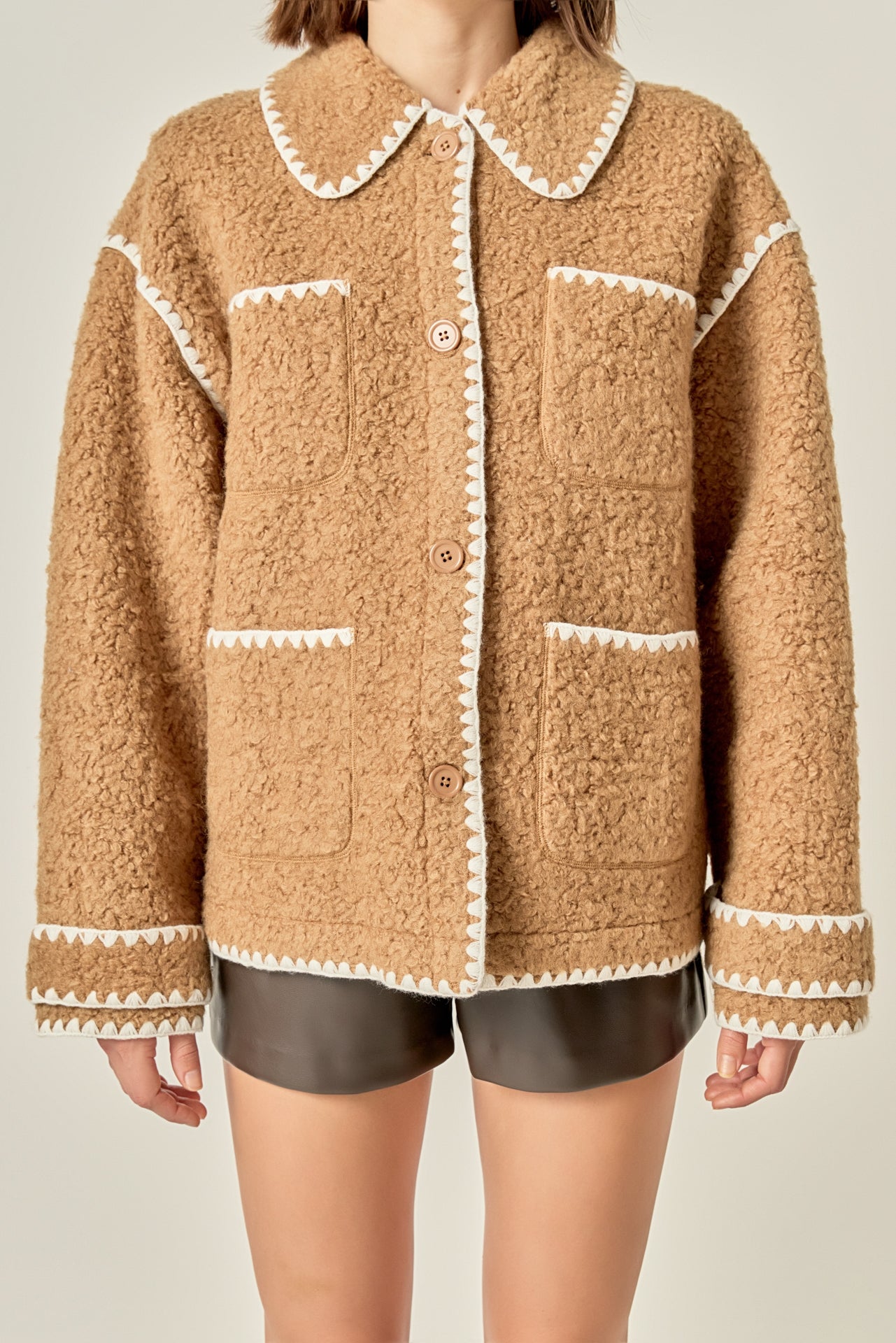 Wrap yourself in warmth and charm with our Embroidered Shearling Jacket, crafted from plush faux shearling that feels as cozy as it looks. The relaxed, drop-shoulder silhouette and rounded collar give it a soft, vintage-inspired feel, while the intricate embroidered trim adds a playful, handcrafted touch that makes the piece stand out. Designed with roomy patch pockets and easy button closures, this jacket brings together comfort, texture, and effortless style, perfect for chilly days when you still want your outfit to make a statement.