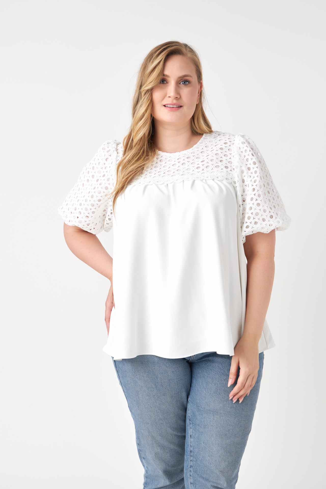 Step up your spring wardrobe with this eyelet flounced top from English Factory. With a round neckline and shirred back neck closure this top has all the structure you need to look smart. The elasticized eyelet sleeves and chest bring a subtle femininity to the look while the puff sleeves add volume and movement on those breezy days. The perfect companion for high-waisted jeans this eyelet flounced top will have all eyes on you.