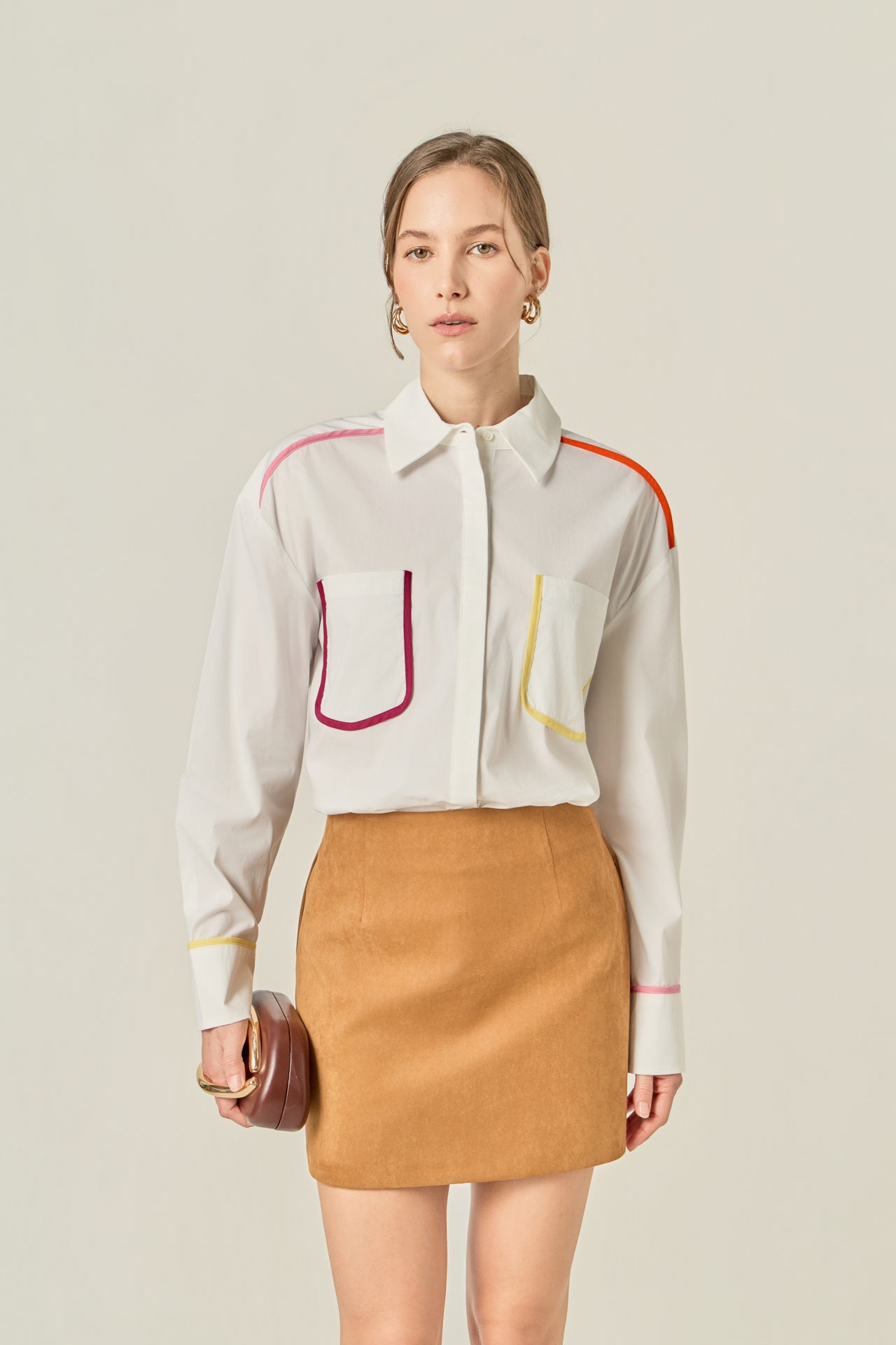 Introducing our Flat Binding Detailed Shirt the must-have addition to your wardrobe! This collared shirt features eye-catching colorblock binding that adds a pop of style. With convenient front patch pockets it's both fashionable and functional. The long sleeves with cuffs give it a classic touch. Perfect for any occasion this shirt is sure to turn heads. Its unique design and exceptional quality make it a top pick for fashion-forward individuals. Shop now and stand out from the crowd. Don't miss out on this trendy shirt that effortlessly combines fashion and practicality.
