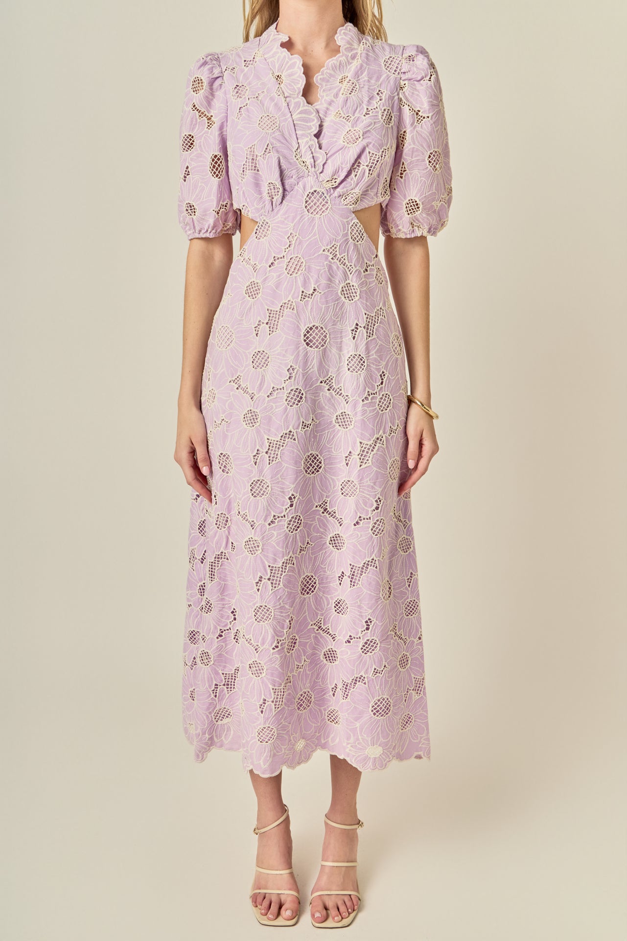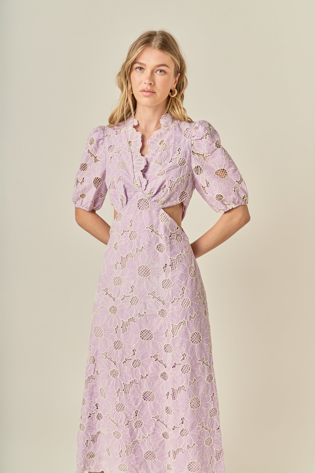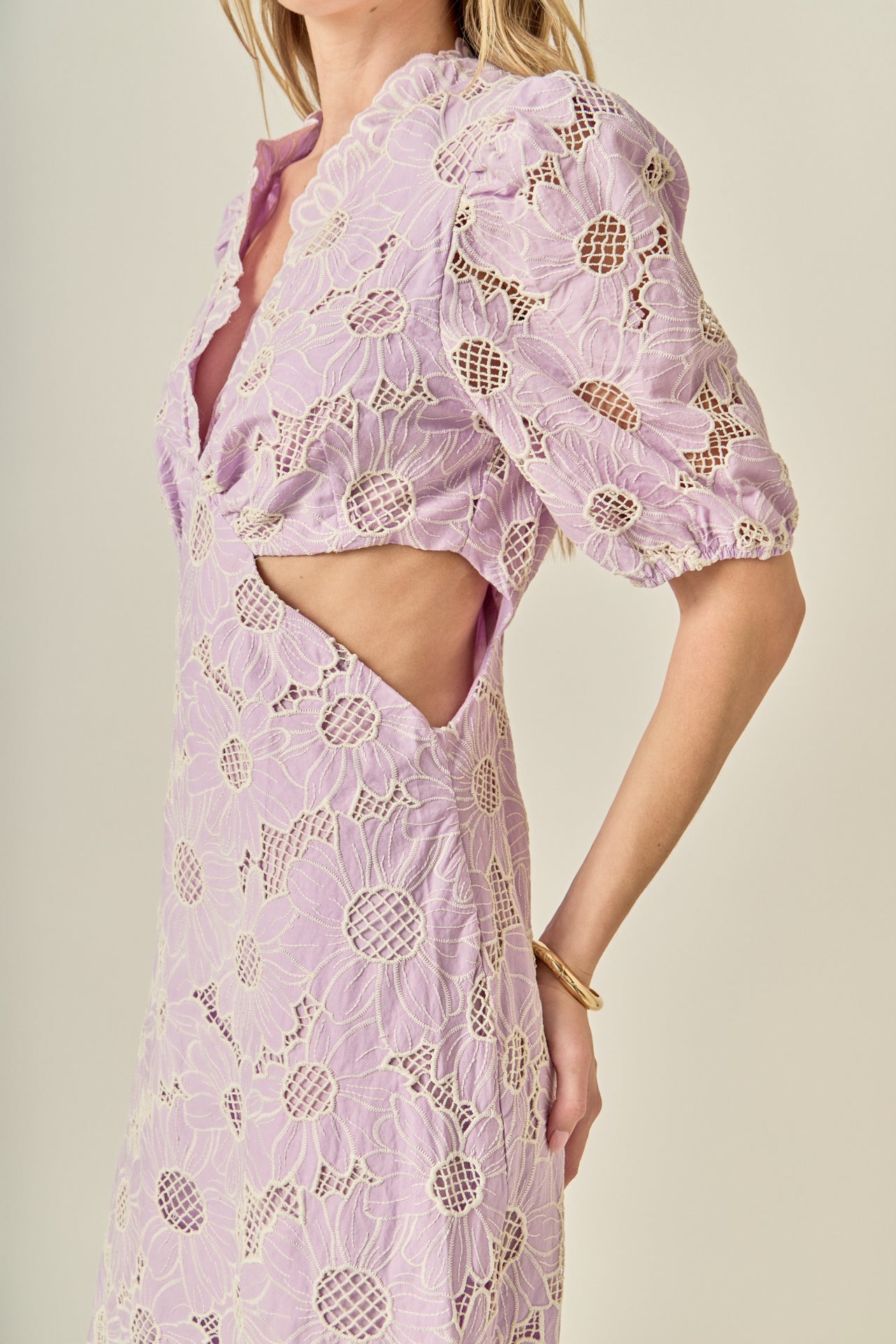 Feminine and fresh, the Lilac Bloom Cutout Dress is a standout piece for the season. Crafted from intricate floral eyelet lace in a soft lavender hue, it features a flattering V-neckline, romantic puff sleeves, and subtle side cutouts for a modern touch. The scalloped hem and embroidered texture add an extra layer of charm, while the midi length keeps it effortlessly elegant. Perfect for garden parties, weddings, or sunny weekend plans - this dress is made to turn heads wherever you go.