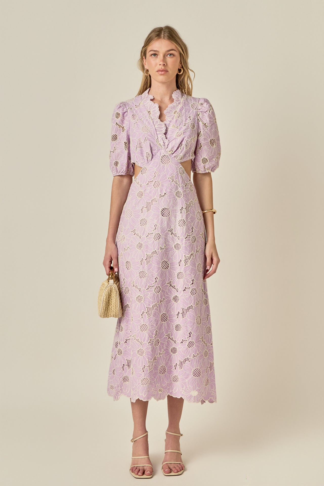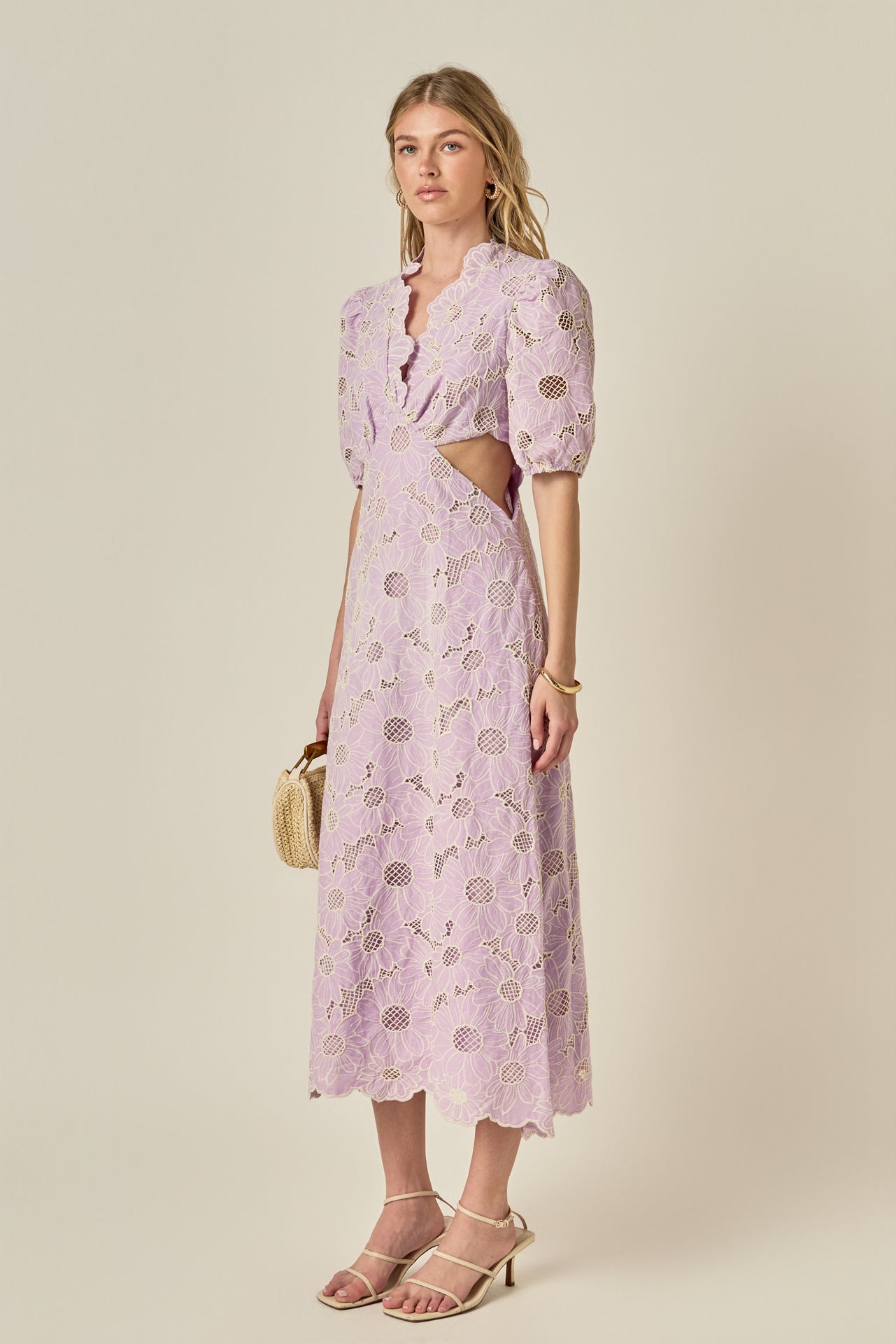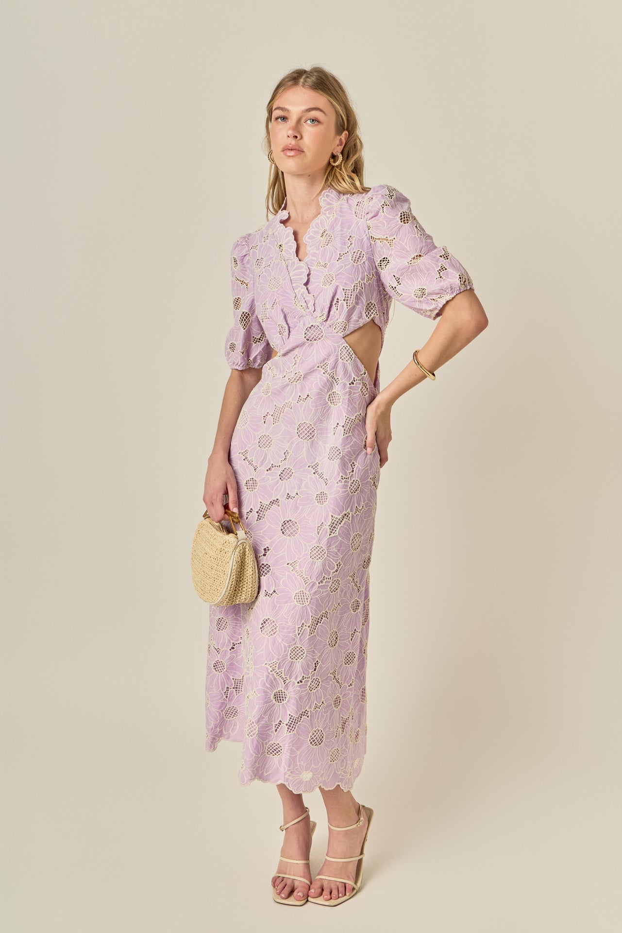 Feminine and fresh, the Lilac Bloom Cutout Dress is a standout piece for the season. Crafted from intricate floral eyelet lace in a soft lavender hue, it features a flattering V-neckline, romantic puff sleeves, and subtle side cutouts for a modern touch. The scalloped hem and embroidered texture add an extra layer of charm, while the midi length keeps it effortlessly elegant. Perfect for garden parties, weddings, or sunny weekend plans - this dress is made to turn heads wherever you go.
