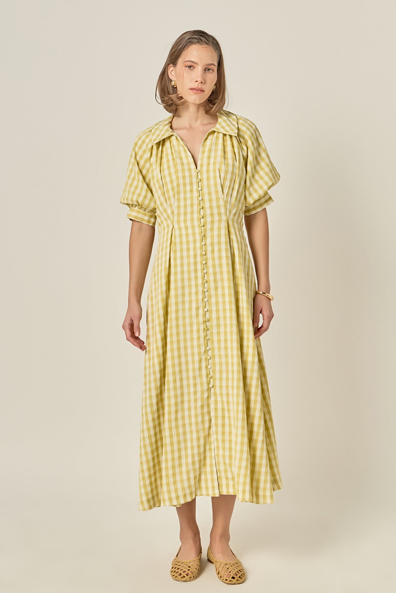 Our Gingham Puff Sleeve Dress offers an easy, modern take on a classic print. Designed with soft puff sleeves, a button-front closure, and subtle gathering through the waist, it creates a clean, flattering shape without feeling fussy. The lightweight gingham fabric makes it comfortable for all-day wear, while the flowy A-line skirt adds simple movement. Effortless and versatile, its a piece you can style for casual days, weekend plans, or everyday outings.