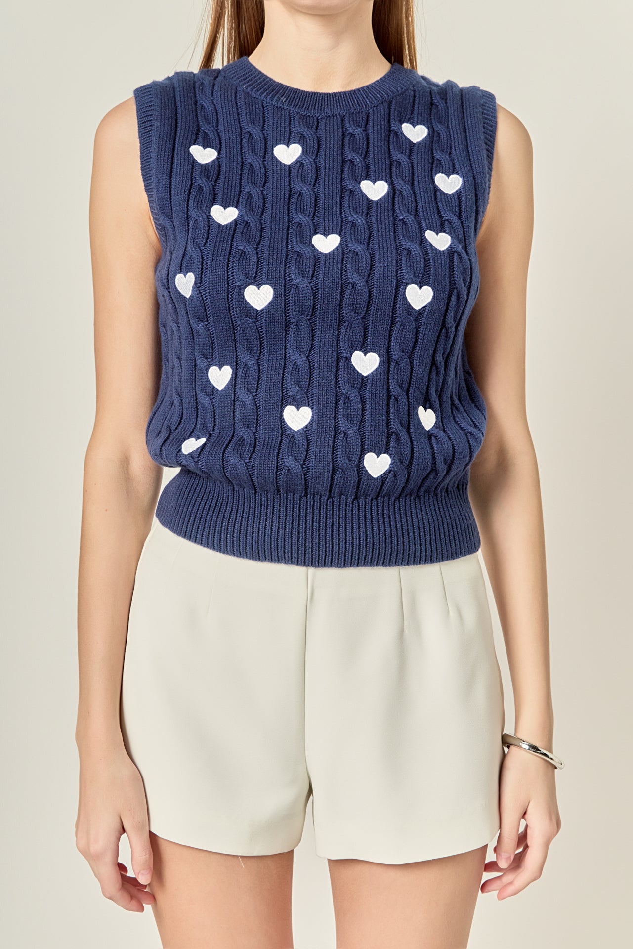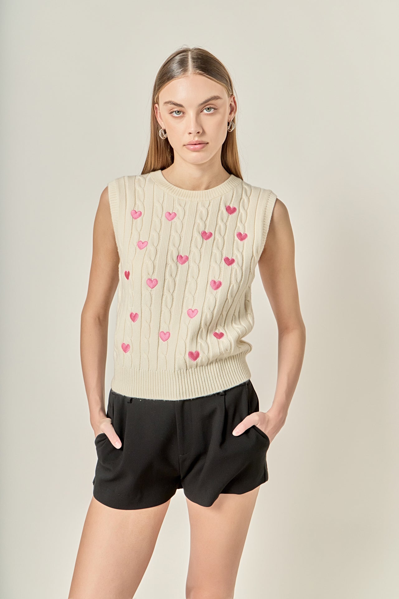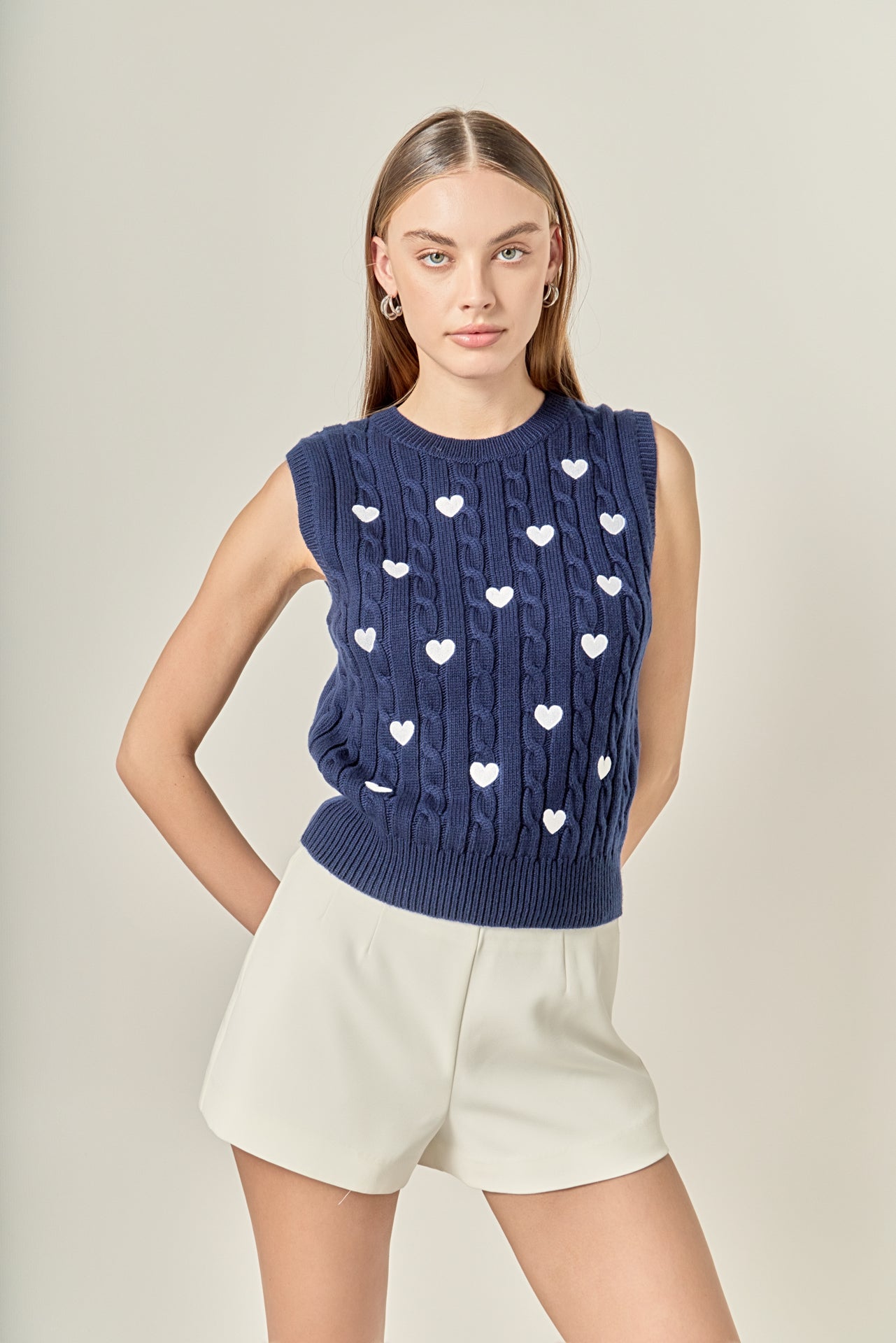 Add a playful touch to your everyday wardrobe with this Embroidered Heart Knit Vest. Designed with a classic round neckline and sleeveless silhouette, it features delicate heart embroidery throughout for subtle charm. The textured knit adds dimension while keeping the look effortless and versatile. Easy to layer or wear on its own, this vest brings just the right amount of sweetness to any outfit.