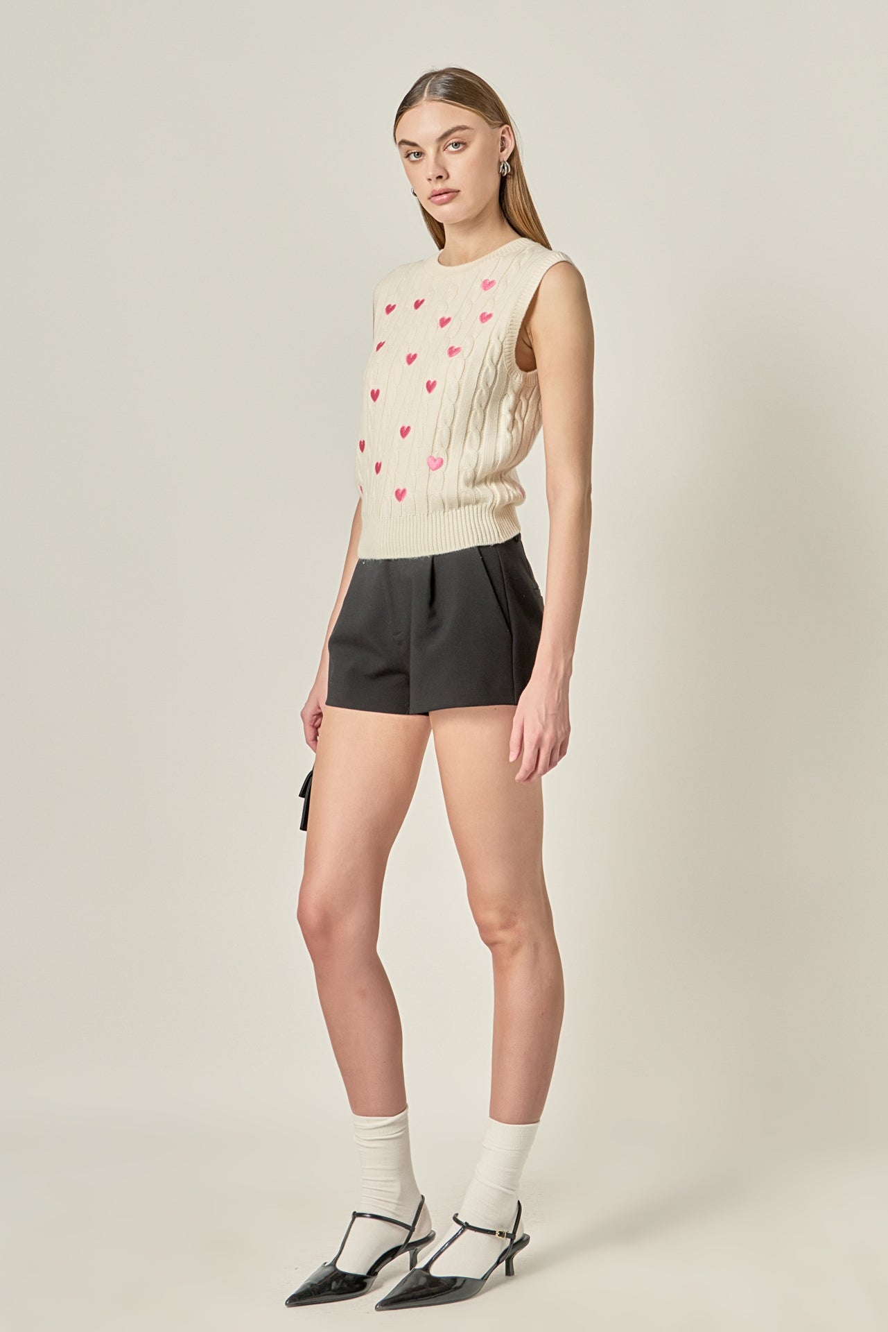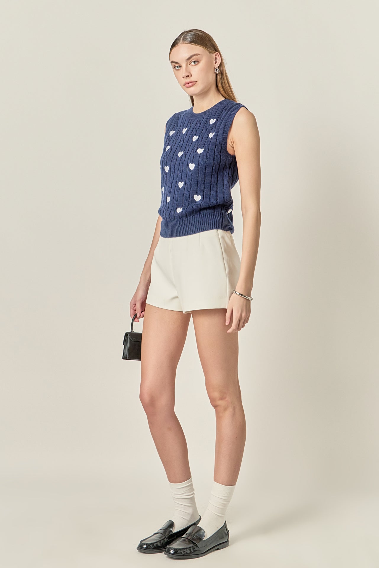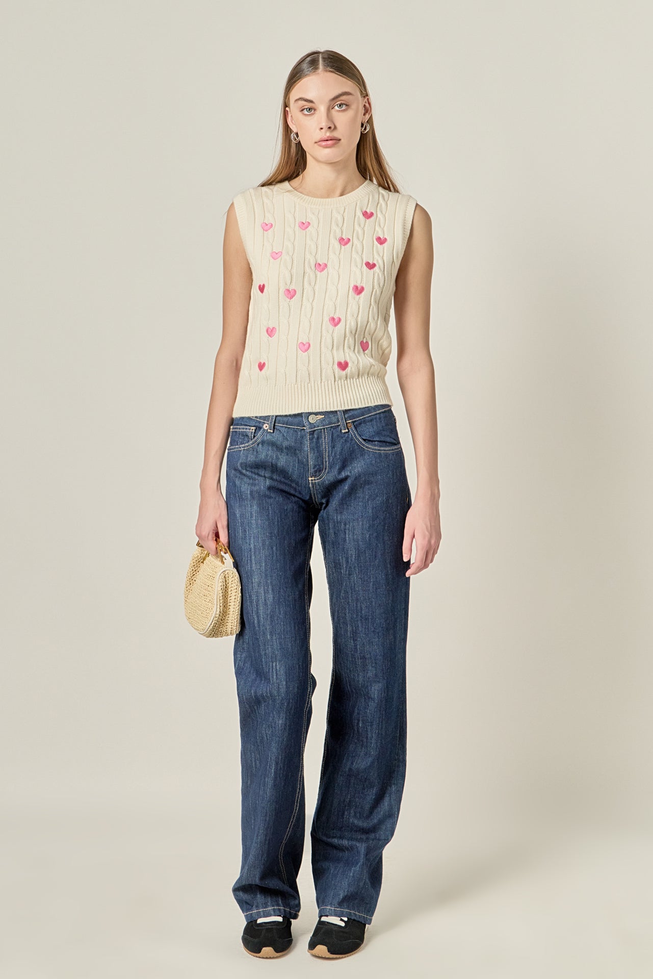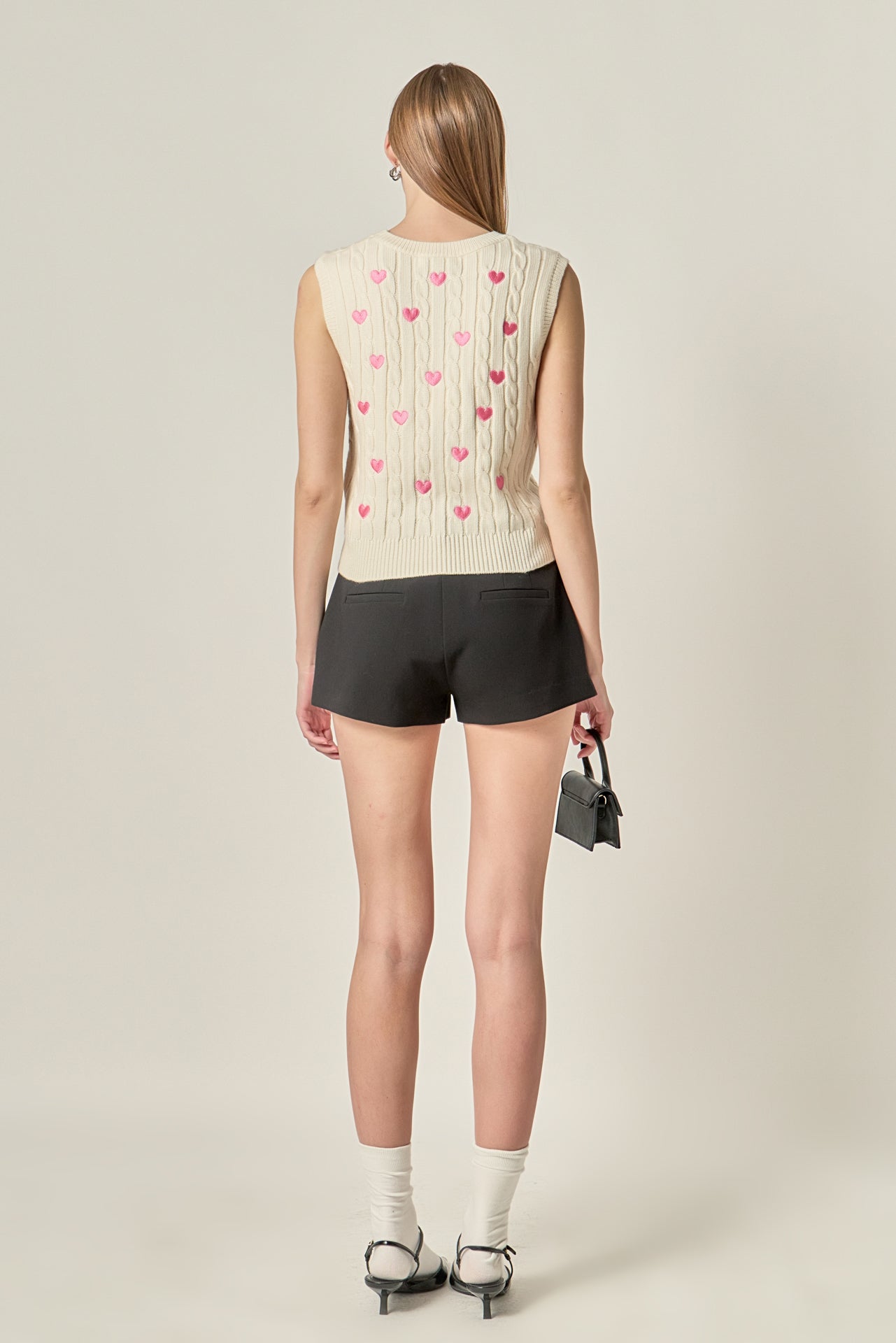 Add a playful touch to your everyday wardrobe with this Embroidered Heart Knit Vest. Designed with a classic round neckline and sleeveless silhouette, it features delicate heart embroidery throughout for subtle charm. The textured knit adds dimension while keeping the look effortless and versatile. Easy to layer or wear on its own, this vest brings just the right amount of sweetness to any outfit.
