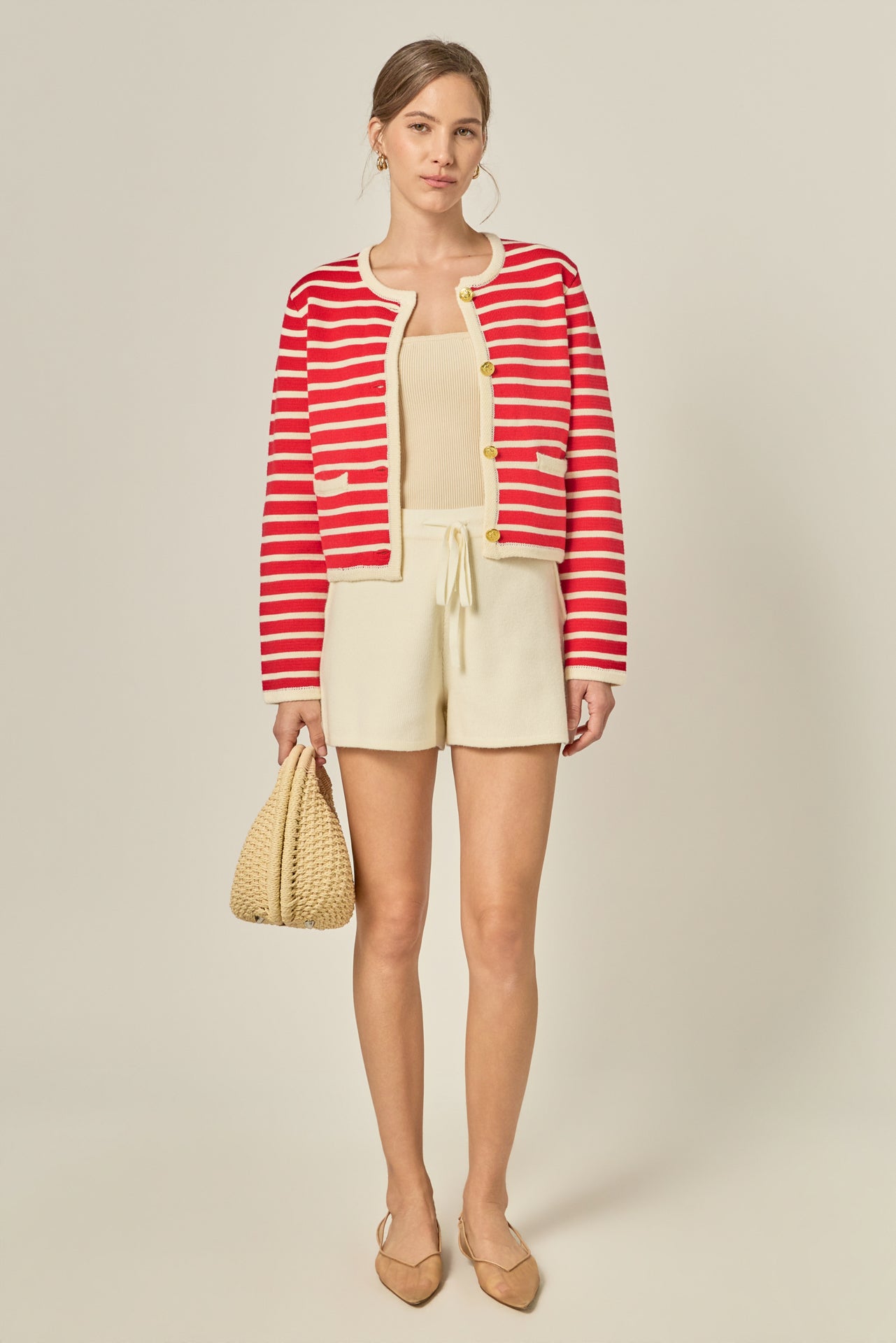 Elevate your wardrobe with the Pepper Knit Sailor Stripe Cropped Sweater Cardigan - a luxurious must-have for the season. Crafted from thick, high-quality knit fabric, this cardigan delivers exceptional warmth and comfort. Bold horizontal stripes across the body and elegant gold buttons along the front create a timeless, sophisticated aesthetic. Perfect for chilly winter days, this stylish cardigan effortlessly combines cozy practicality with a touch of glamour, making it a standout piece for any occasion.