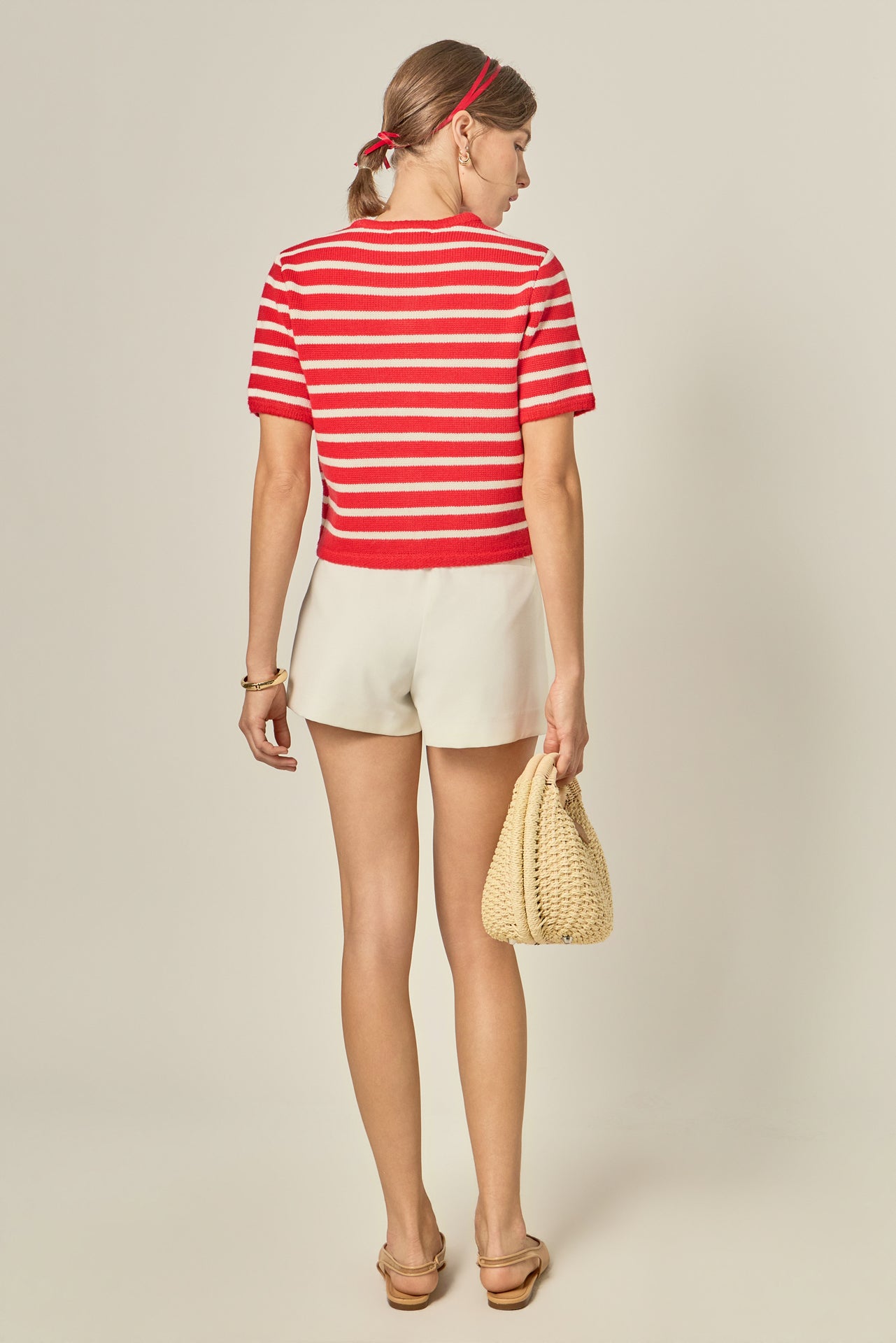 A modern take on a timeless favorite. Our Striped Knit Cardigan blends preppy charm with an effortlessly polished feel. Designed in a soft, mid-weight knit, this cropped silhouette features classic horizontal stripes, short sleeves, and gleaming gold-tone buttons for the perfect touch of luxe. Finished with front patch pockets for subtle structure, it’s the ultimate layer for casual Fridays, coffee dates, and everything in between.