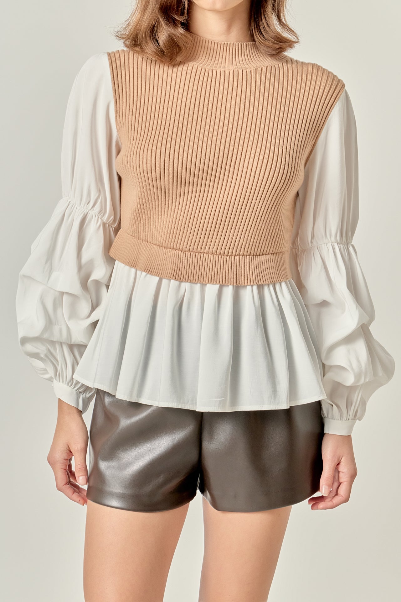 Elevate your style with this sophisticated and stylish. Mixed Media Top from English Factory. This long-sleeve top is perfect for dressing up any look. The knit bodice, peplum hem, and puffy sleeves add a unique twist to a classic silhouette. Style this top with dress pants for the office or wear it with jeans for a night out.