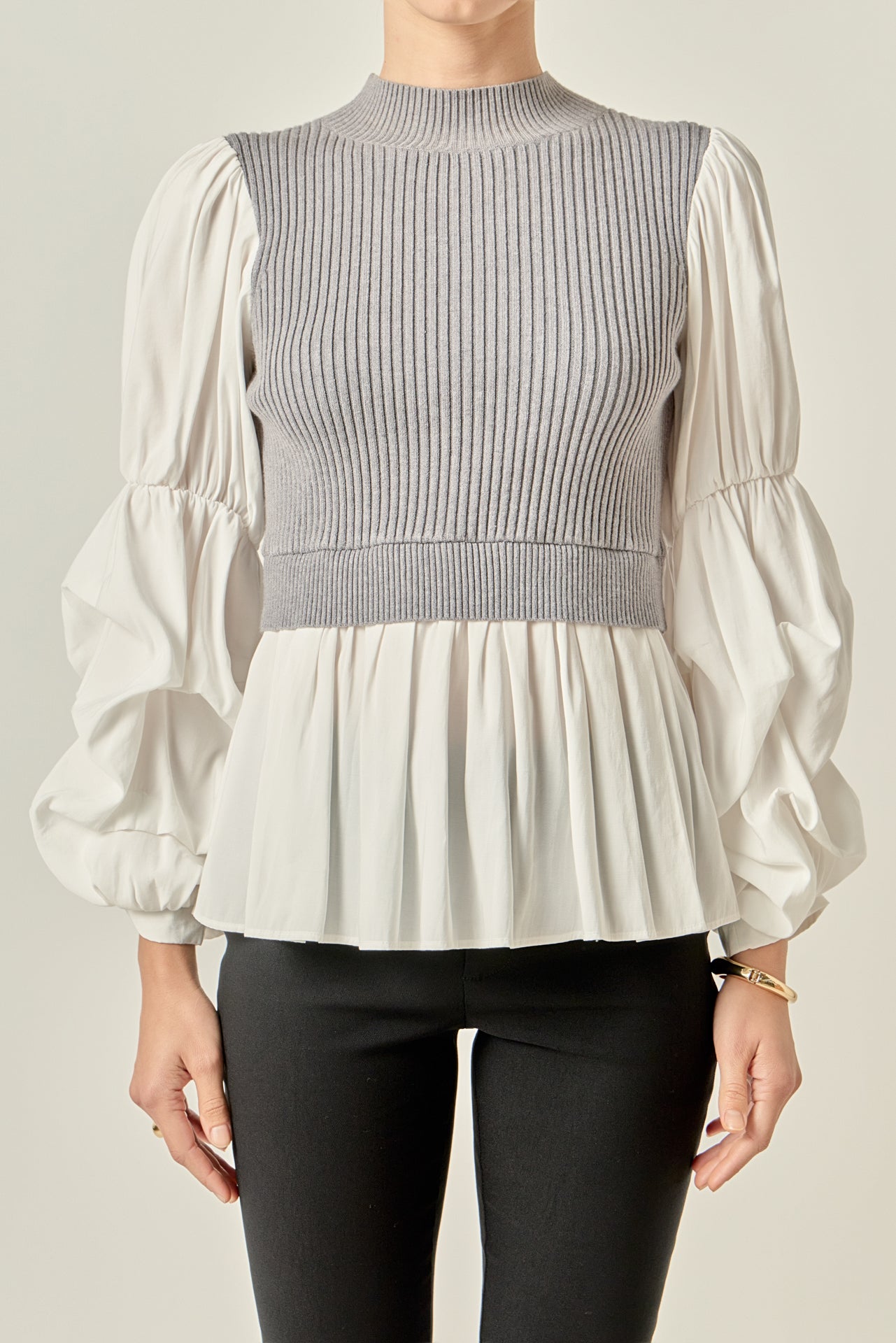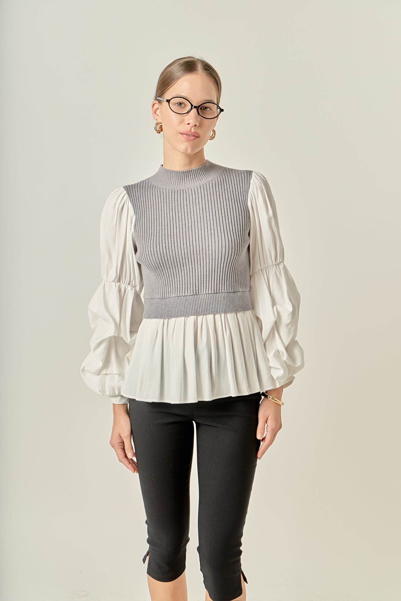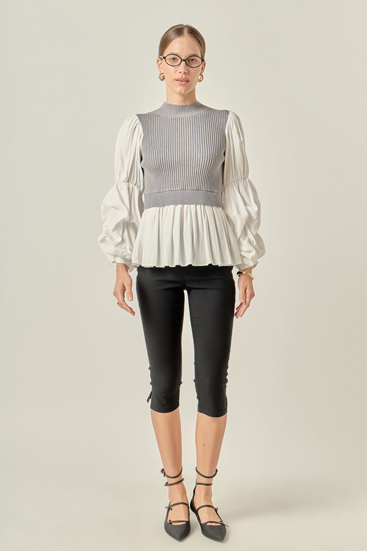 Elevate your style with this sophisticated and stylish. Mixed Media Top from English Factory. This long-sleeve top is perfect for dressing up any look. The knit bodice, peplum hem, and puffy sleeves add a unique twist to a classic silhouette. Style this top with dress pants for the office or wear it with jeans for a night out.