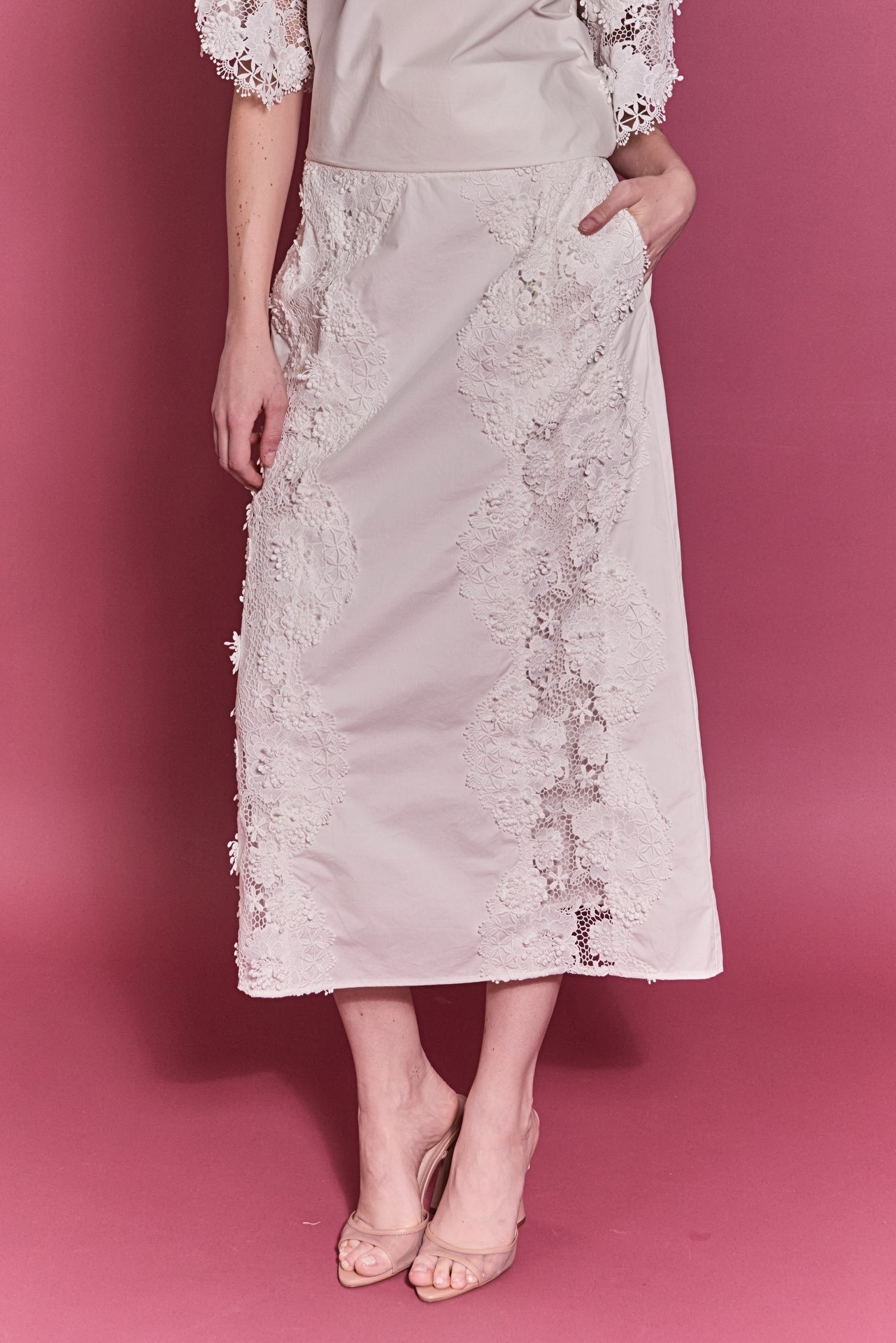 Add effortless elegance to your wardrobe with our Lace Cascade Midi Skirt. Featuring intricate lace paneling that brings texture and romance, this timeless silhouette is designed to flatter with its comfortable elastic waistband and graceful midi length. Thoughtfully crafted with side pockets for everyday ease, it balances charm with functionality. Whether paired with heels for an elevated ensemble or styled casually with sneakers, this skirt is a versatile must-have for any modern wardrobe.