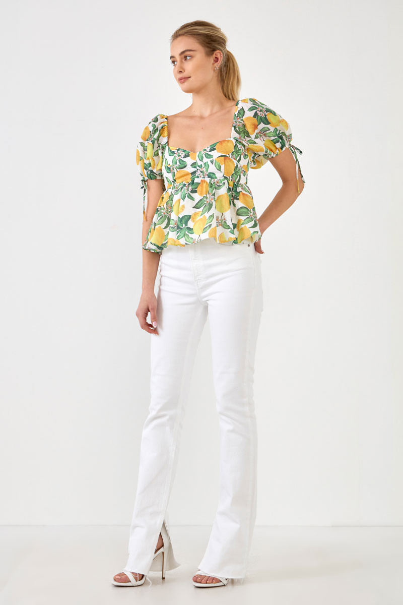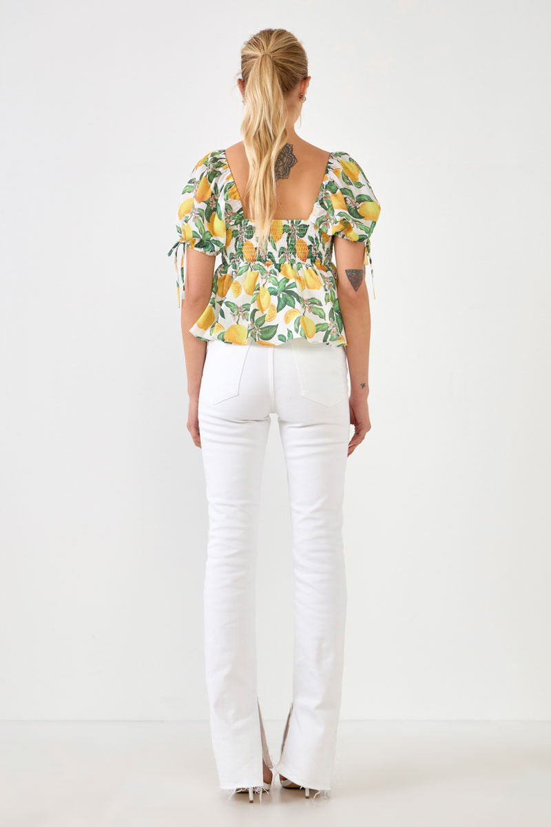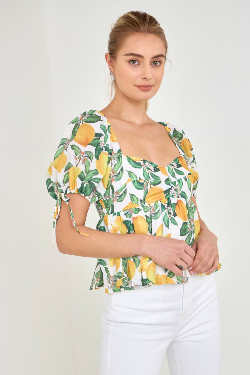 A fruity addition to your warm-weather wardrobe, this lemon print puff sleeve top is sure to make a statement. With a sweatheart neckline and short puff sleeves, this top is perfect for a day of fun in the sun. The peplum waist and backside smocking detail create a flattering silhouette, while the tie detail at the sleeve adds a touch of whimsy. Lined for comfort, this top is sure to be a staple in your summer wardrobe.