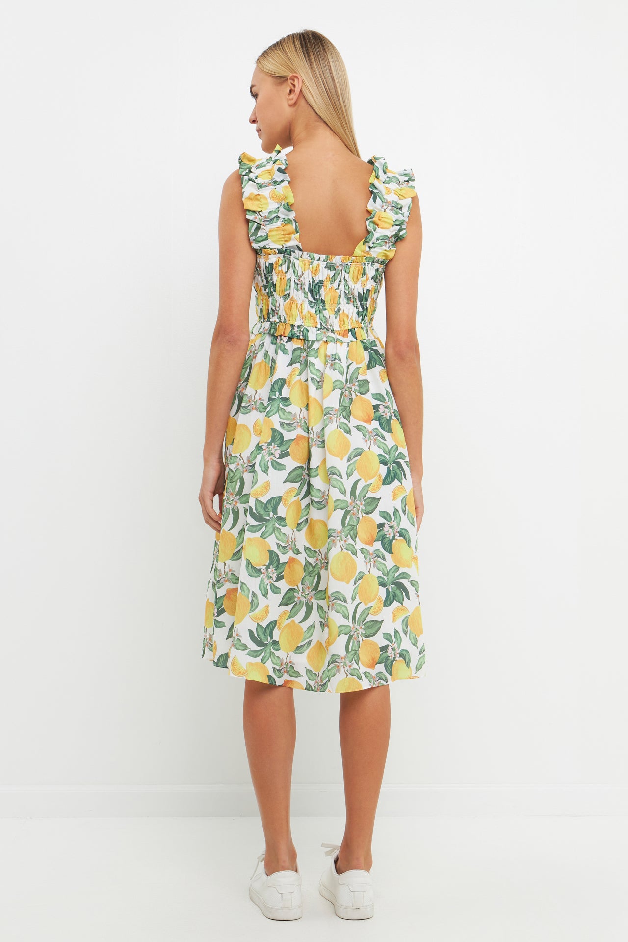 Add some zest to your wardrobe with this Lemon Print Smocked Bodice Midi Dress. The lemon prints and smocked top give this dress a fun and flirty look, while the midi length keeps it classy. The square neckline and sleeveless silhouette are perfect for showing off your sun-kissed skin. Whether you're headed to a summer party or a day at the office, this dress is sure to turn heads.