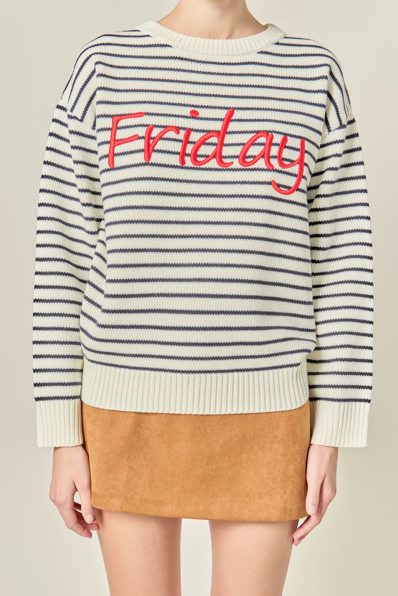 Stay cozy and stylish all winter long with our Friday Lettering Sweater. Made from a quality knit fabric, this sweater offers comfort and warmth without compromising on style. The chic stripe design adds a pop of pattern, while the classic round neckline and long sleeves keep it versatile and easy to layer. Perfect for both casual and dressy occasions, this sweater is a must-have in your wardrobe. Upgrade your sweater game now and add the Friday Lettering Sweater to your collection!