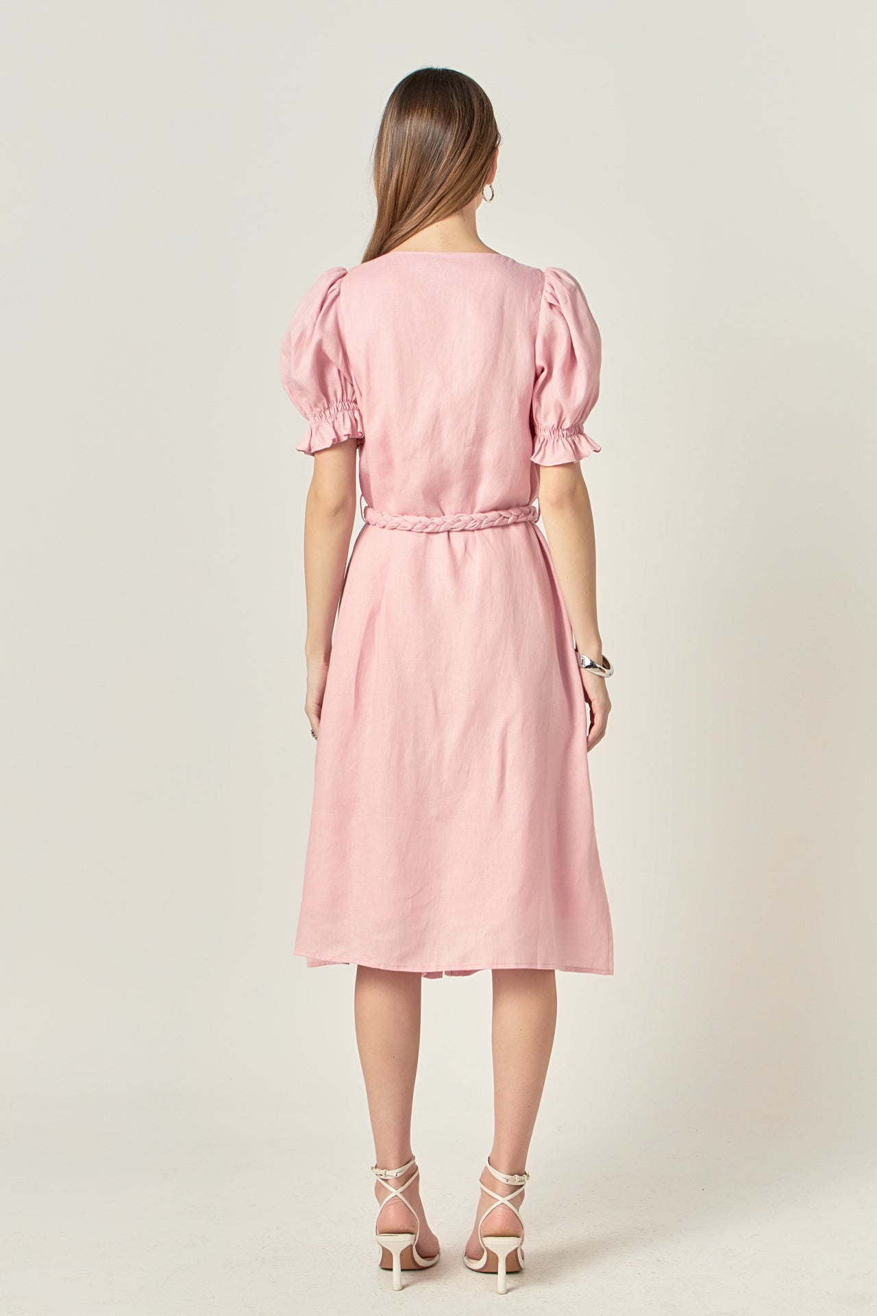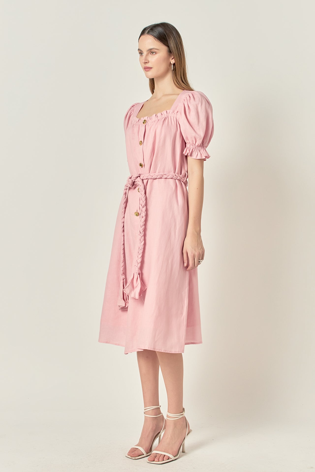 Step into the sweet summer season with this charming linen dress from English Factory. Featuring a square neckline puff short sleeves and front buttons that sparkle you'll be sure to impress in this dress. The self-braided tie belt gives you a flattering silhouette. Wear it to a summer picnic or outdoor wedding and get ready for all the compliments that are sure to come your way. Whether you decide to dress it up or down you will feel beautiful and comfortable all day long in this breathable piece.