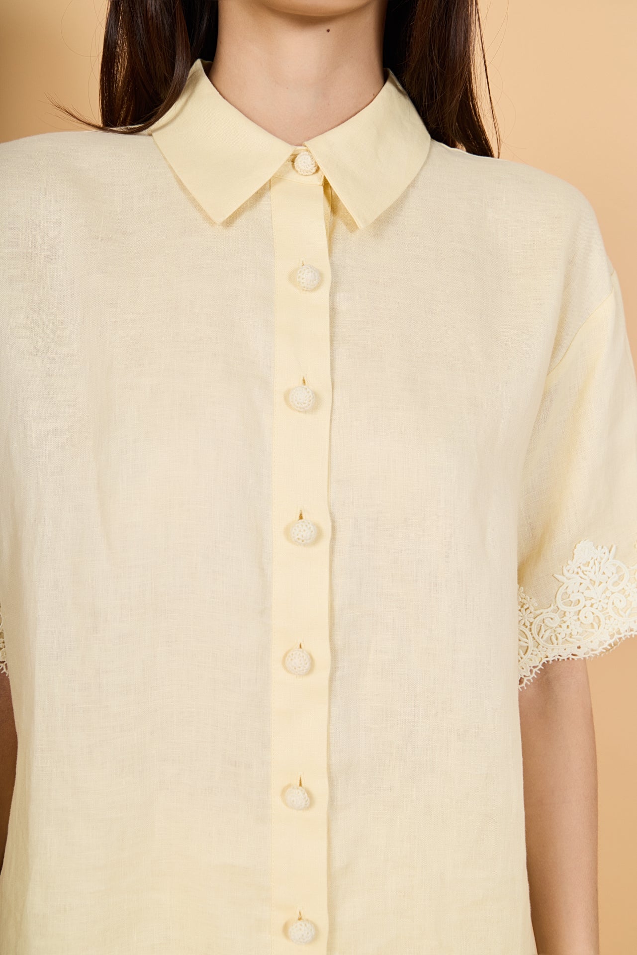 Crafted from premium linen, this lightweight and breathable shirt is perfect for warm days and elevated styling. Delicate lace trim at the sleeves adds a soft, feminine touch, while the front button closure with hidden placket keeps the look clean and polished. Finished with a classic collar, this versatile piece transitions seamlessly from day to night. Whether paired with tailored shorts or denim, the Midnight Linen Lace Shirt is a refined staple for the modern wardrobe.