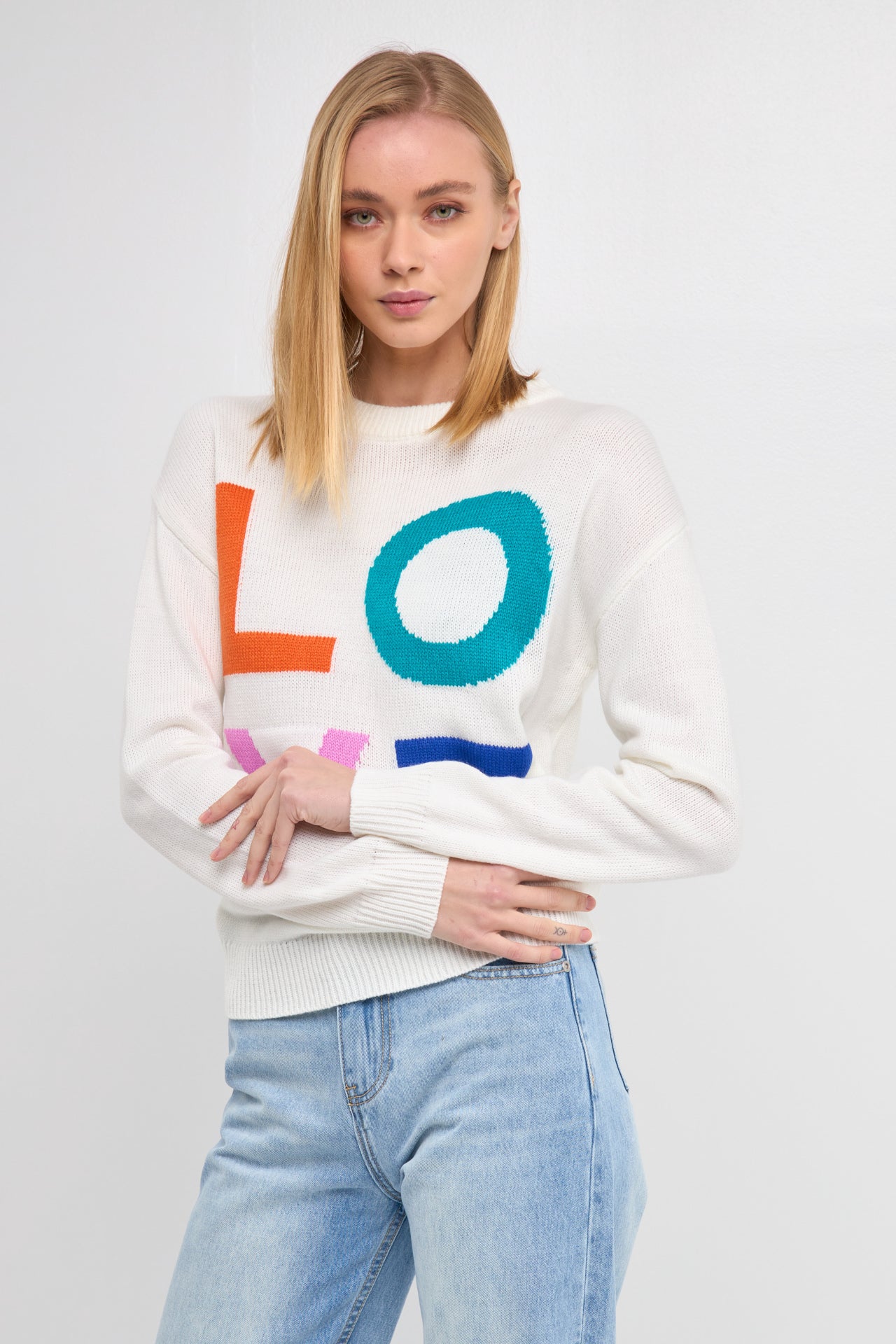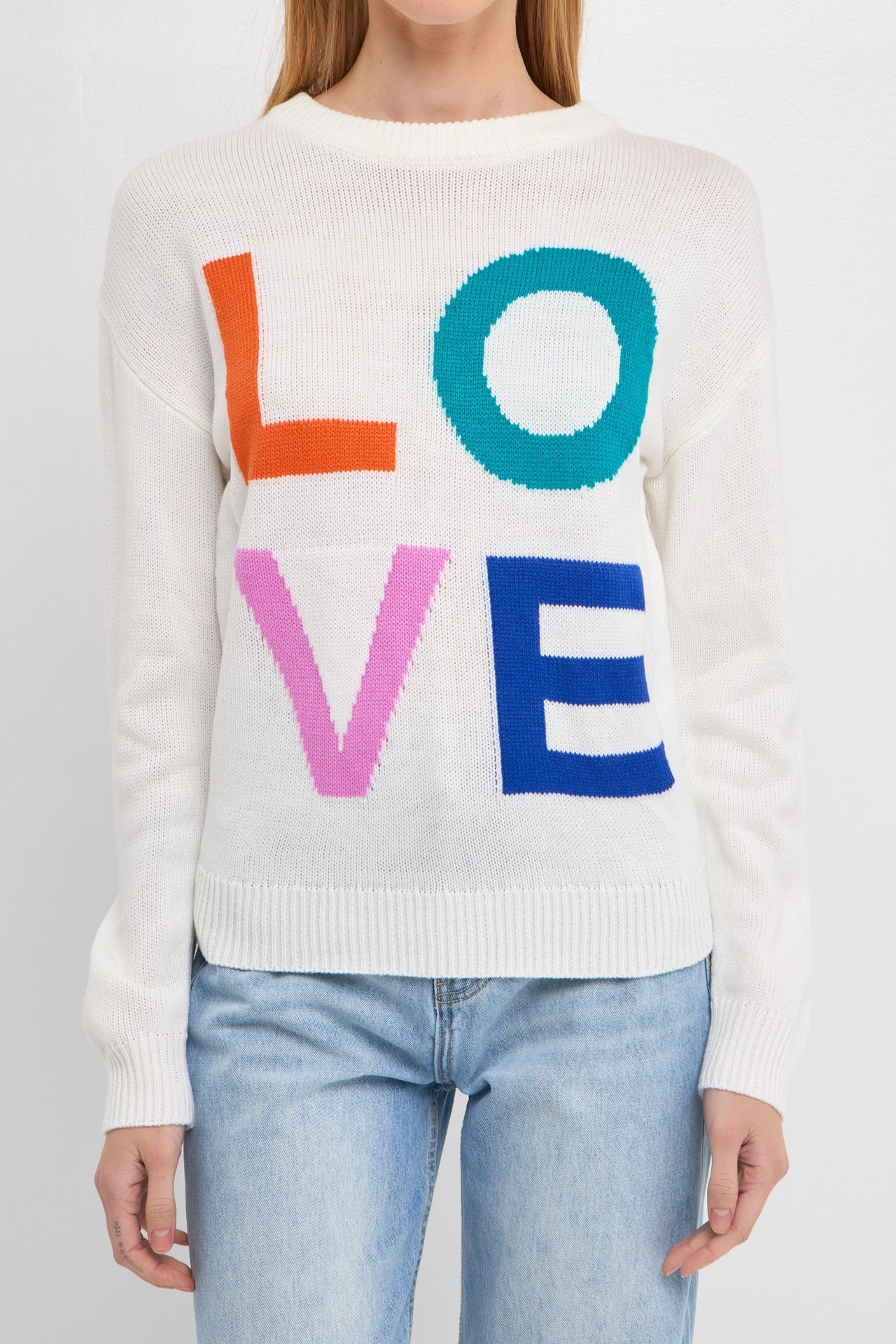 Keep your style cozy and chic this season with our Love Sweater. The love motif on this knit sweater is the perfect touch of detail to keep you looking stylish all day long. With a relaxed fit and round neckline, it's easy to wear and comfortable too. In multi color, it will complement any outfit perfectly.