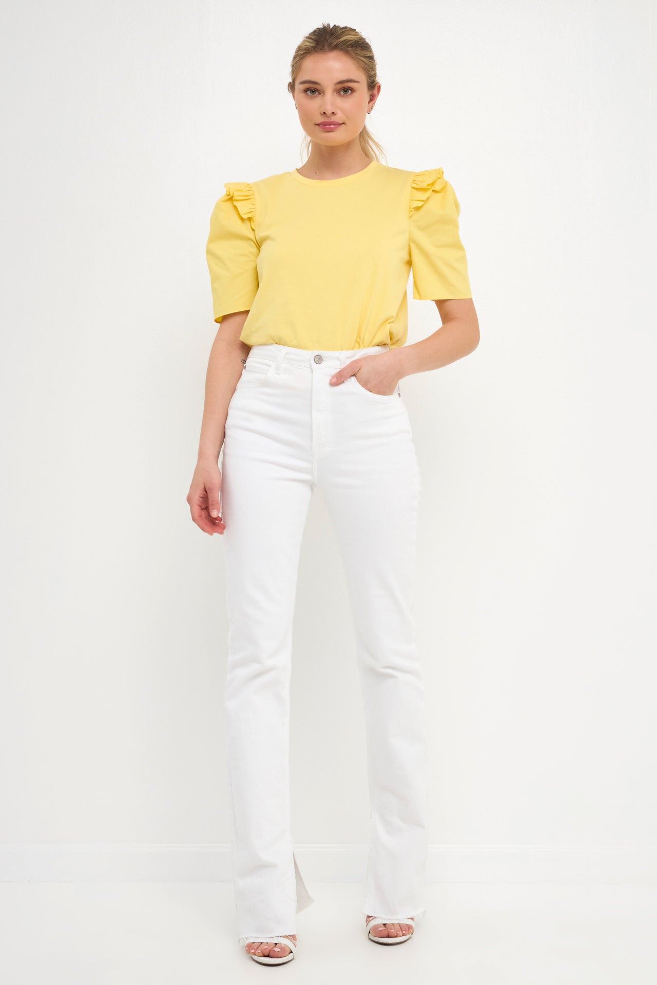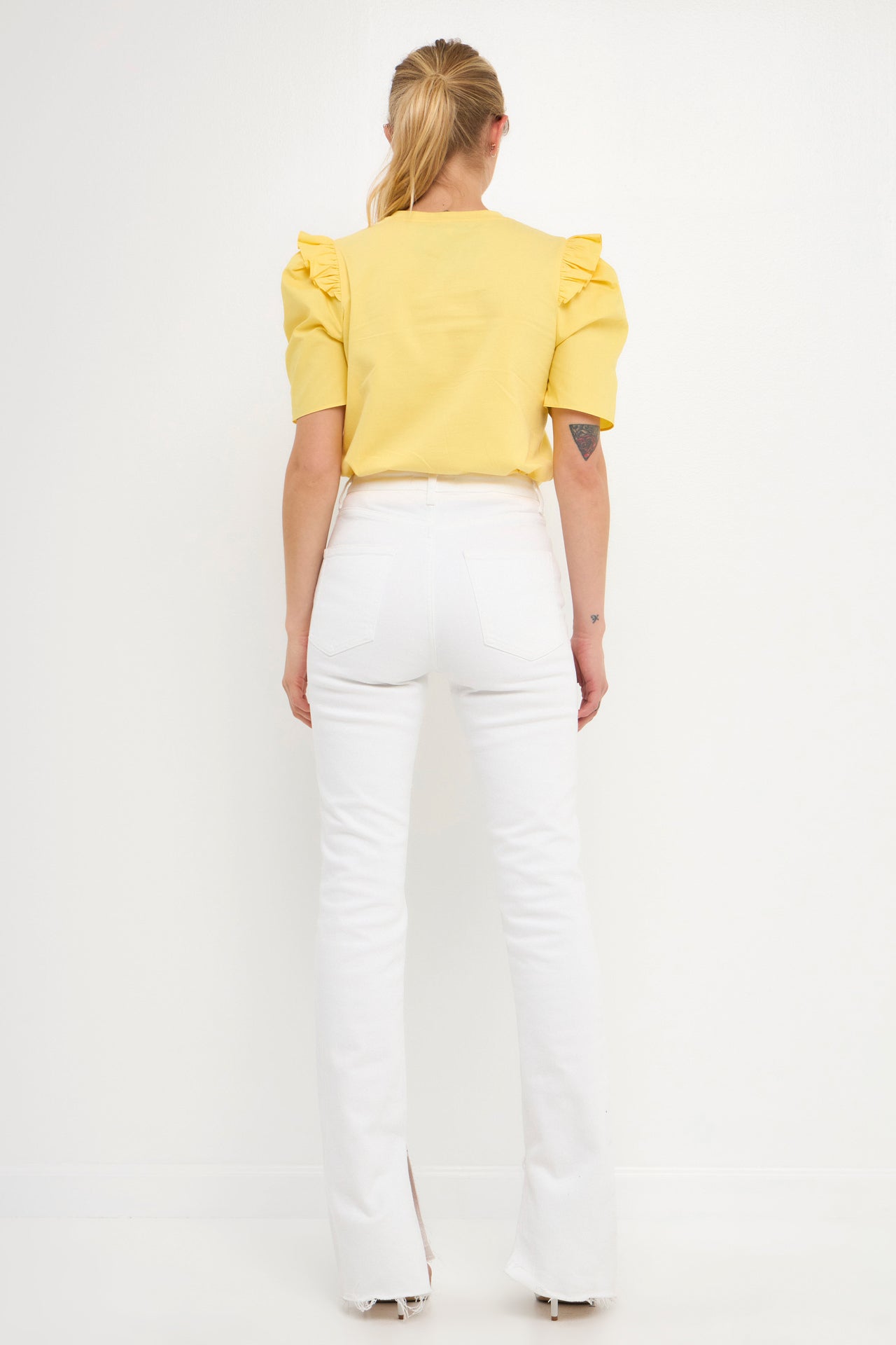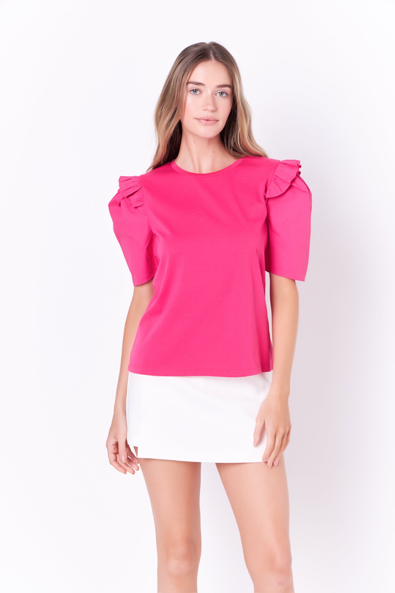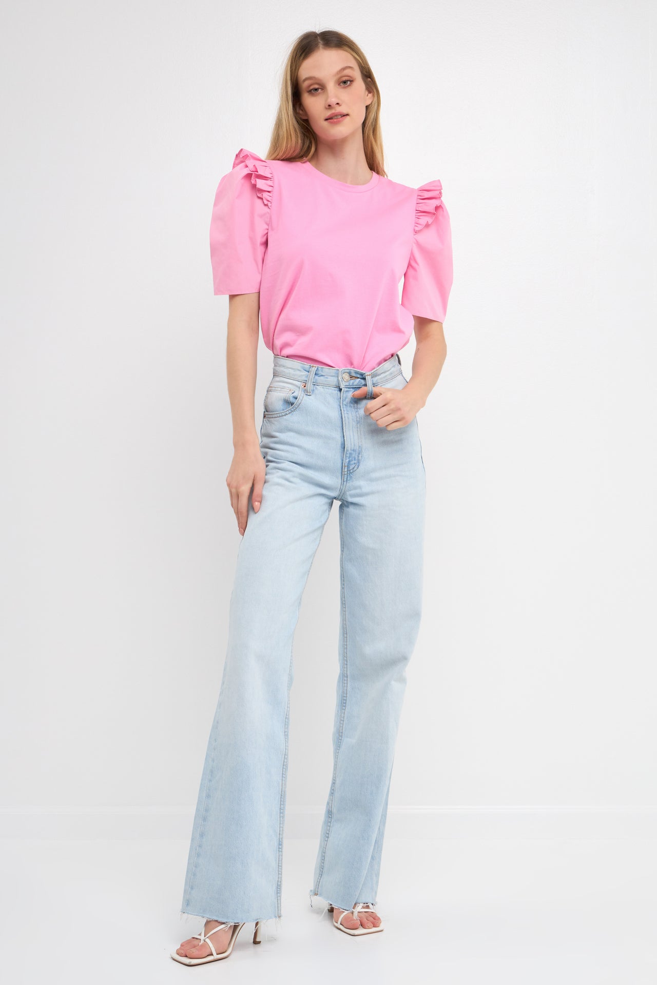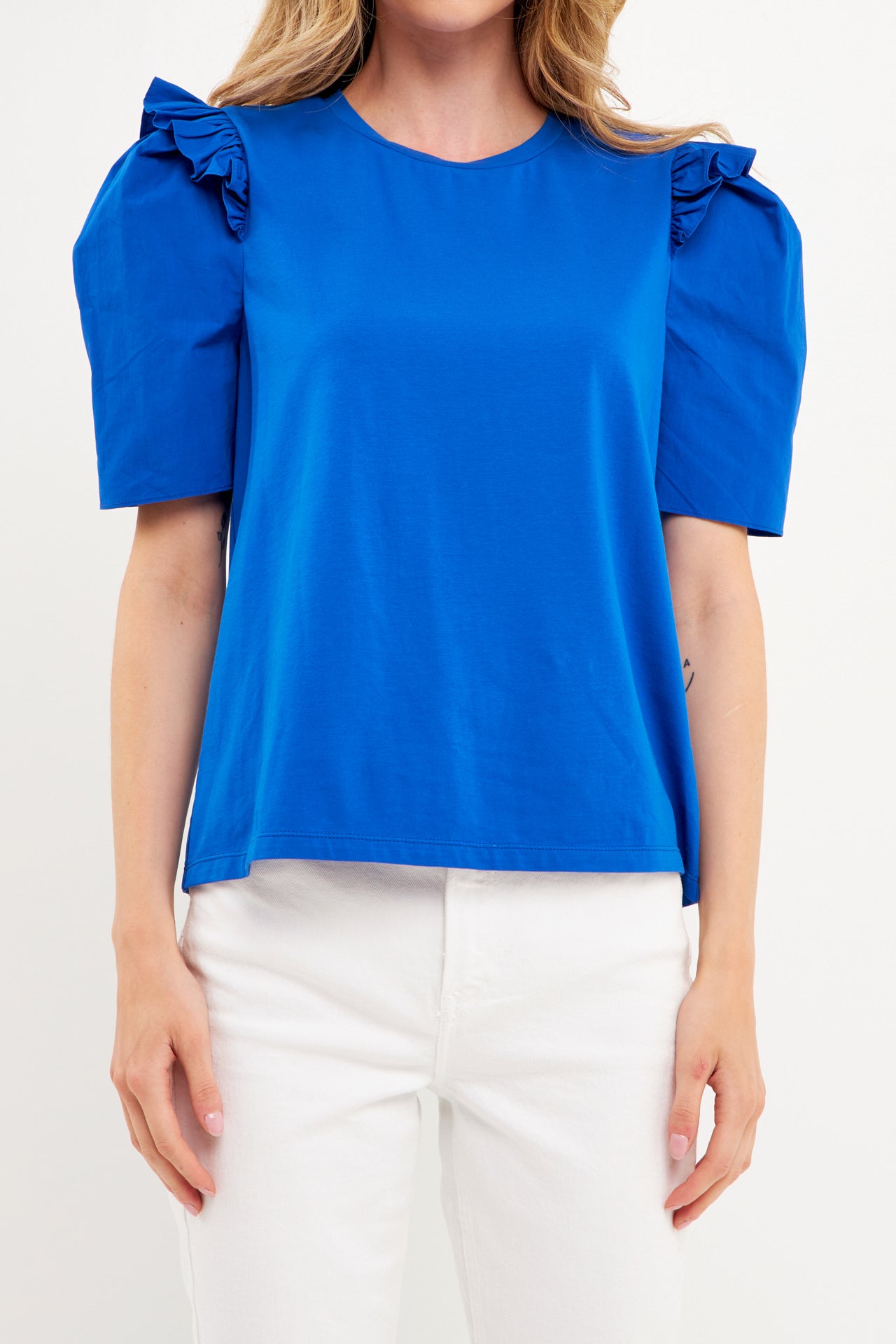 Get ready to turn heads in our Mini Ruffle Puff Sleeve T-Shirt! This must-have top combines playful style with comfort and versatility. The bodice is crafted from a mix of fabrics, with poplin being the star. The puffy short sleeve features a mini ruffle detail, adding a touch of femininity to the classic design. The round neckline complements the overall look, making it a perfect choice for any occasion. From casual days to special events, this top is a wardrobe essential. Optimize your style and stand out from the crowd with our fashionable T-Shirt!