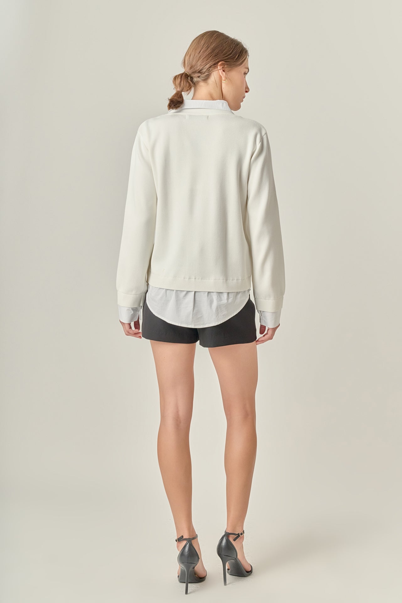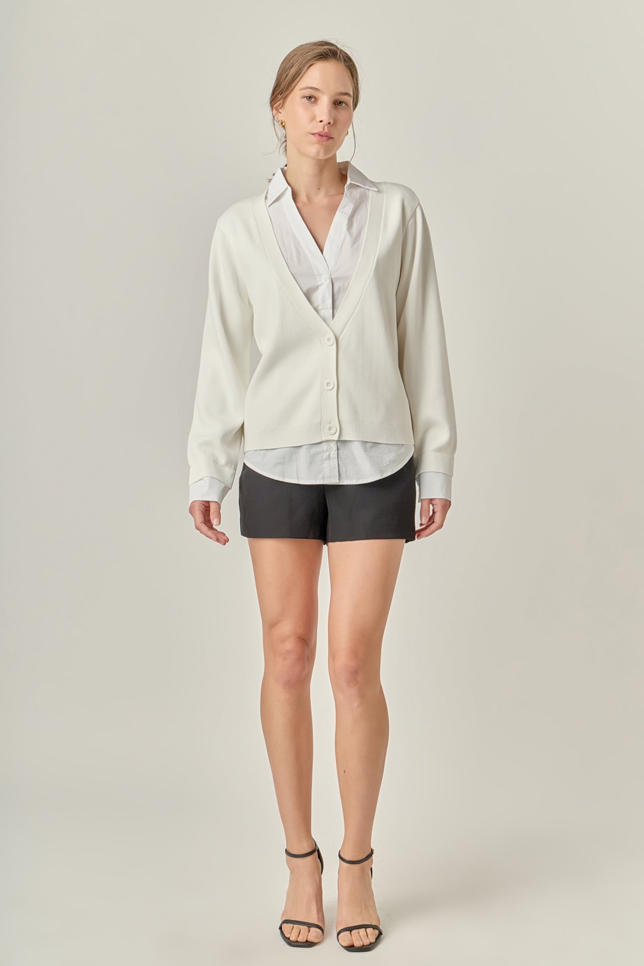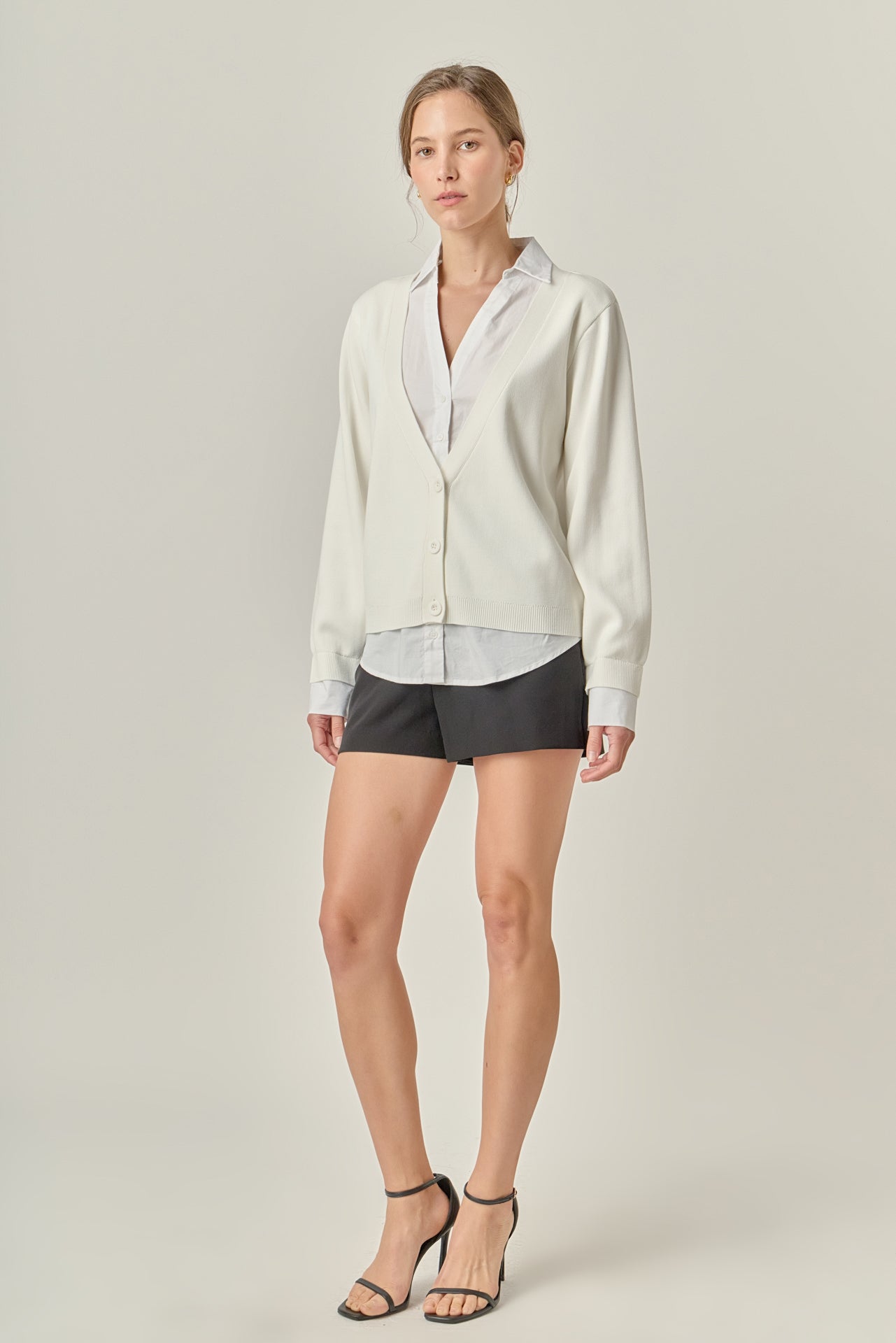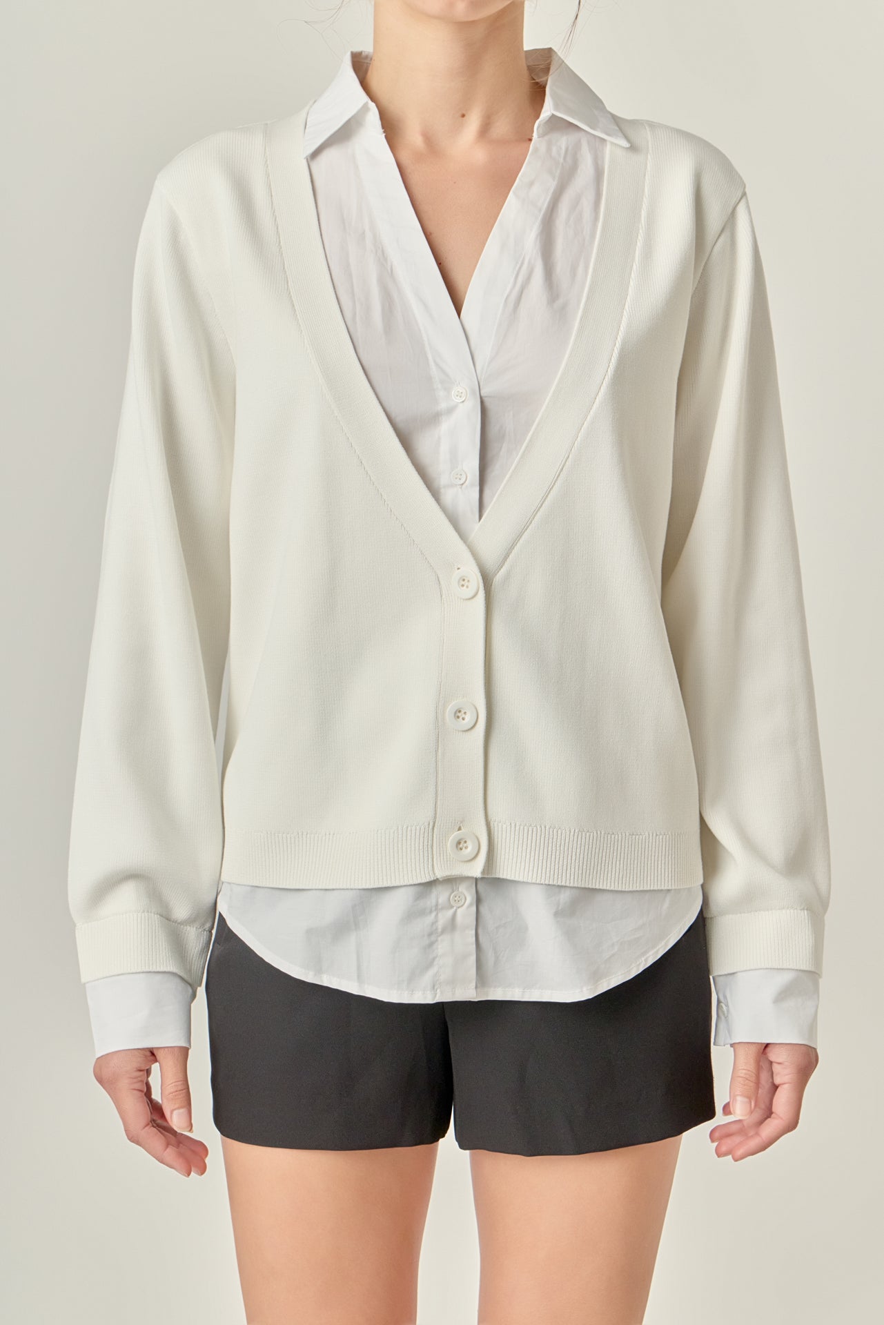 Our Mixed Media Knit Cardigan lets you accomplish the fashionable layered look with ease. Although this style looks like two separate pieces - a button-up shirt and a cardigan - it's actually connected! Both the shirt and cardigan feature functional buttons, so you can style this in many ways. You can leave the cardigan unbuttoned to show more of the shirt, you can roll up the cuffs, or you can unbutton both the shirt and cardigan to show your tank underneath. With all of the possibilities, you'll find new ways to wear this piece throughout the entire year. Pair this style with your favorite skinny jeans for a casual and polished look.
