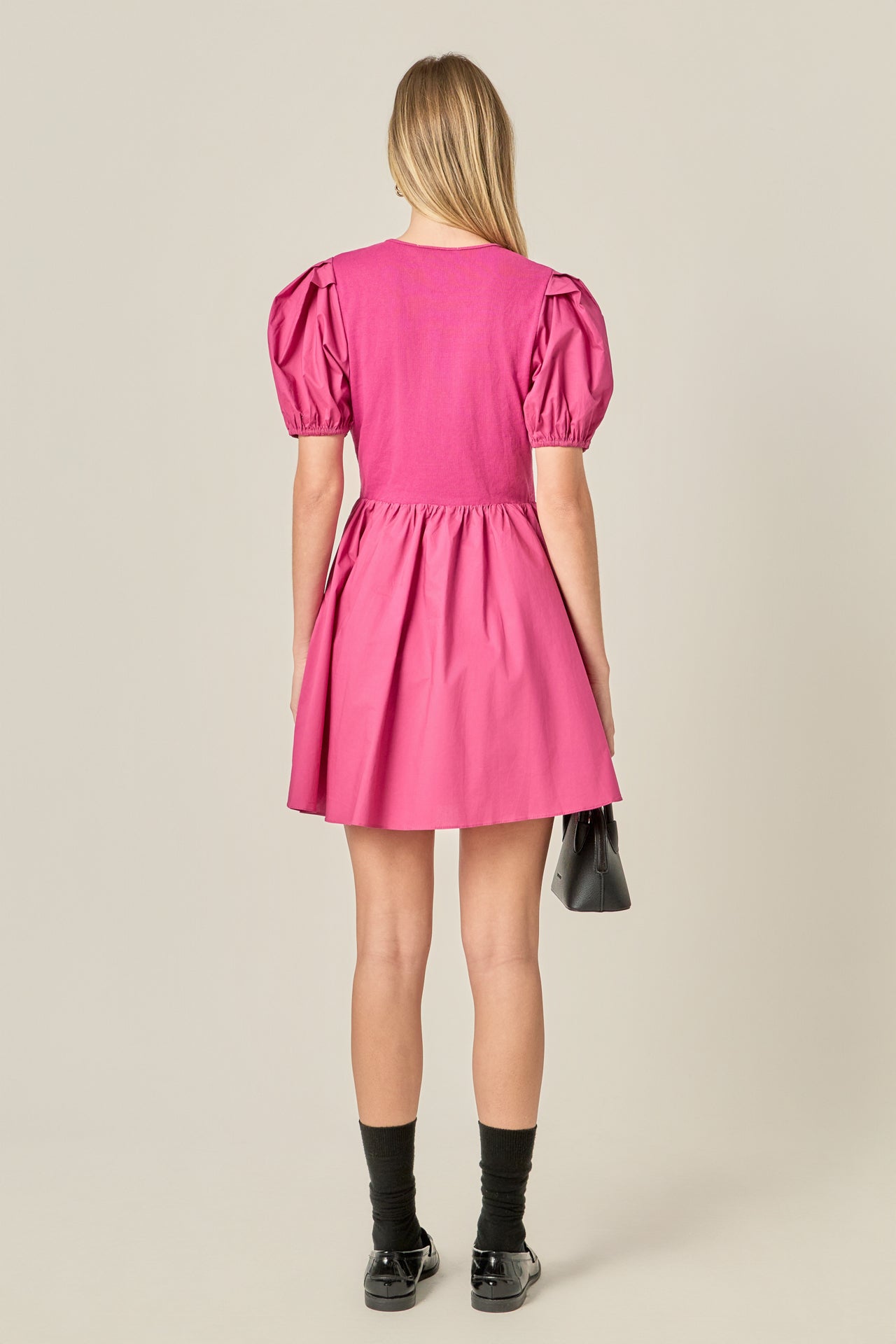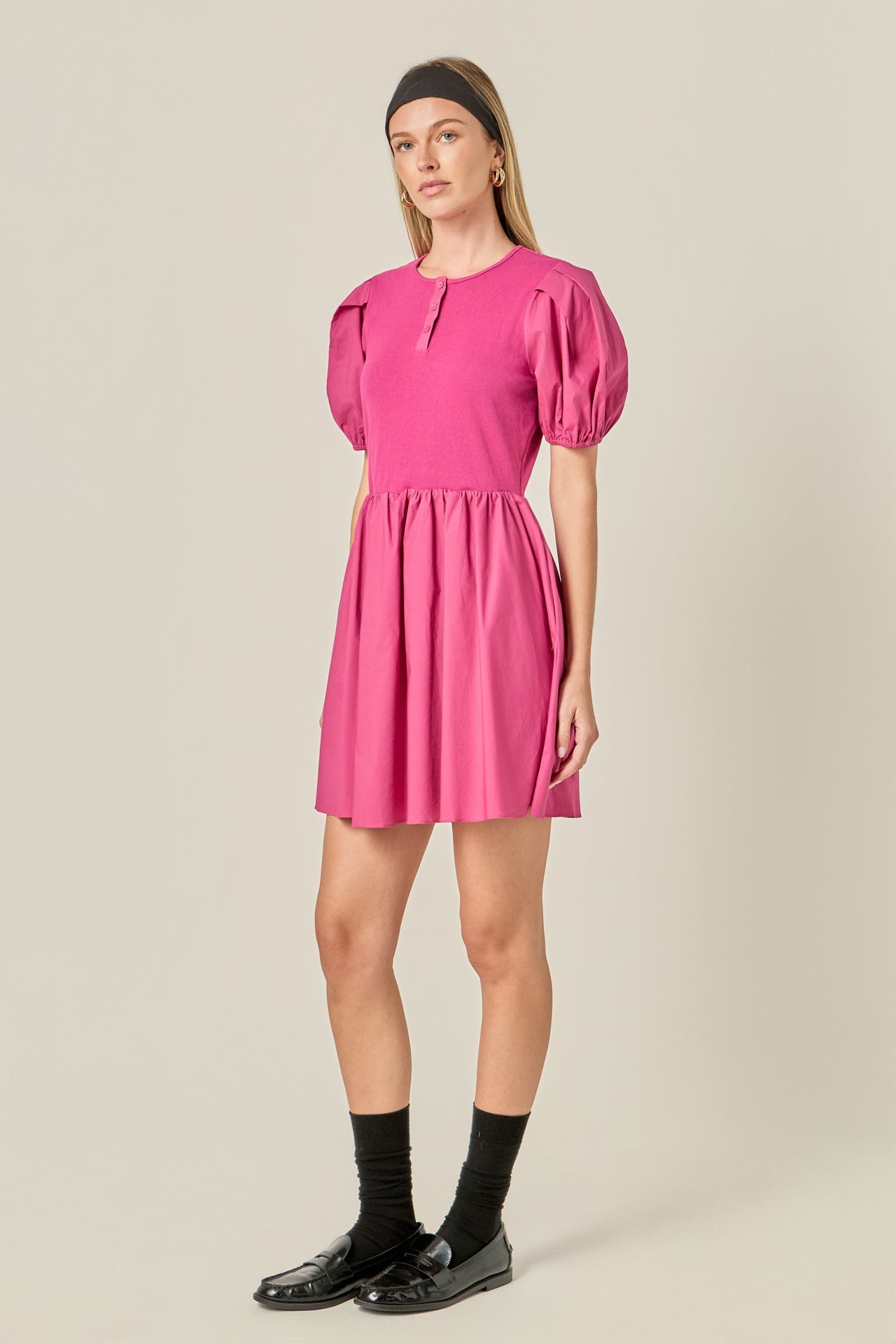 This versatile mini dress is perfect for any day or night event. With a mixed media design, this dress is sure to turn heads. With a rib bodice and contrast sleeves and skirt, this dress is sure to make a statement. Featuring a henley placket and pleated puff sleeves, this dress is stylish and comfortable.