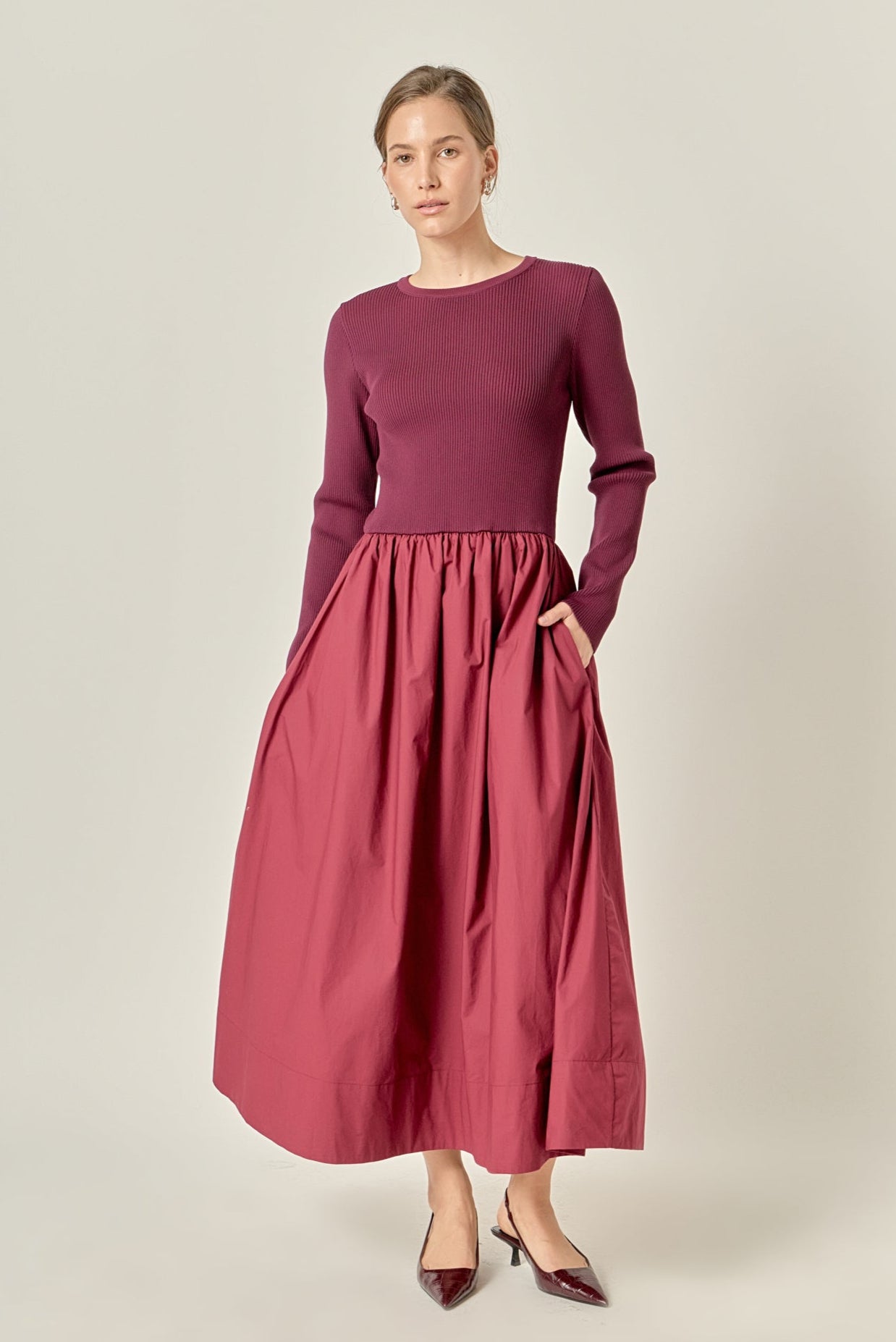 Elevate your wardrobe with The Juliette Mixed Media Maxi Dress, a refined blend of textures designed for modern sophistication. Featuring a fitted rib-knit bodice and a flowing poplin skirt, this dress creates a flattering silhouette that moves effortlessly with you. The long sleeves and full-length design make it perfect for cooler seasons, while the clean, minimal aesthetic allows for endless styling possibilities. Pair it with heels for a polished evening look or flats for chic daytime ease. A versatile piece that brings both elegance and comfort to any occasion.