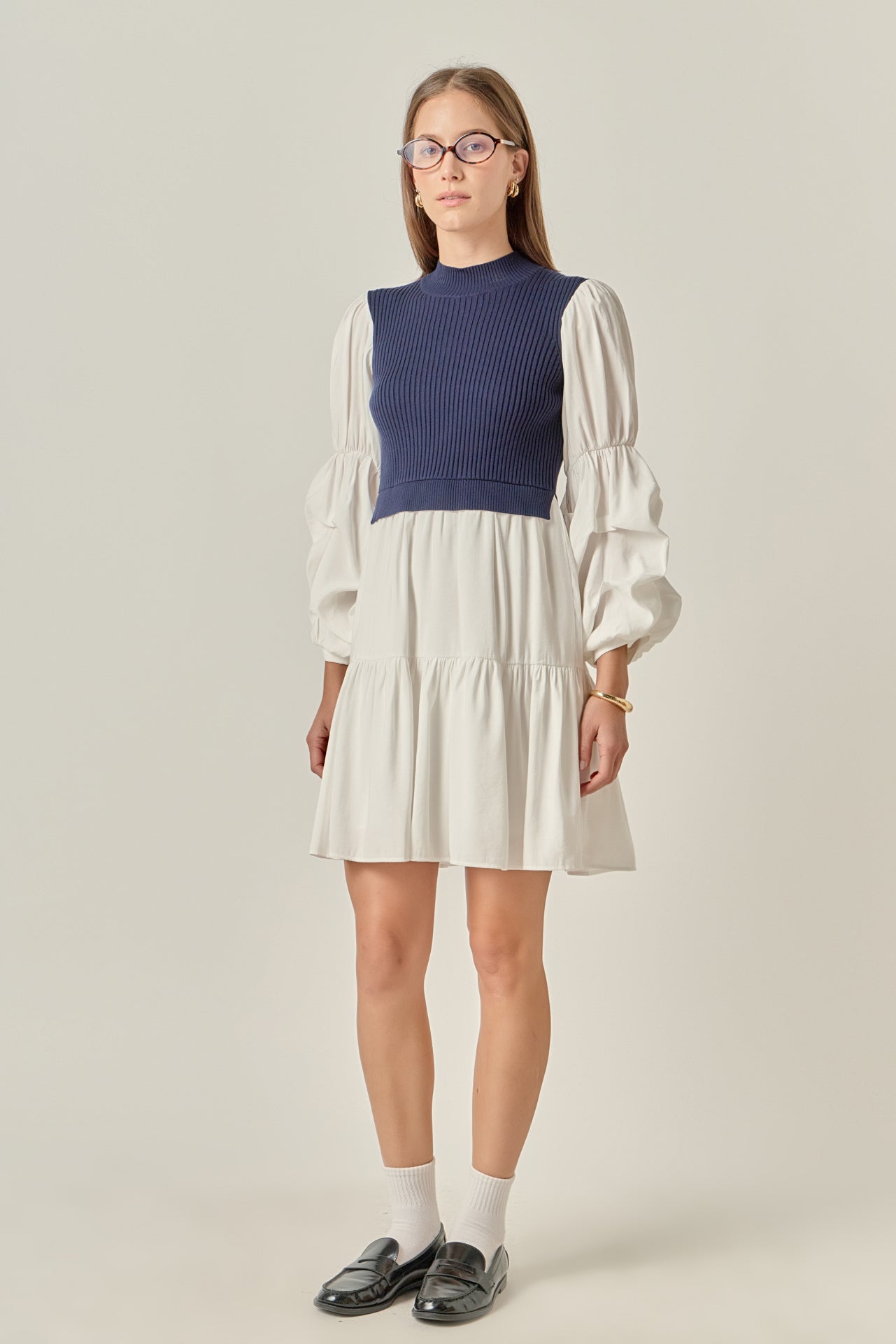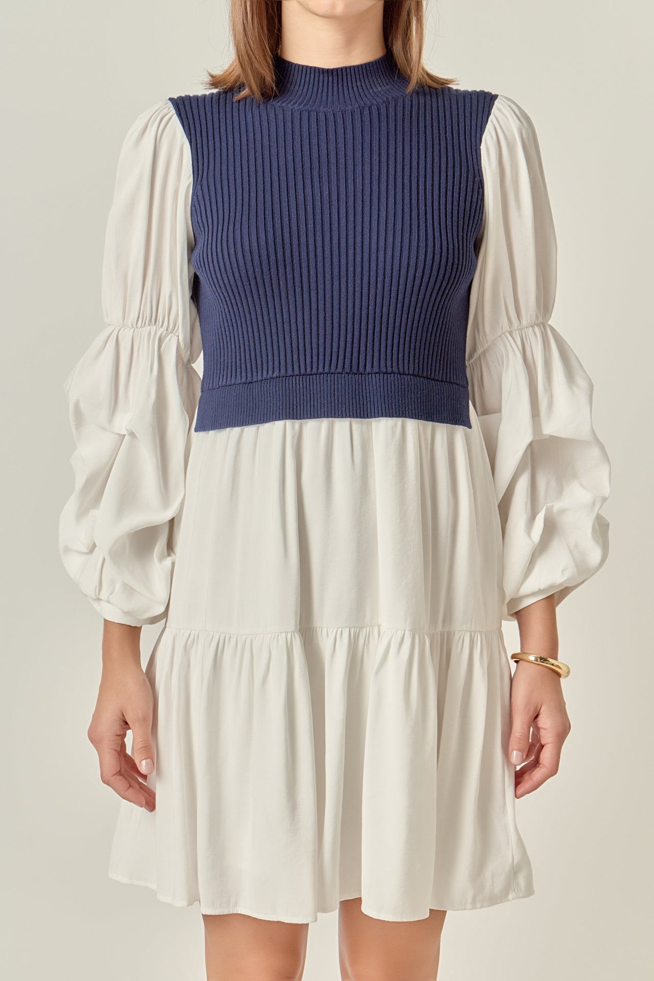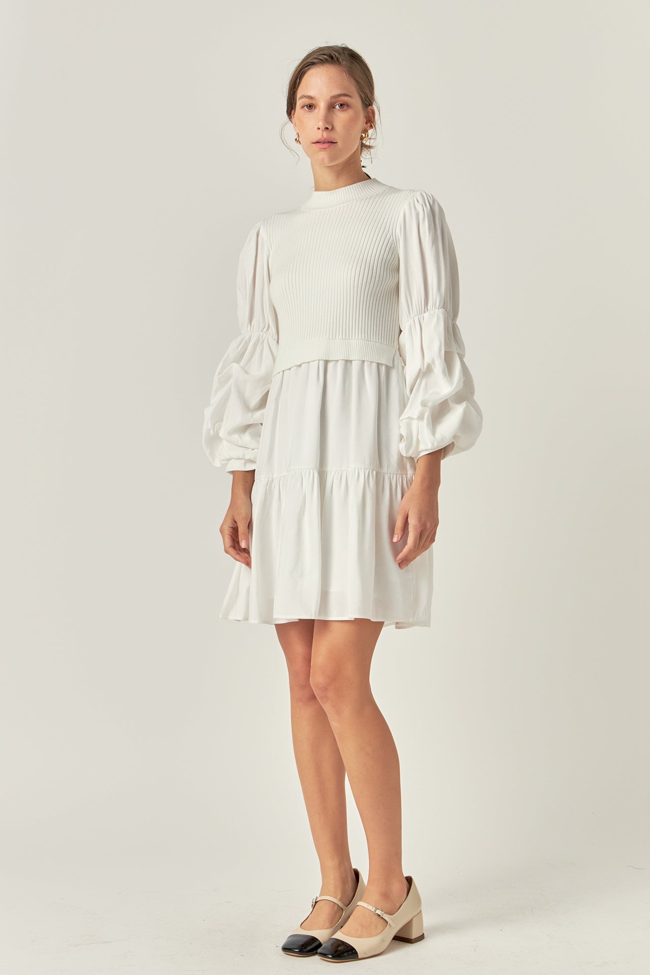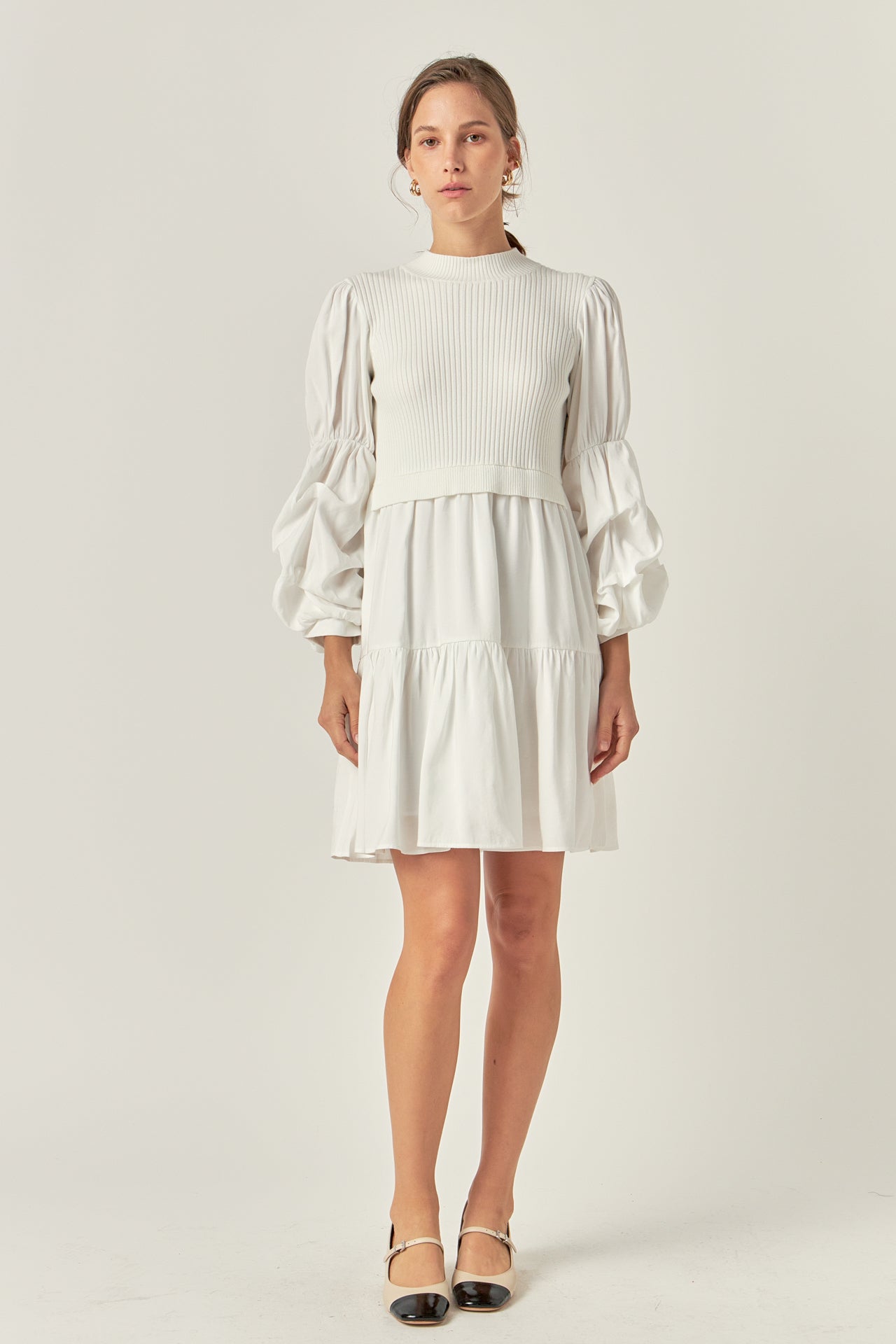 This unique mini dress combines modern elements with classic sophistication. Featuring a chic mock neck and a fitted knit bodice, it offers a structured yet comfortable feel. The voluminous pleated long sleeves add a romantic touch, while the contrast between the soft bodice and flowing fabric skirt creates a balanced silhouette. Perfect for transitional weather, this dress can be effortlessly styled with tall boots for an elevated, fashion-forward look.
