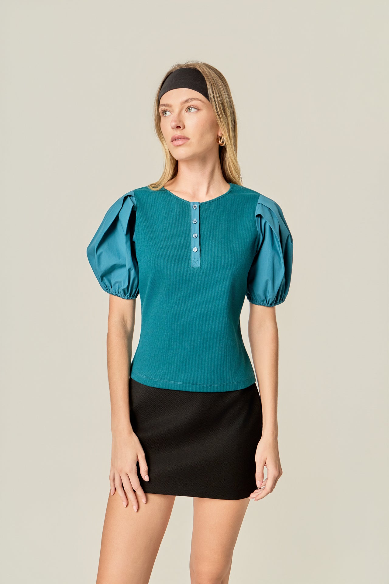 With a mixed media knit bodice and contrast puff sleeves, this top is sure to turn heads. The pleated puff sleeves give it an extra pop of personality, while the henley placket makes it easy to wear. Whether you're dressing up or dressing down, this top is perfect for any occasion.