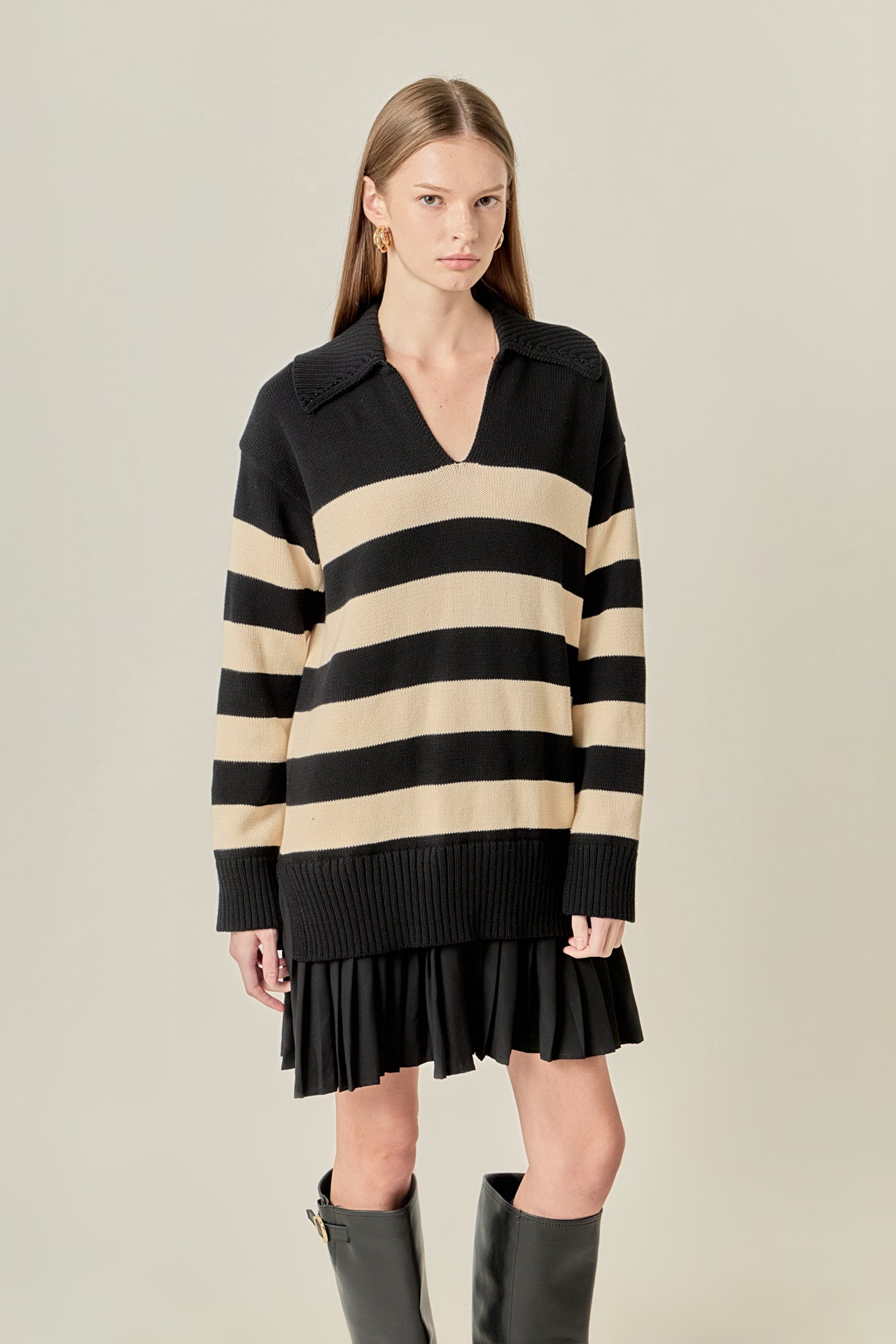 Fashion meets warmth with this Mixed Media Stripe Pleated Mini Dress. Its mini length combined with its relaxed fit make it perfect for any occasion and the pleated skirt along with the striped sweater offers stylish fashion that is sure to turn heads. Whether you want to look great at work or stand out at a party this dress is sure to make a statement. Look good and feel great with this dress today.