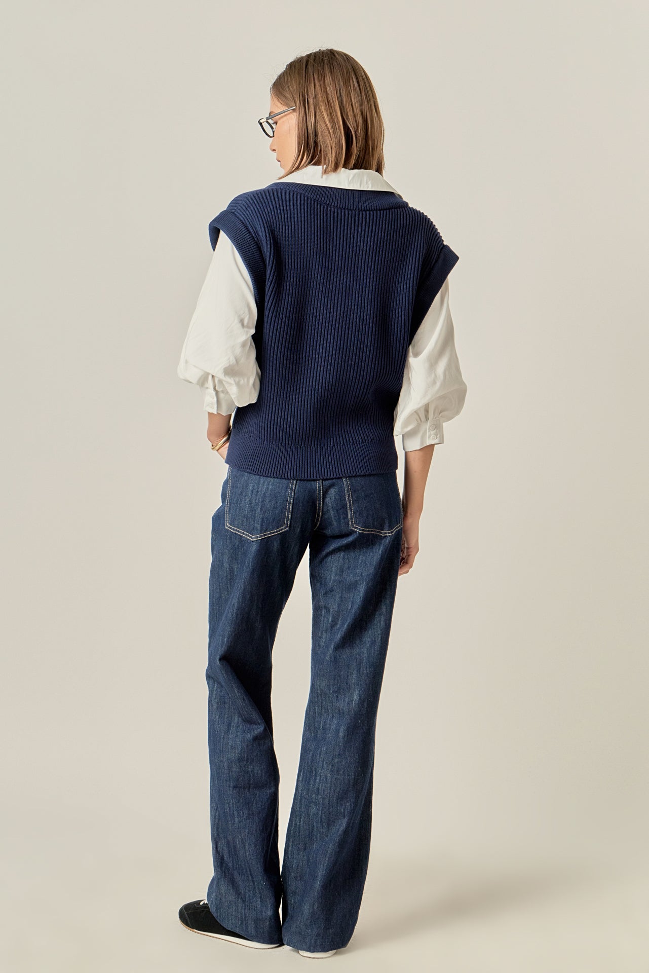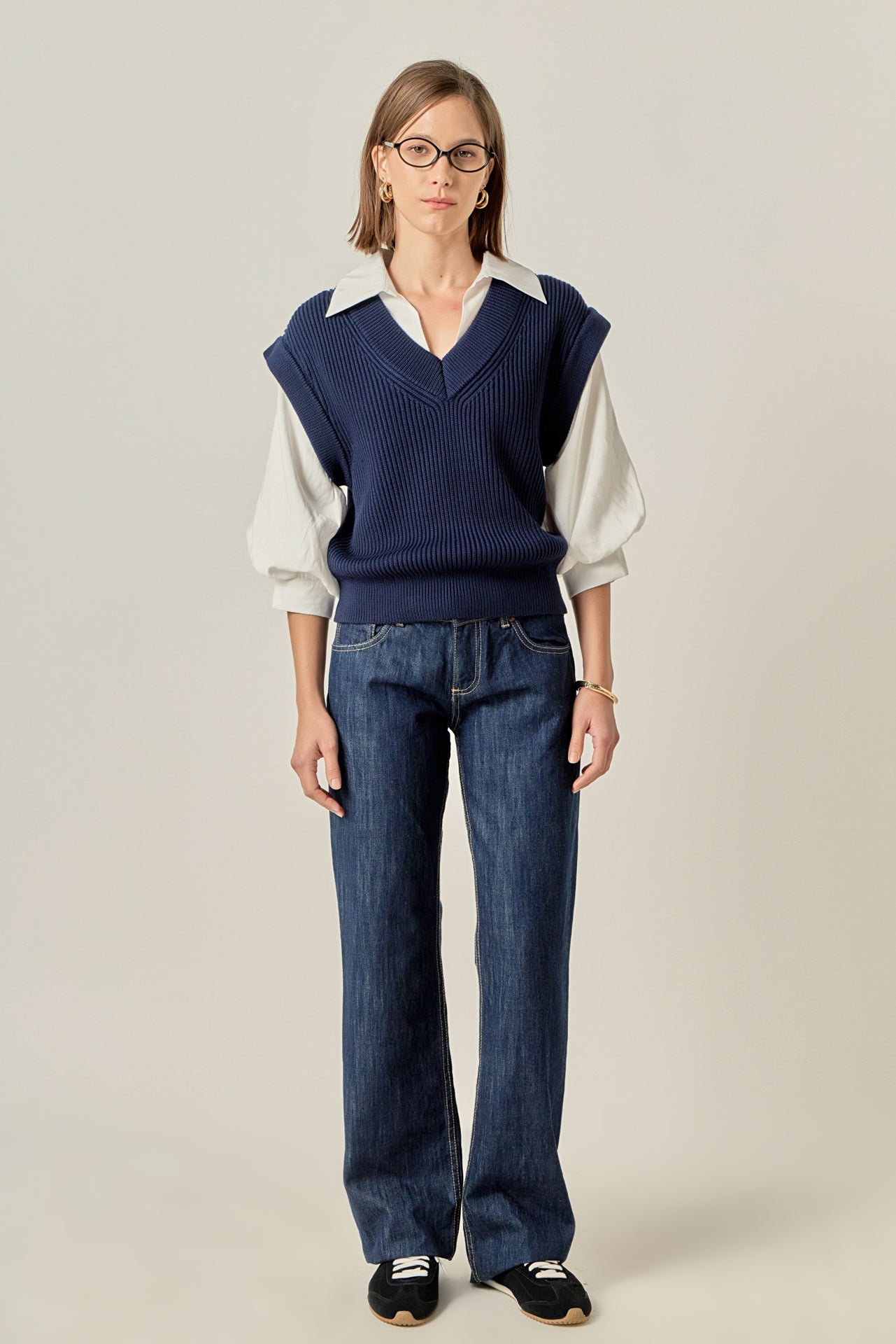 Elevate your layering game with our Mixed Media Knit Vest Top, designed to give you a polished, pre-styled look. Featuring a crisp collared shirt with voluminous sleeves paired seamlessly with a ribbed knit vest overlay, this piece blends structure and coziness in one. The deep V-neckline of the vest adds a modern edge, while the shirt’s lightweight fabric keeps it comfortable and versatile. Perfect for work, weekends, or smart-casual outings, this layered design takes the guesswork out of styling..