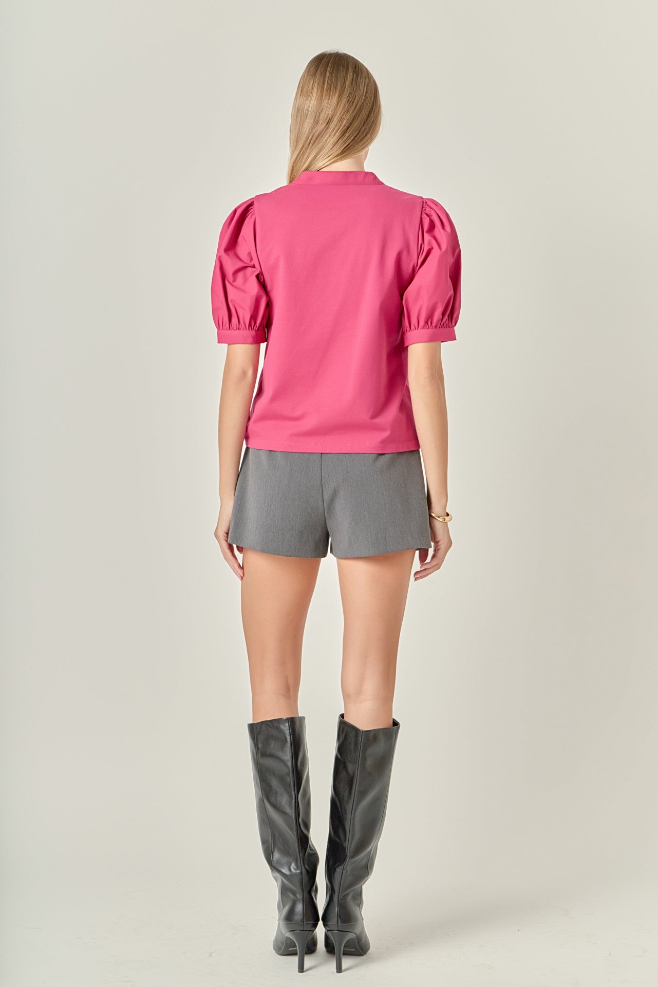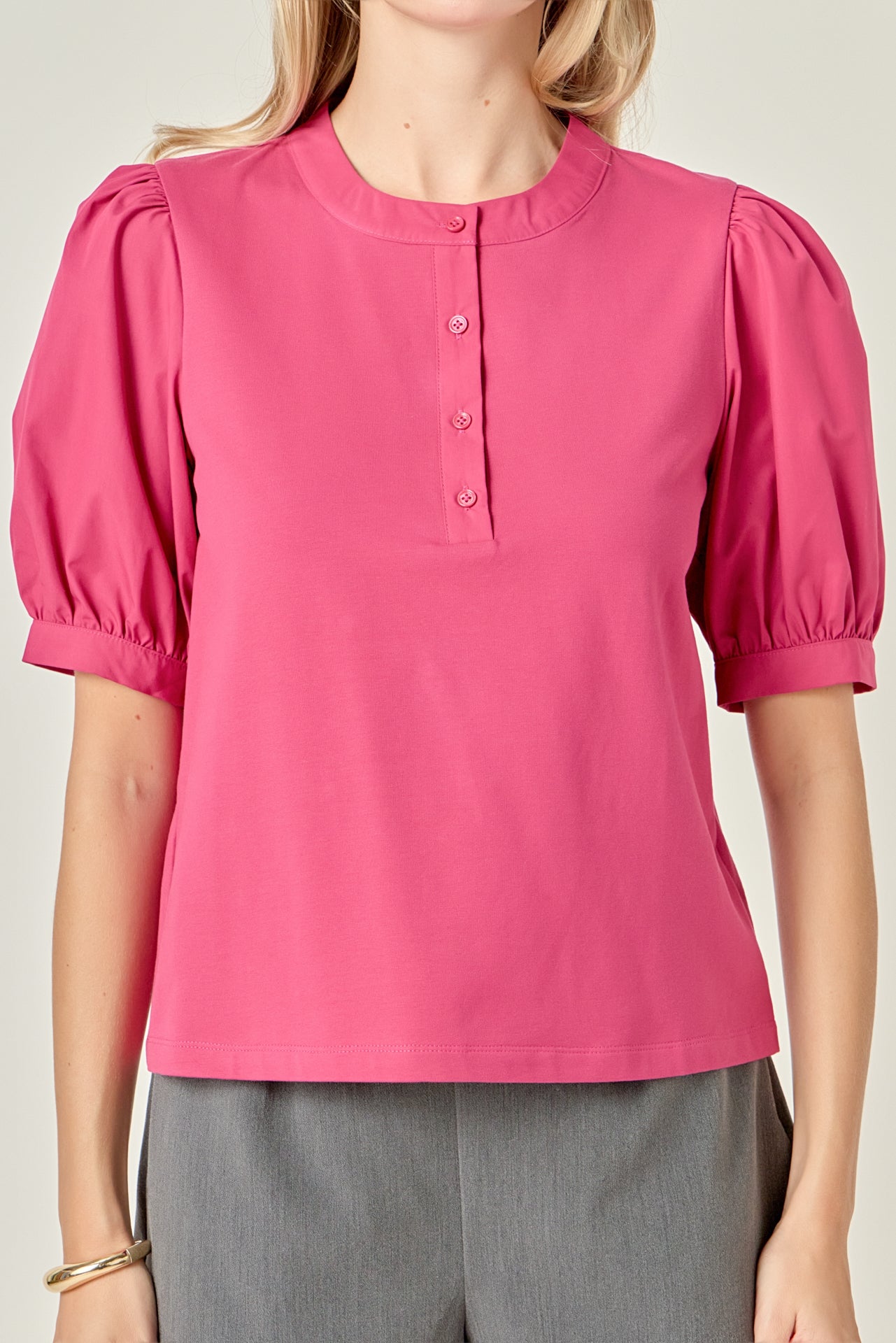 This Mixed Media Top is perfect for any occasion. It features contrast fabric at the placket and sleeves puffy short sleeves and a stand collar with placket. The center button closure completes the look ensuring you look stylish and feel comfortable. With its unique design this Mixed Media Top is sure to turn heads. Get yours now and showcase your style!